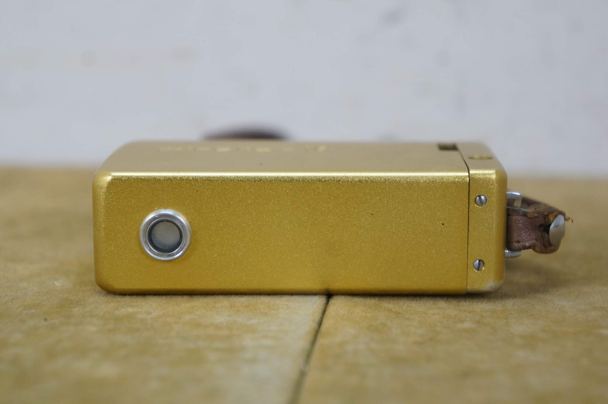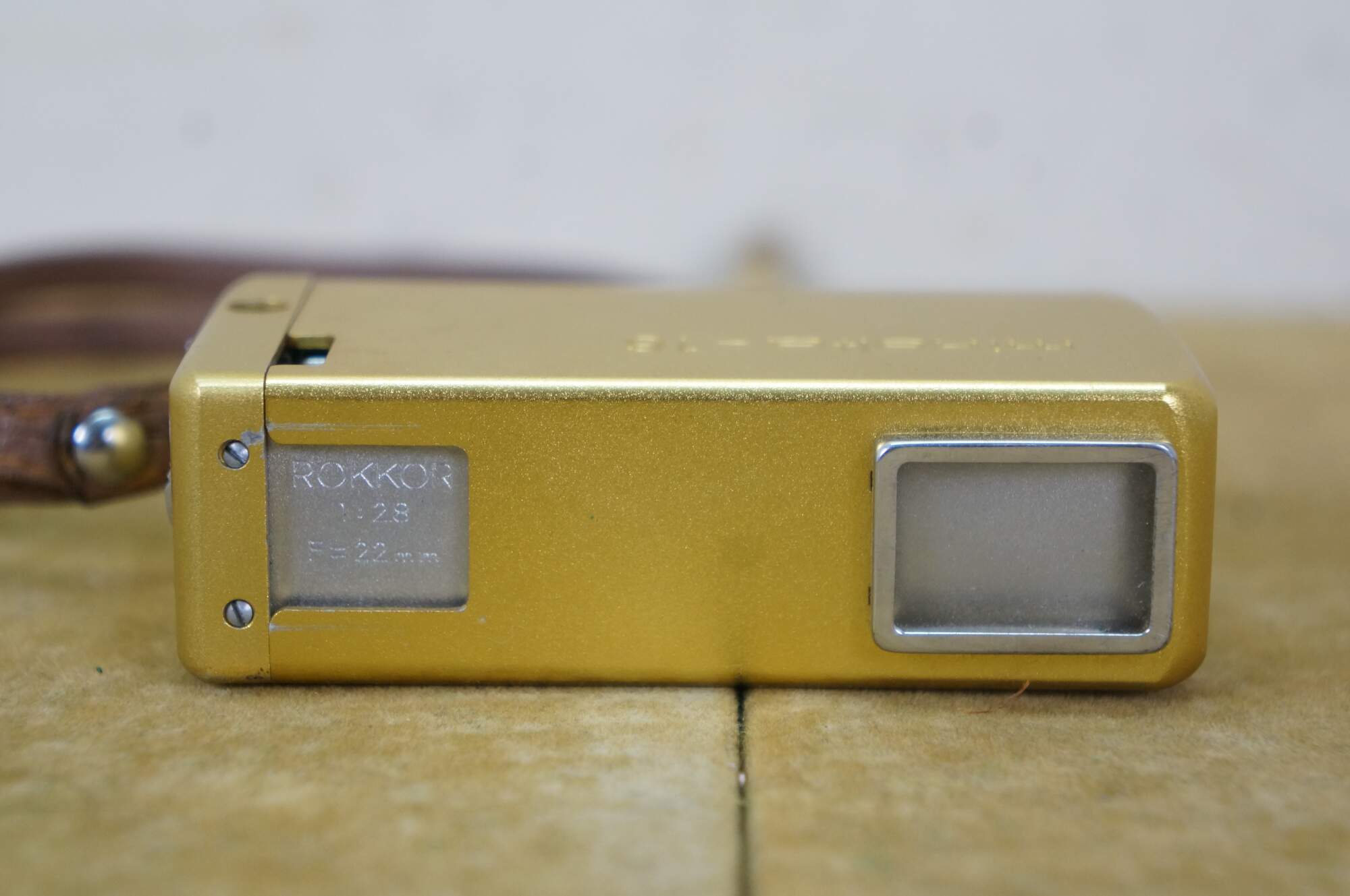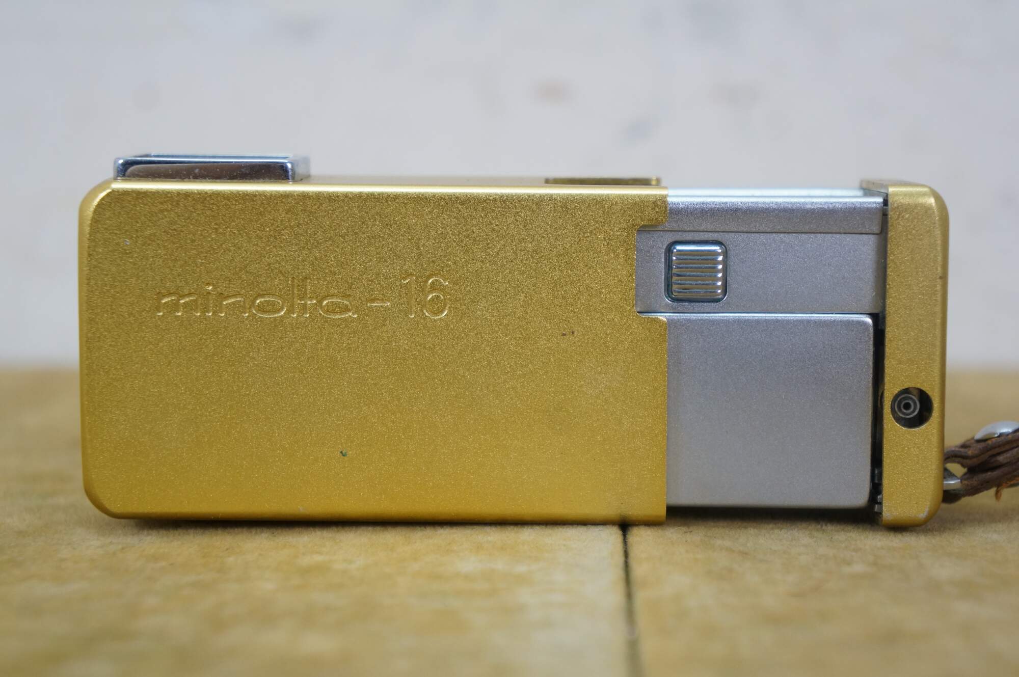 1960's Minolta 16 II subminiature "spy" camera - gold finish with brown leather case and wrist strap. 16mm film. Rokkor 1:28 F=22mm lens. Serial Number 466797. Chiyoda Kogaku - Japan. Includes 2 spare lenses and Owner's Manual.