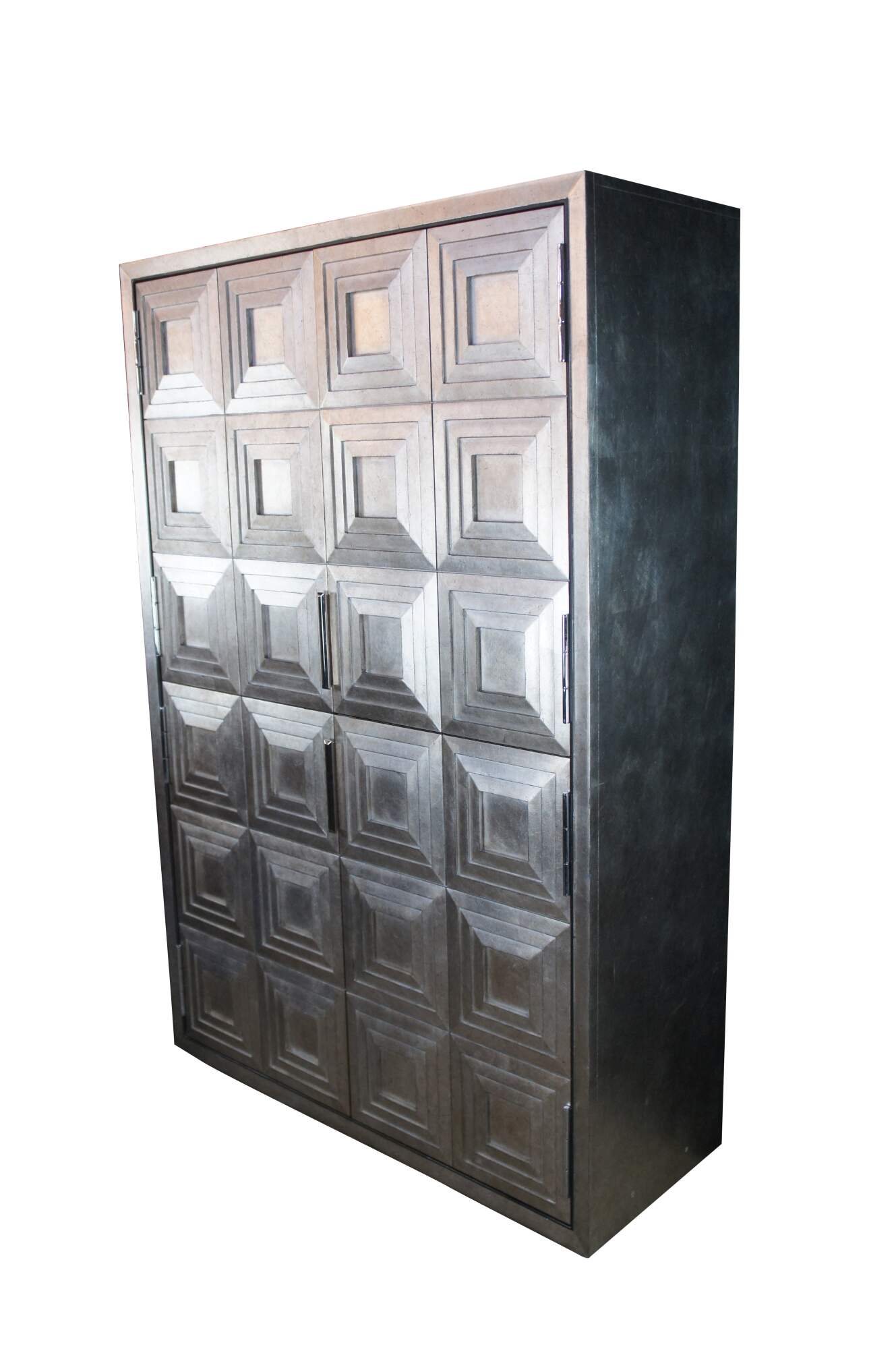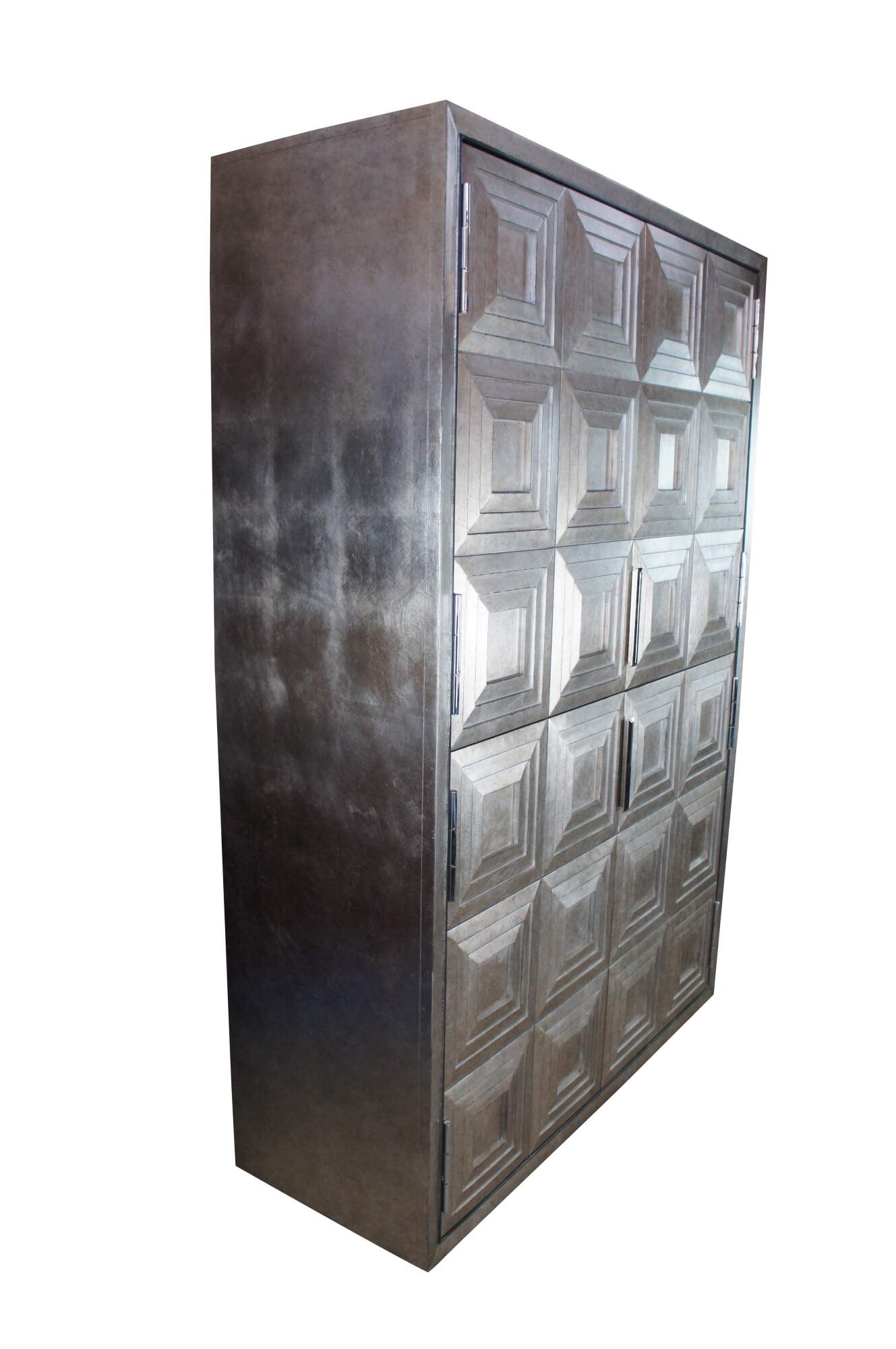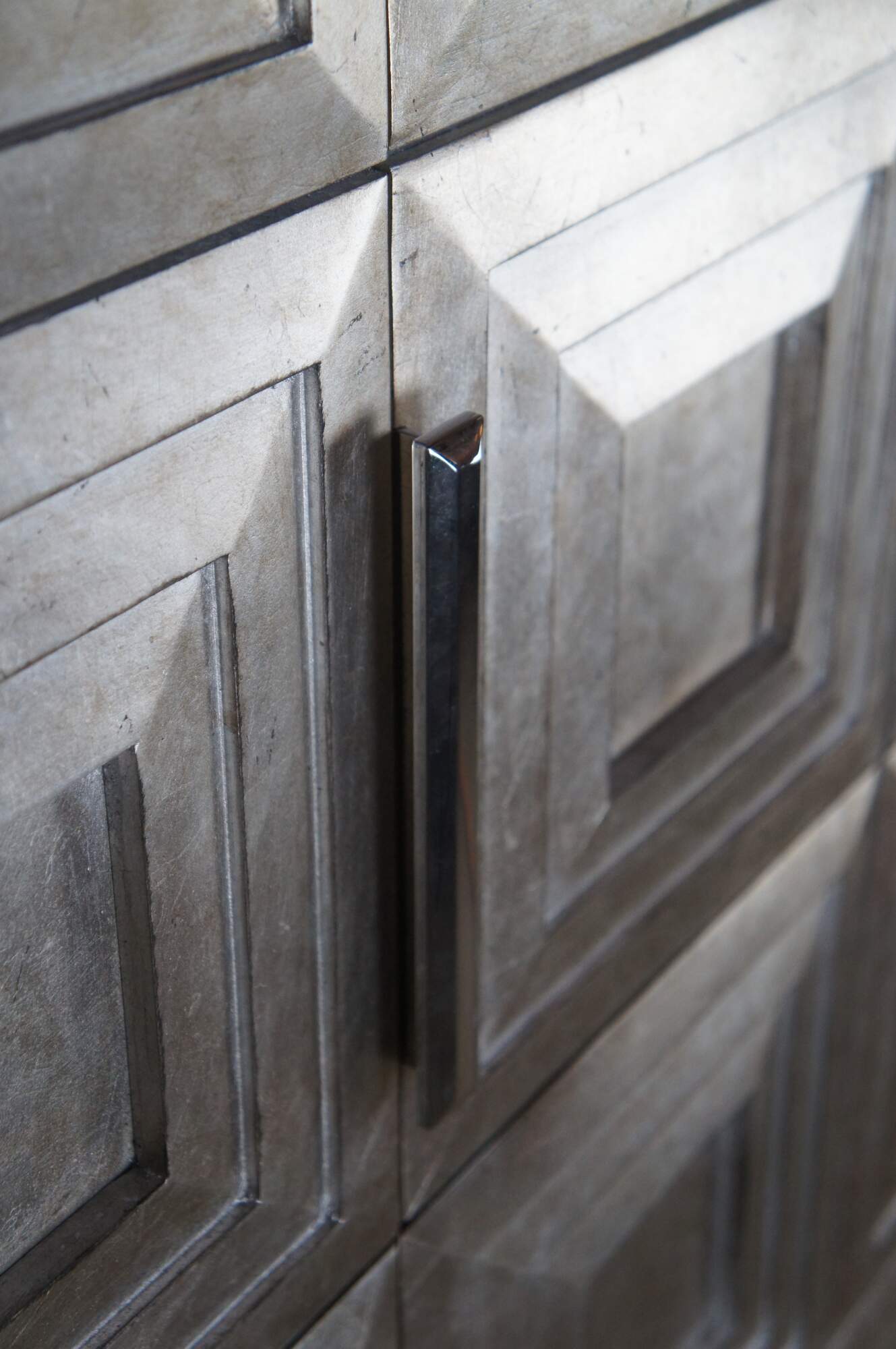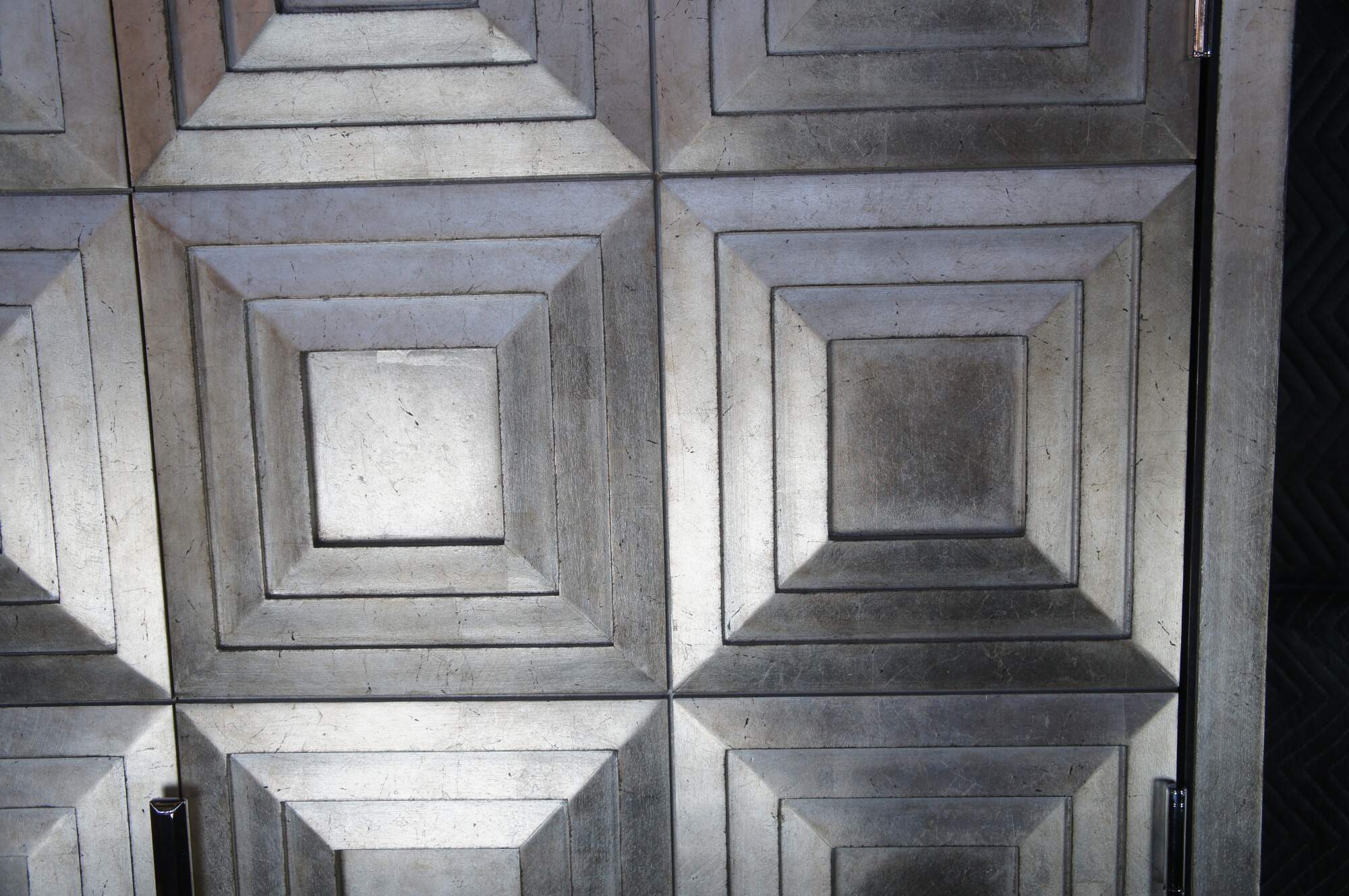 Each of the four doors feature six step-down panels in hand-applied silver leaf. The top pair open to reveal two adjustable or removable shelves and a lower stationary shelf with removable shirt partitions between in a contrasting gray interior. The lower pair of doors reveal three open storage compartments with removable center partition and drop-front drawer for media or keyboard access. On the lower left are three adjustable shelves which may be removed. On the right are two adjustable shelves.
