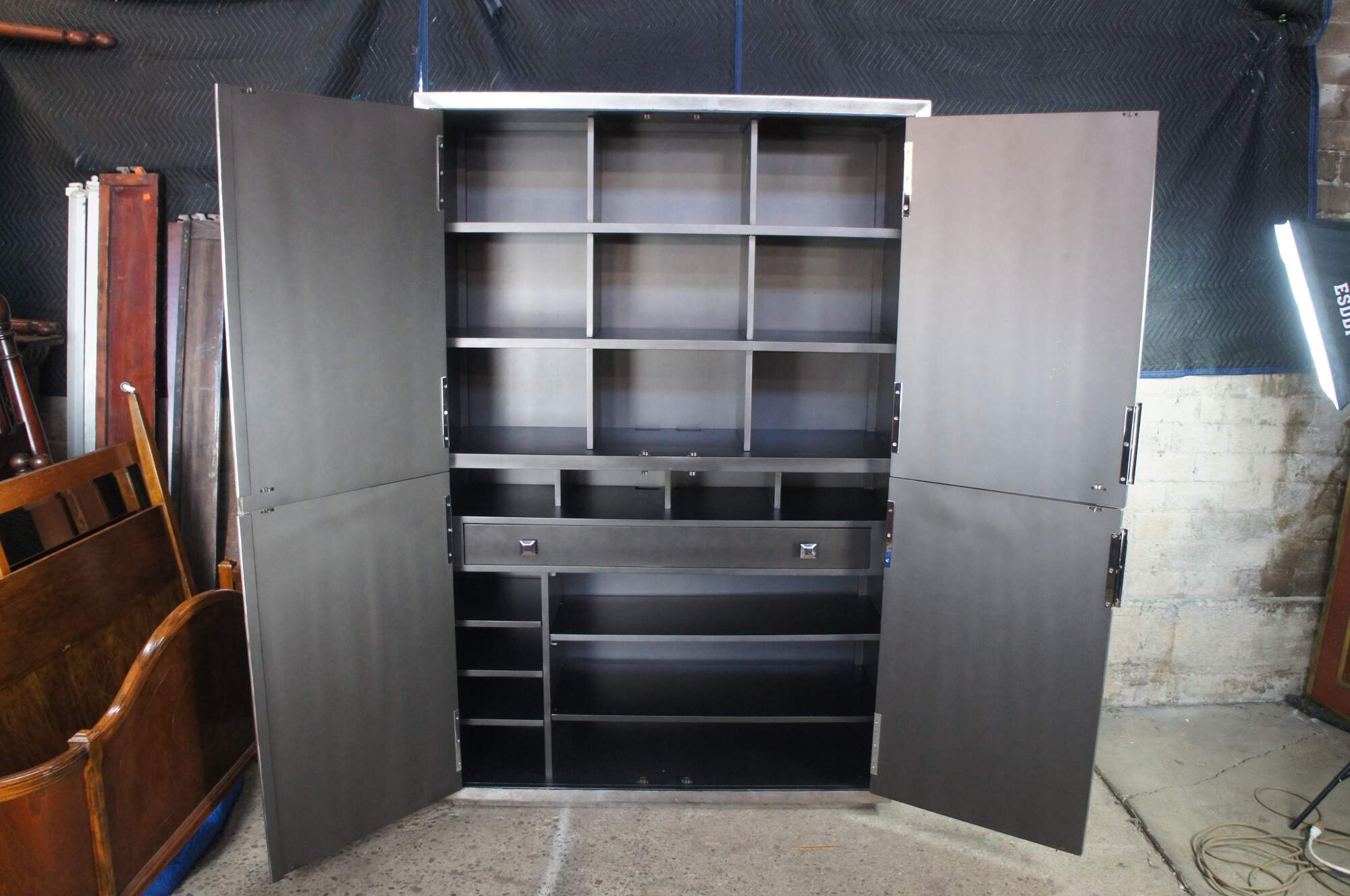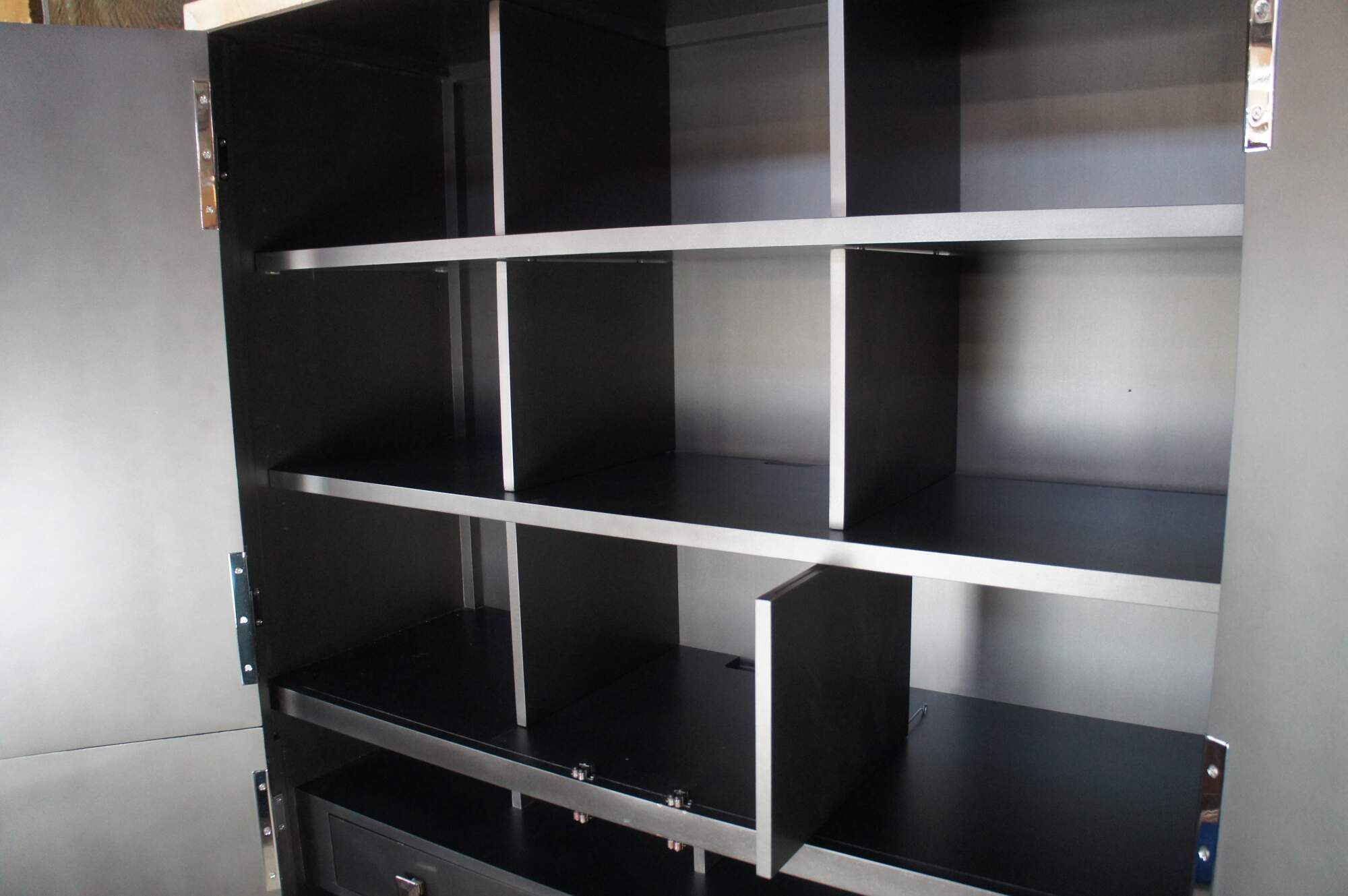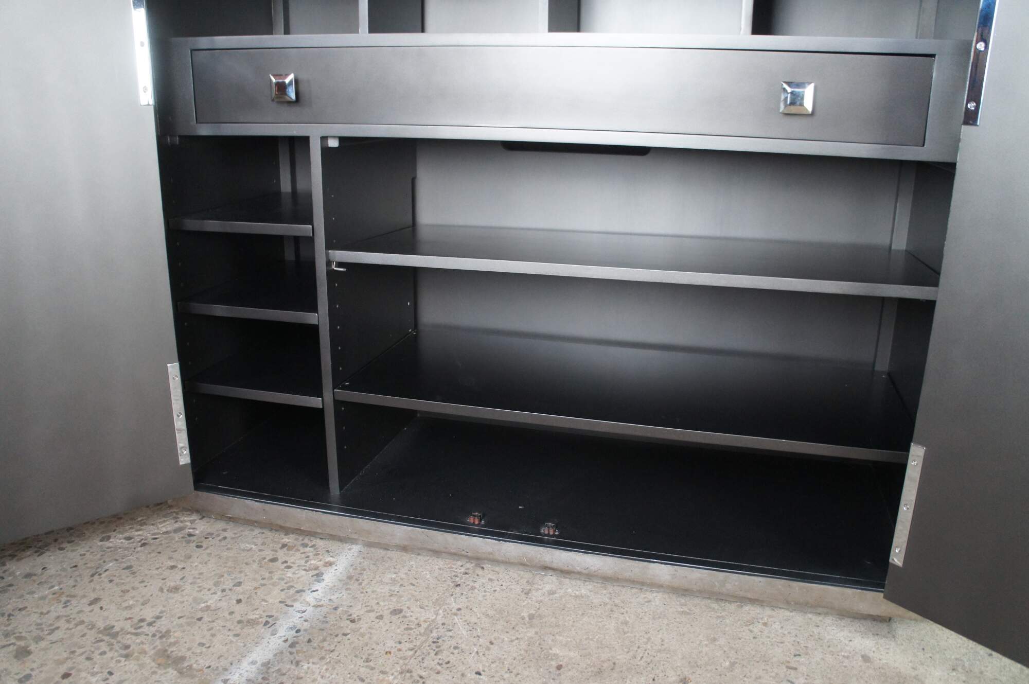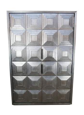 Each of the four doors feature six step-down panels in hand-applied silver leaf. The top pair open to reveal two adjustable or removable shelves and a lower stationary shelf with removable shirt partitions between in a contrasting gray interior. The lower pair of doors reveal three open storage compartments with removable center partition and drop-front drawer for media or keyboard access. On the lower left are three adjustable shelves which may be removed. On the right are two adjustable shelves.