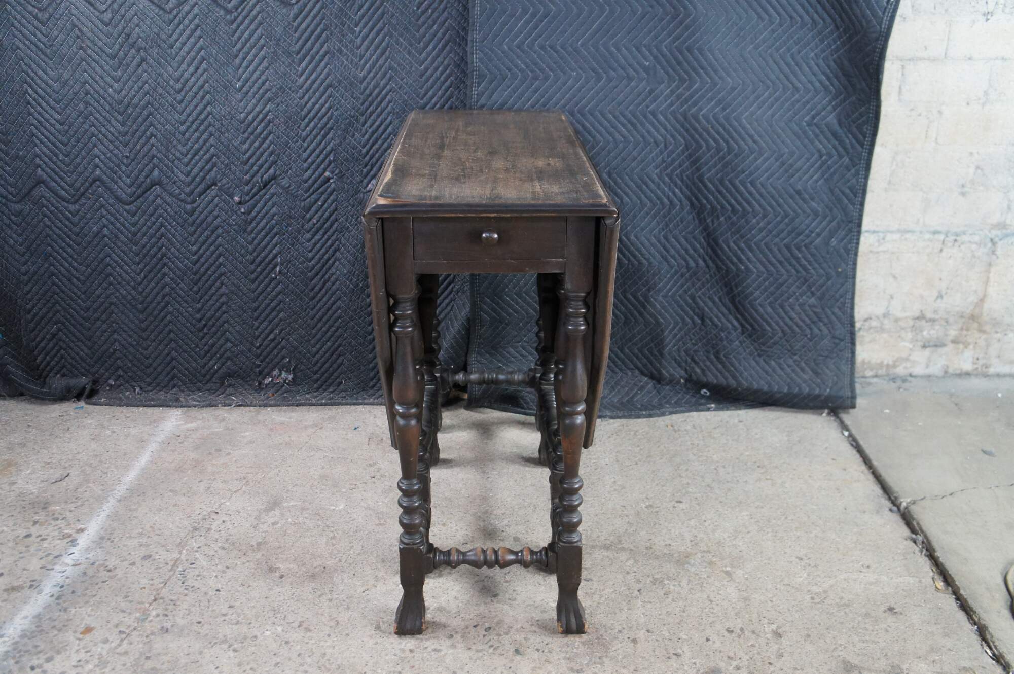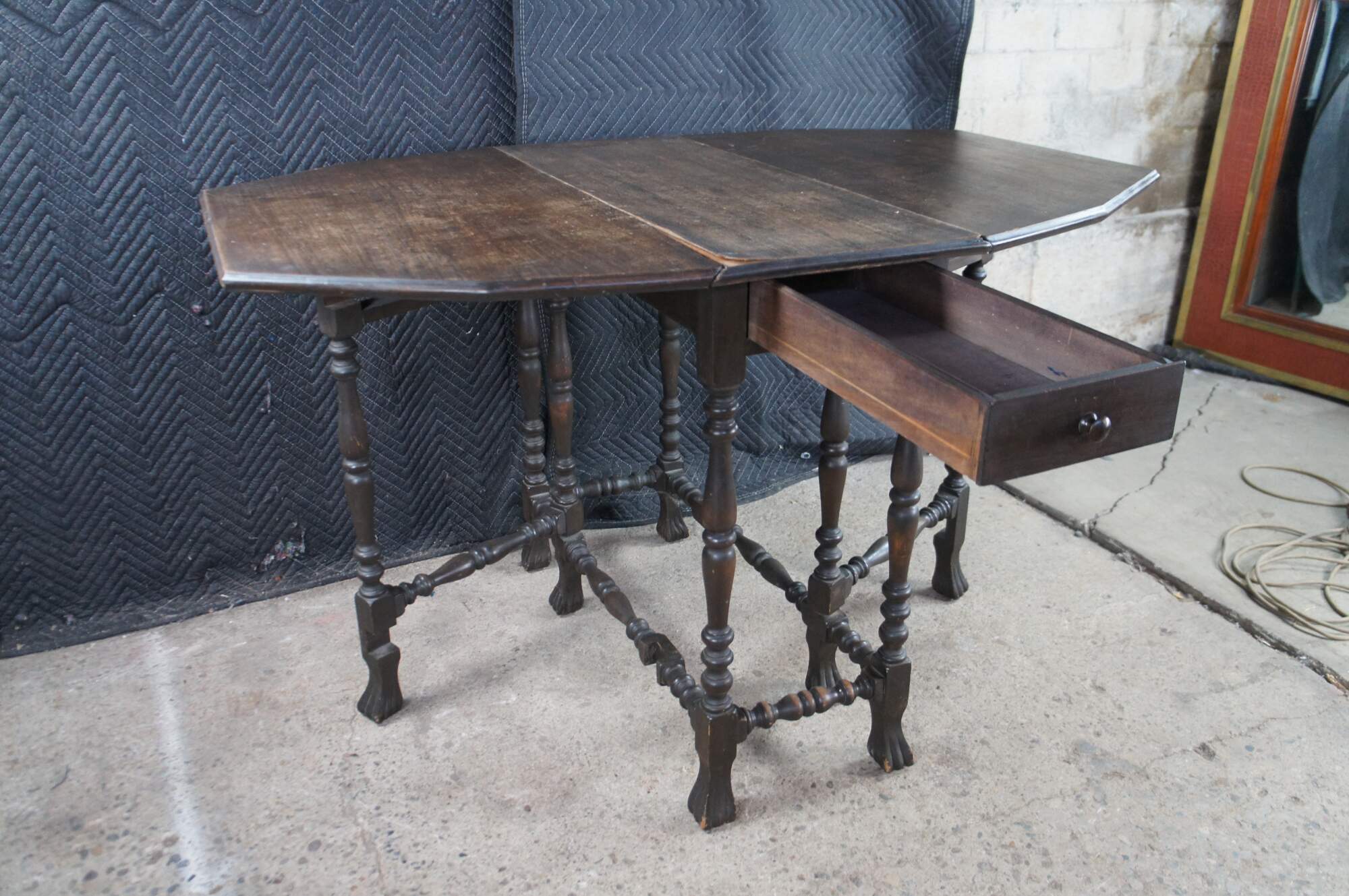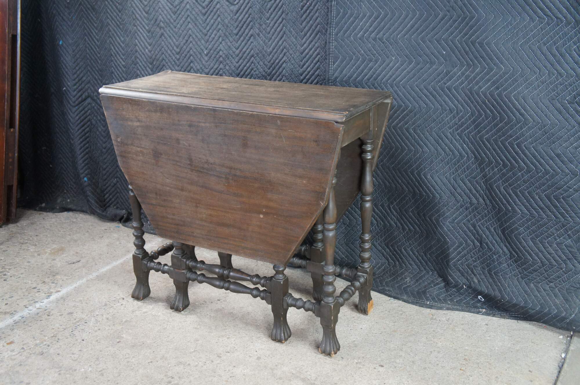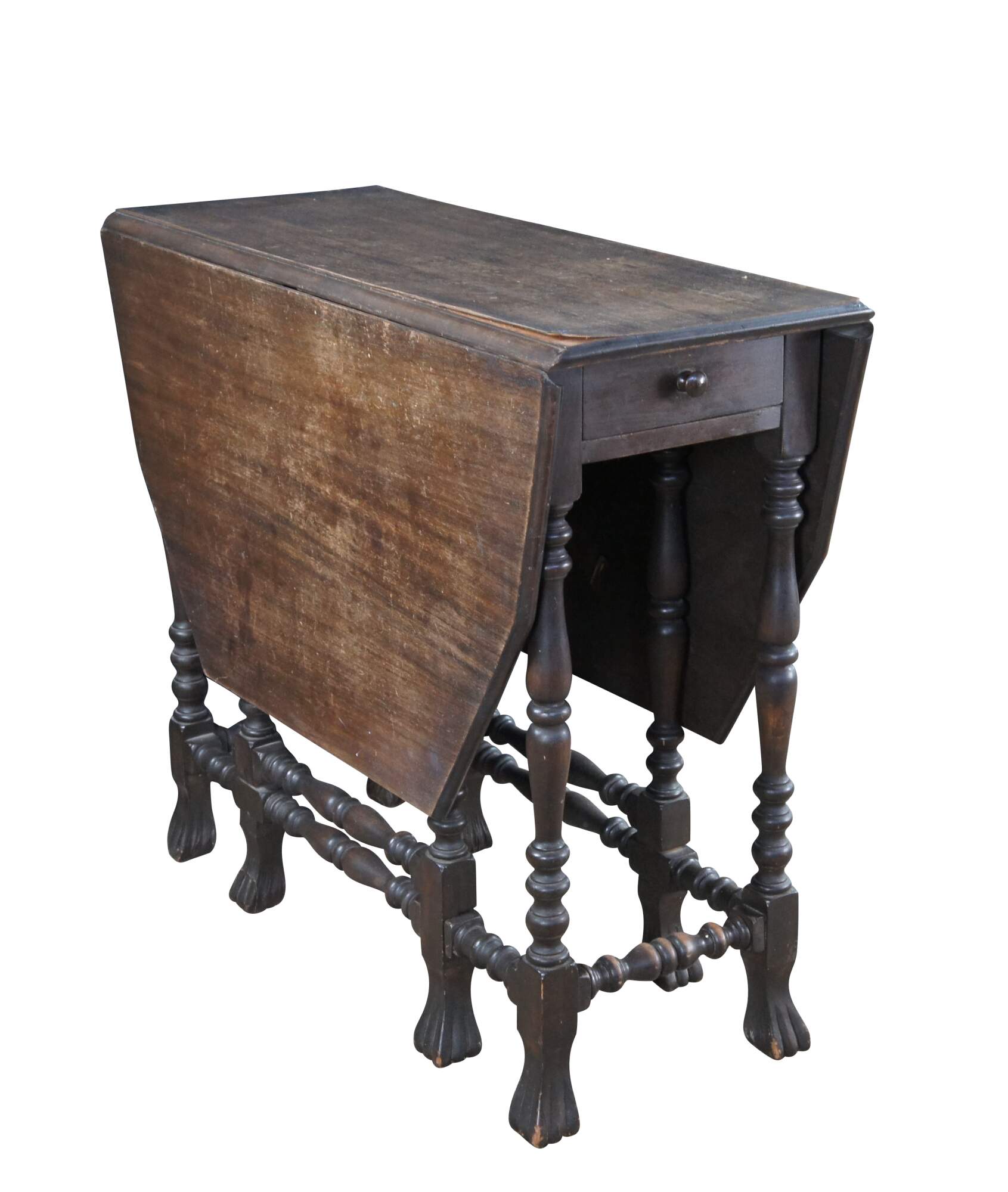 Antique William and Mary style dropleaf gateleg console / hall / game or dining table. Made of walnut featuring a multi sided top, one long drawer, turned legs and posts, and a spanish paw feet.