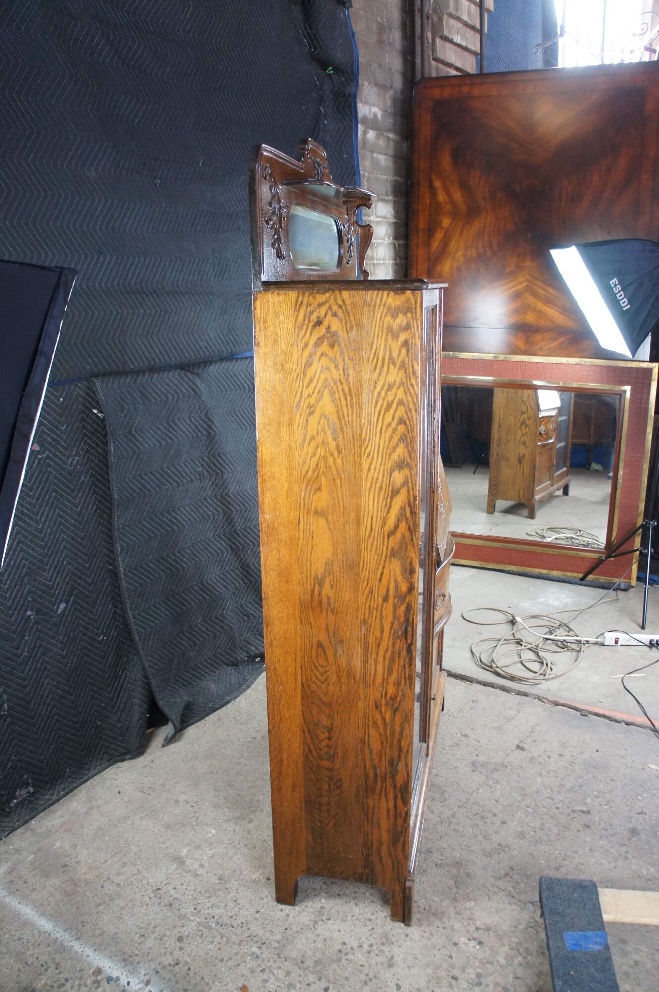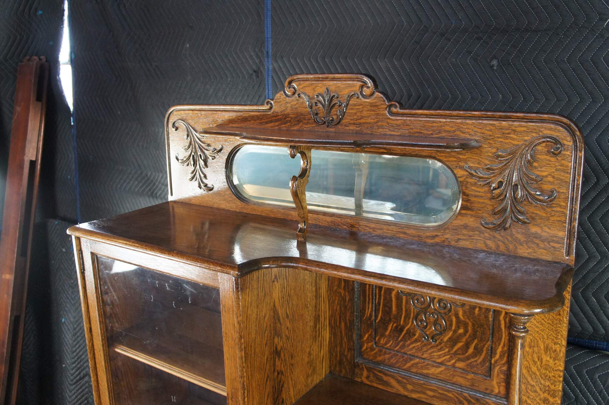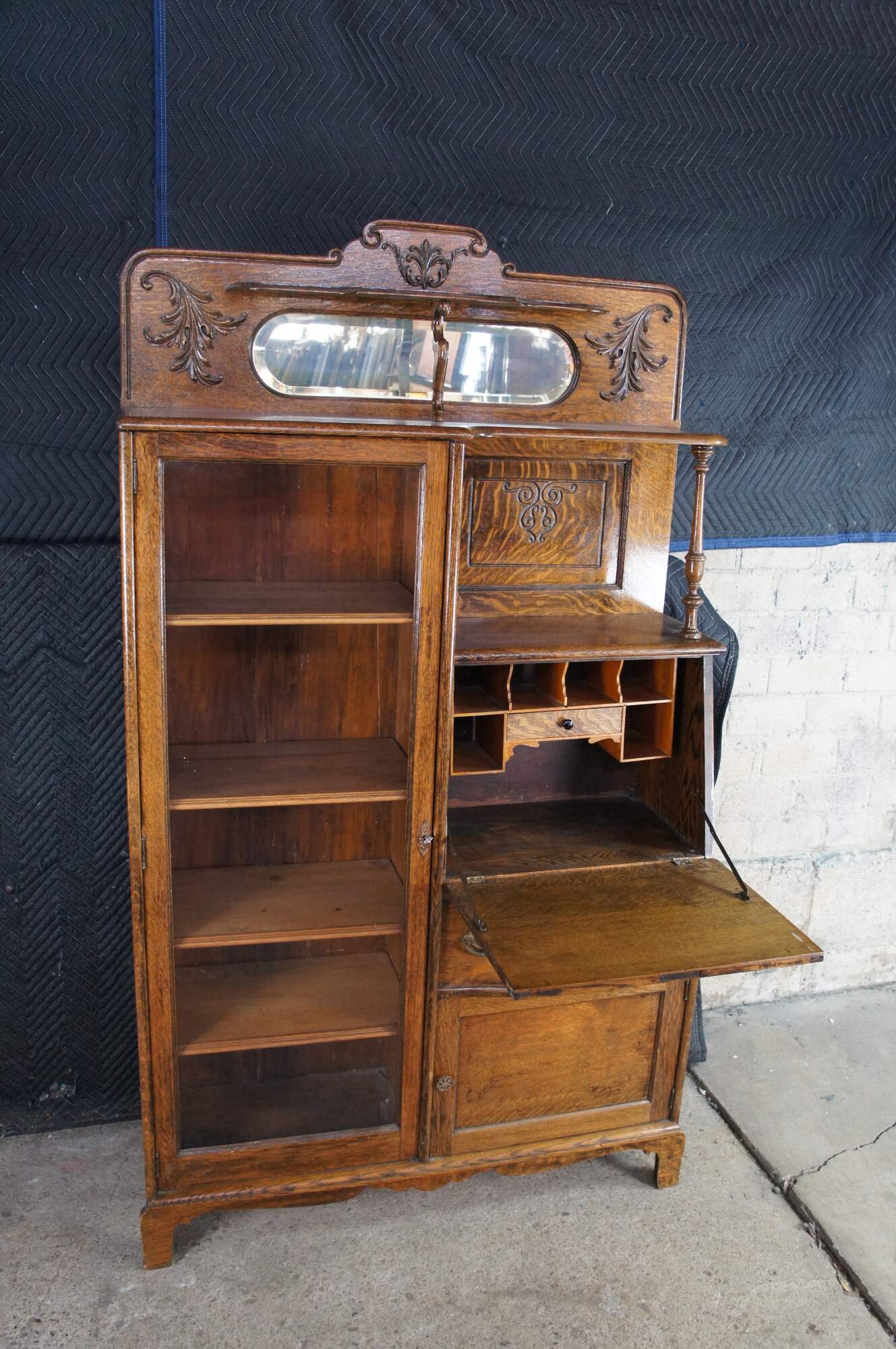 Antique Victorian side by side / secretary desk / bookcase / display case. Made of quartersawn oak featuring Art Nouveau styling with curio cabinet next to a drop front secretary that opens to writing surface with multiple cubbies and a drawer. The top portion of this cabinet features a tiered etagere of shelves with beveled oval mirror and carved acanthus accents