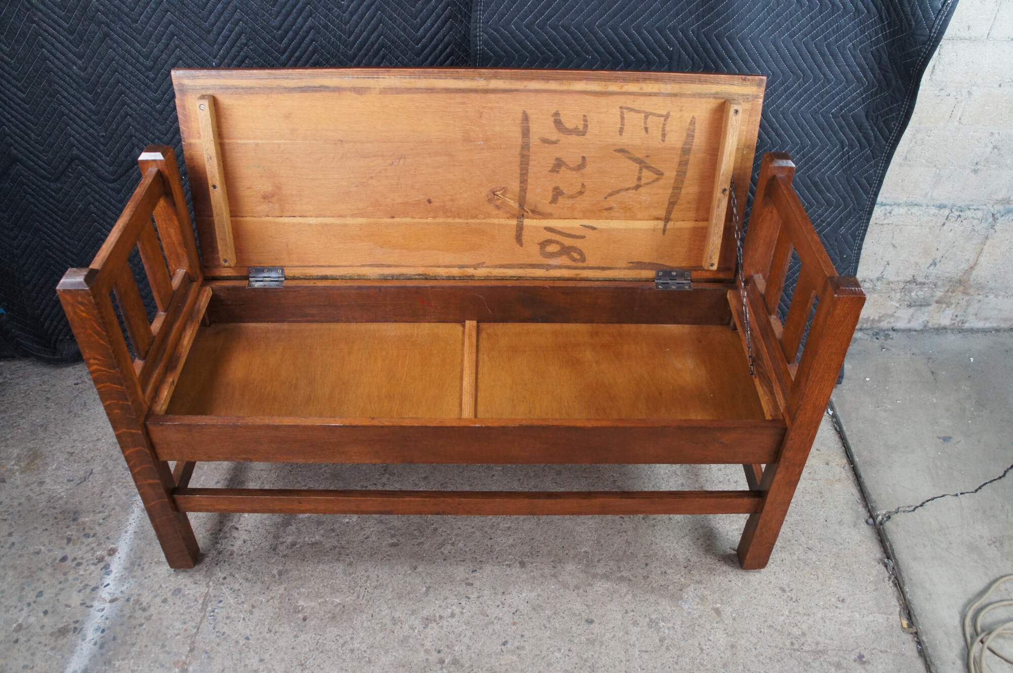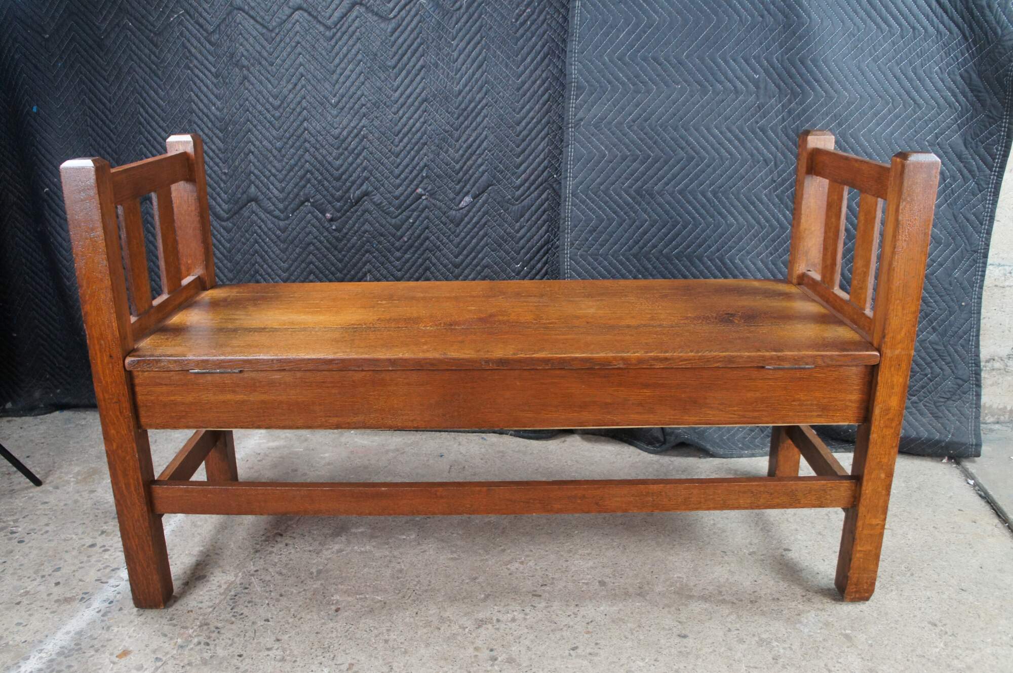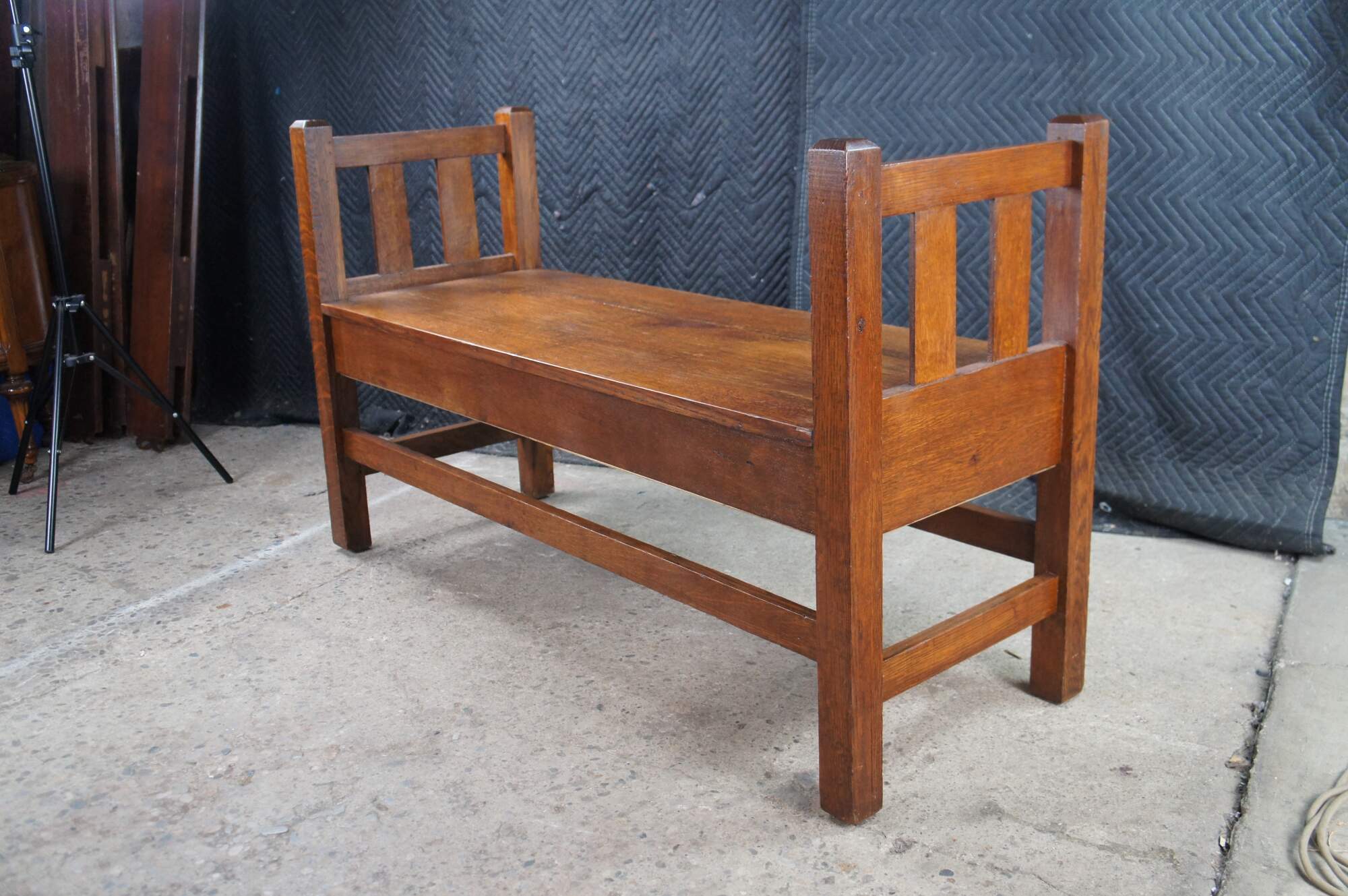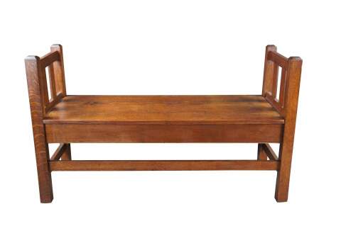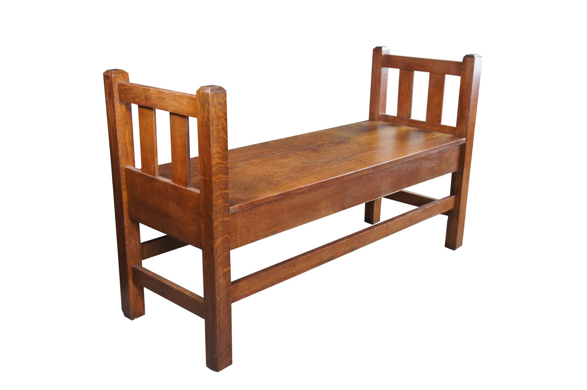 Antique storage bench featuring traditional Mission / Arts & Crafts styling with slatted sides and large hinged compartment under the seat.