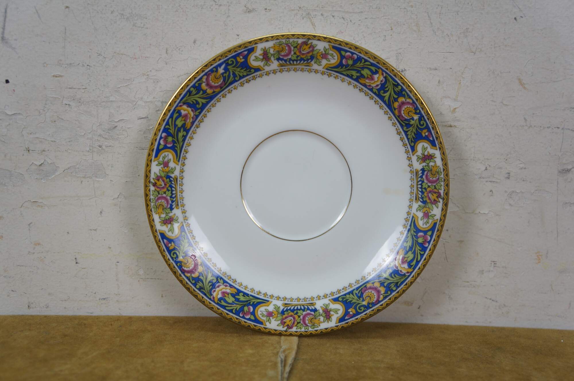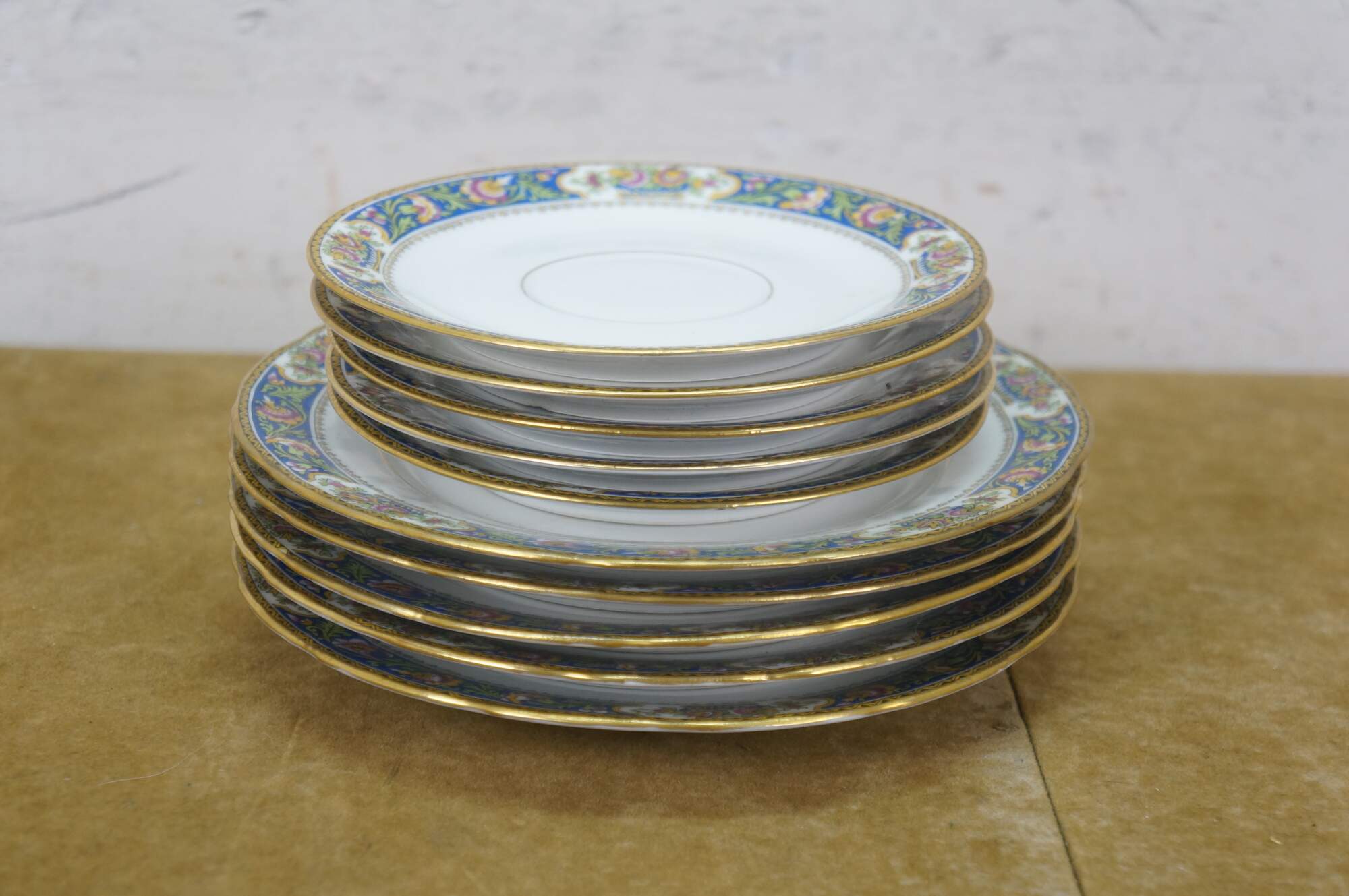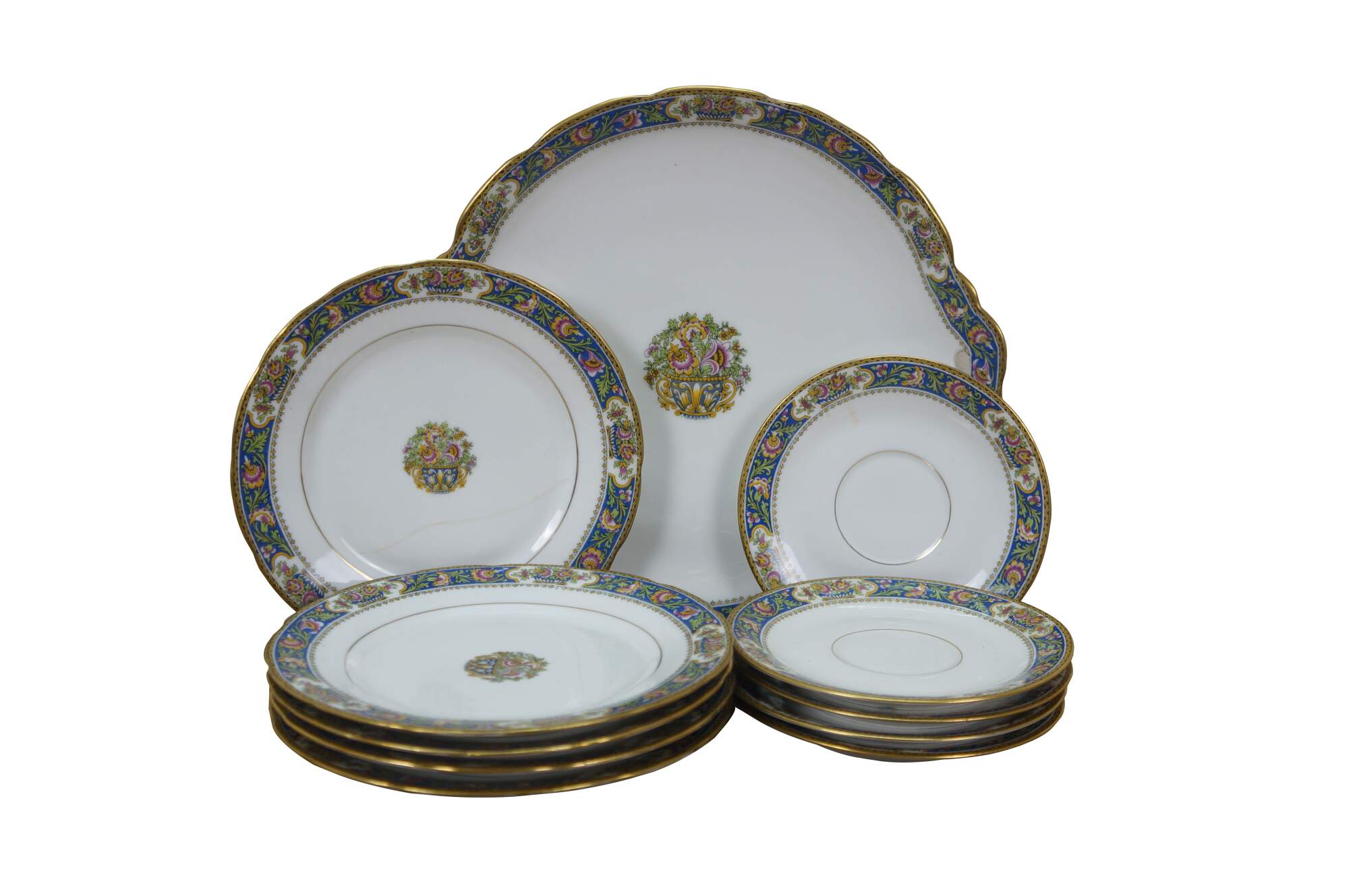 11 pieces of early 20th century Art Deco French Limoges porcelain plates by T.L.B. (Touze, Lemaître Frères & Blancher). White porcelain with gold gilt details and folk art style floral pattern in blue, pink, and yellow. Includes: 1 Serving Plate, 5 Bread Plates, 5 Saucers.