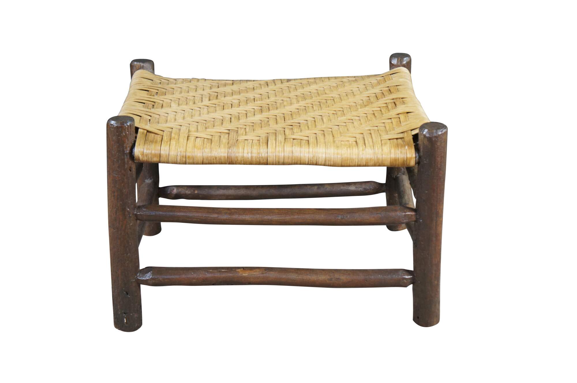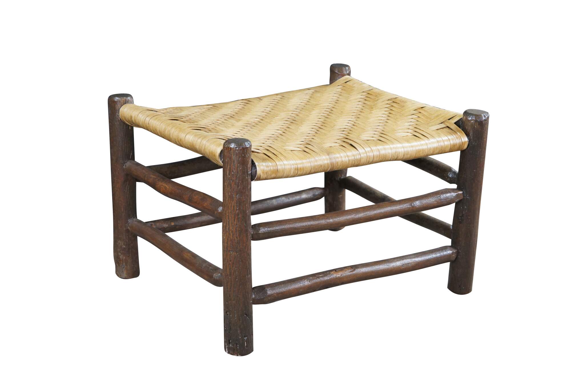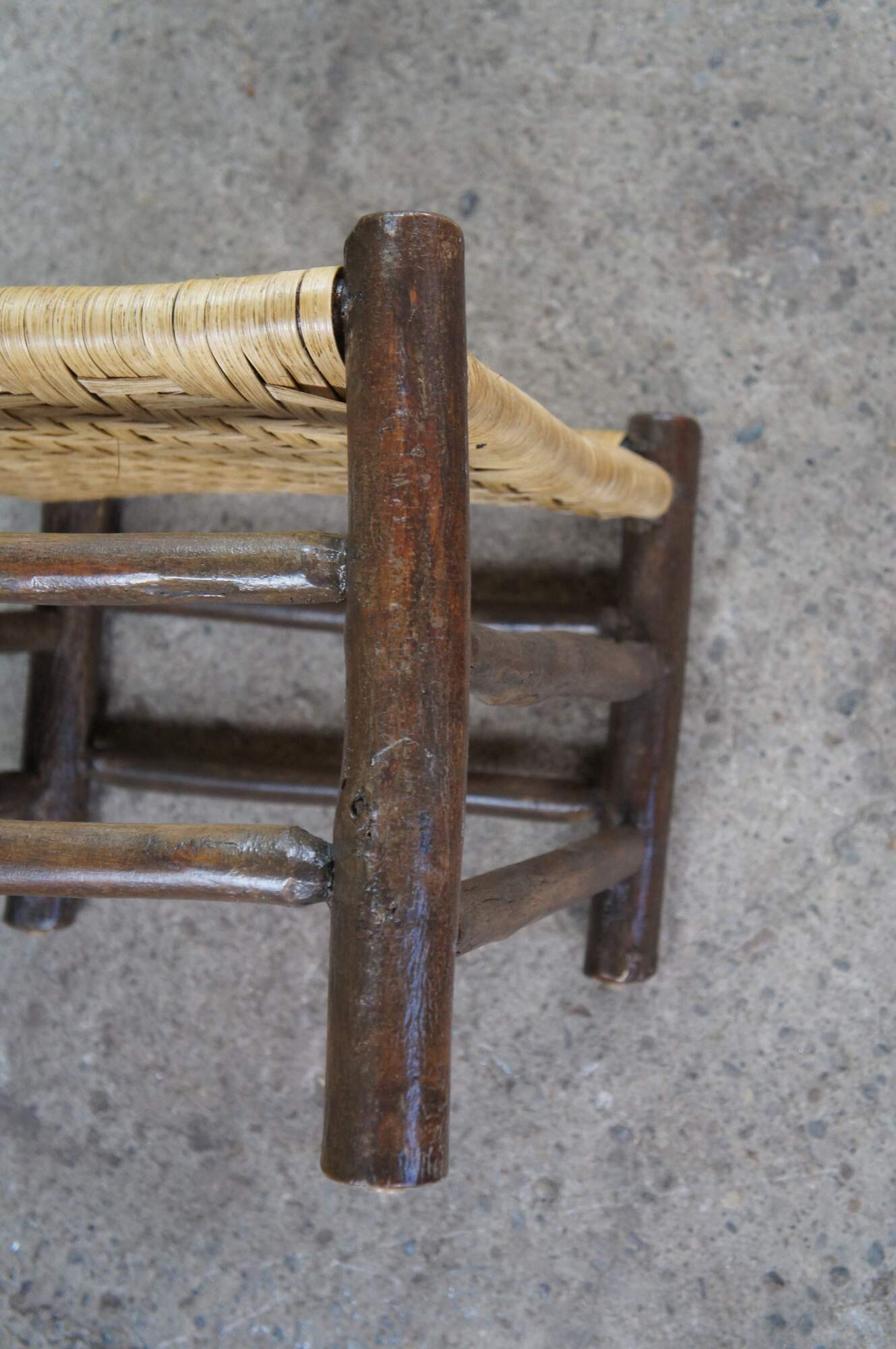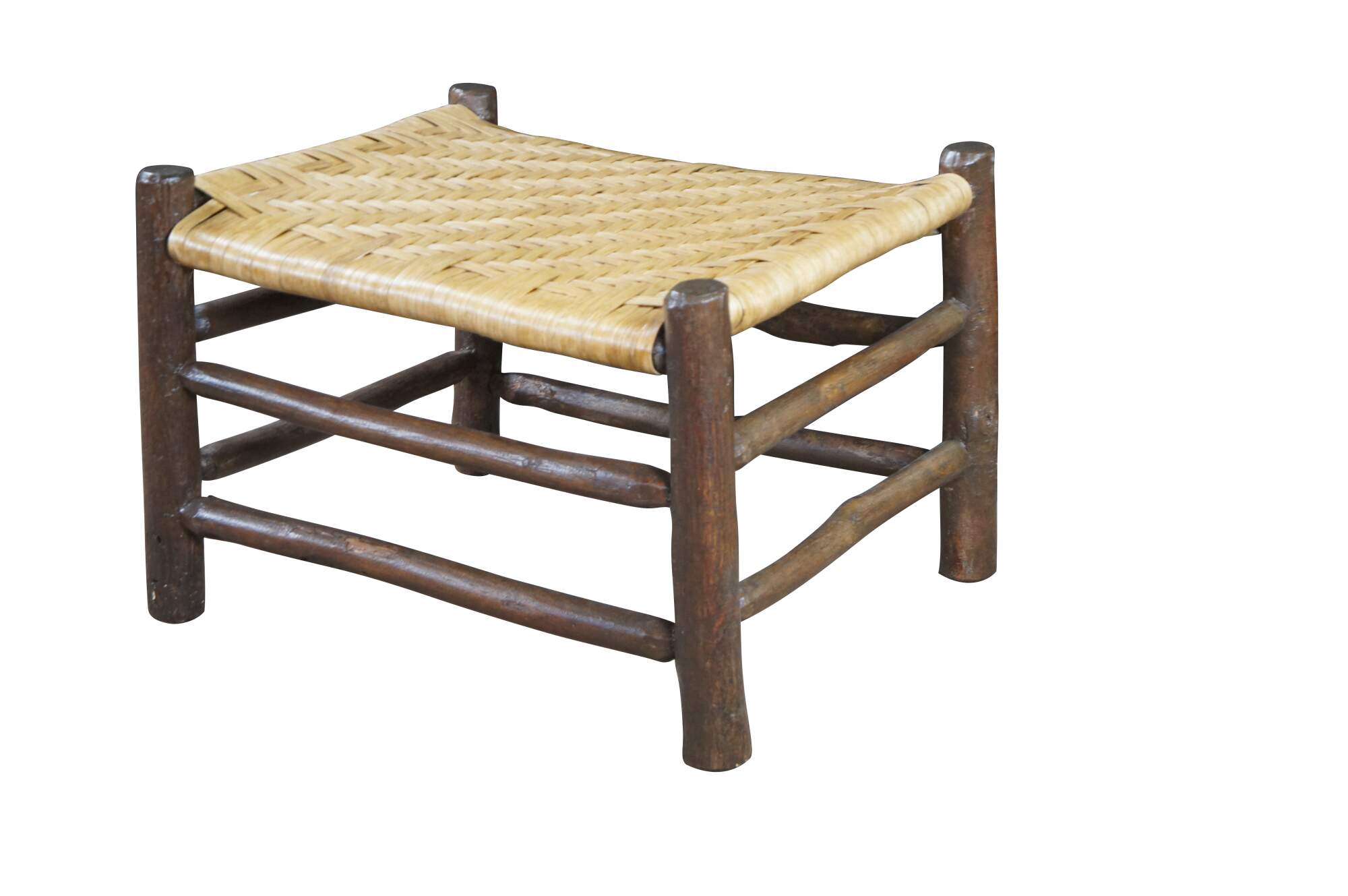 Antique Old Hickory style farmhouse / lodge footstool / bench seat / ottoman. Made from rustic natural tree branch / logs with woven rattan seat.