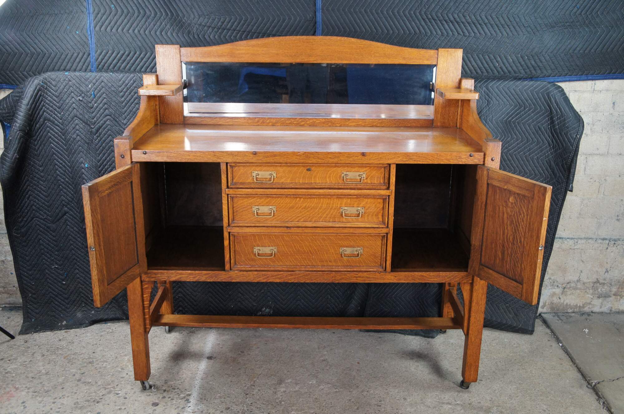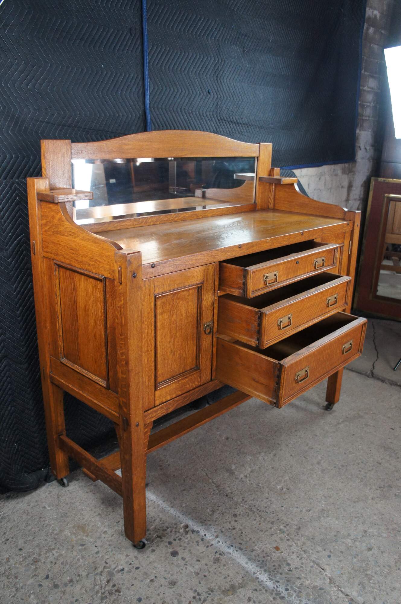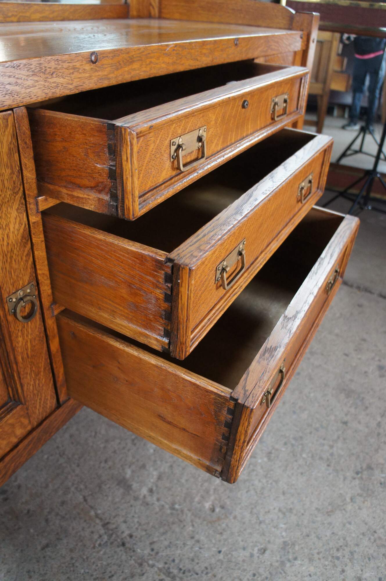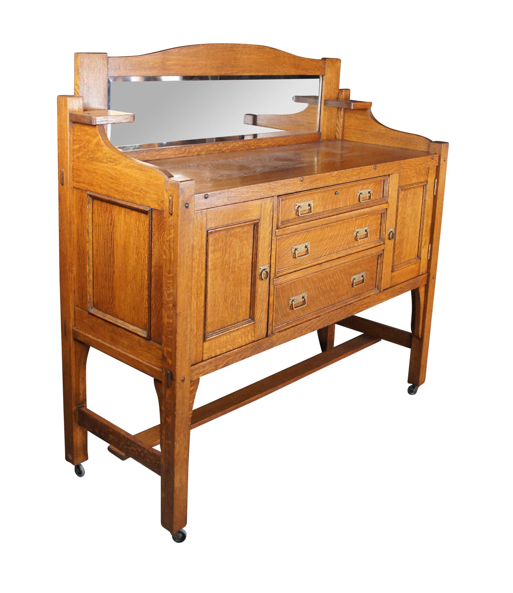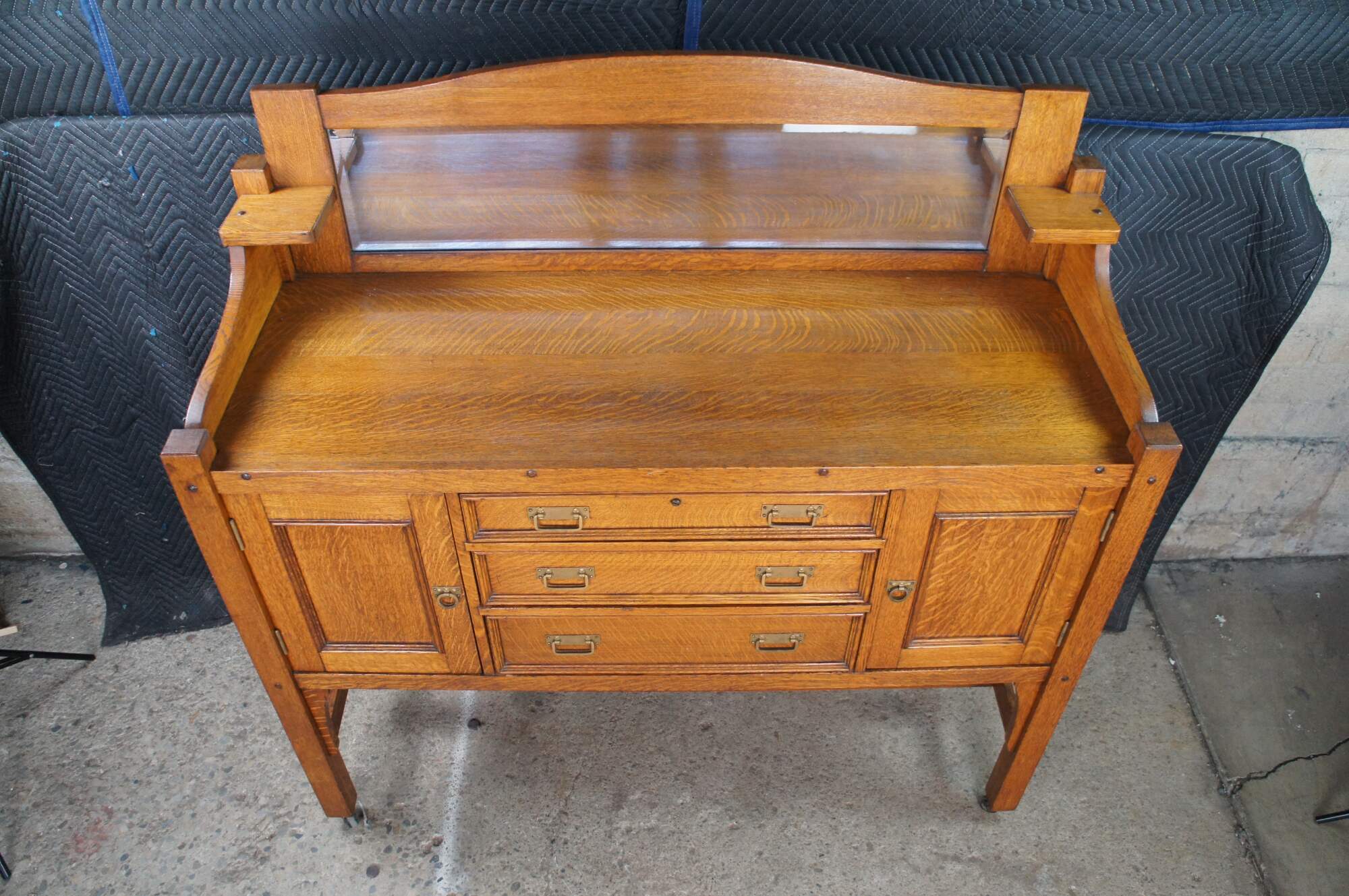 Antique Edwardian era Come-Packt buffet / sideboard / server. Made of quartersawn oak with Arts & Crafts and Mission styling. The cabinet features paneled sides, exposed joinery, and a large beveled mirror backsplash flanked by small candle shelves. The body of the console features three dovetailed drawers flanked by a pair of cabinets, supported by long legs connected by stretchers, and on rolling castors.