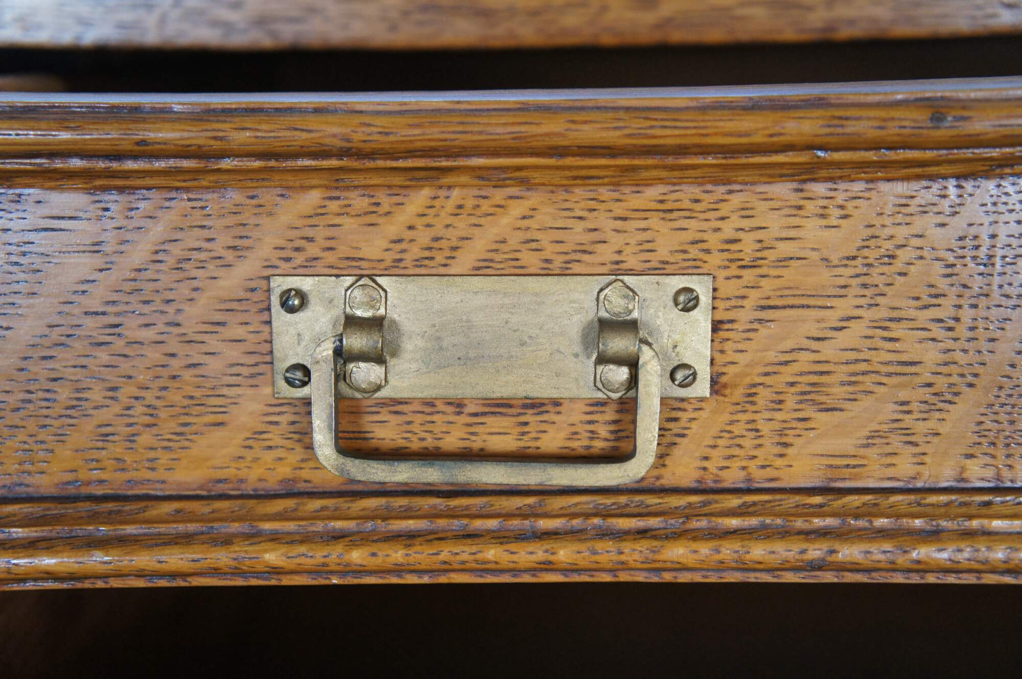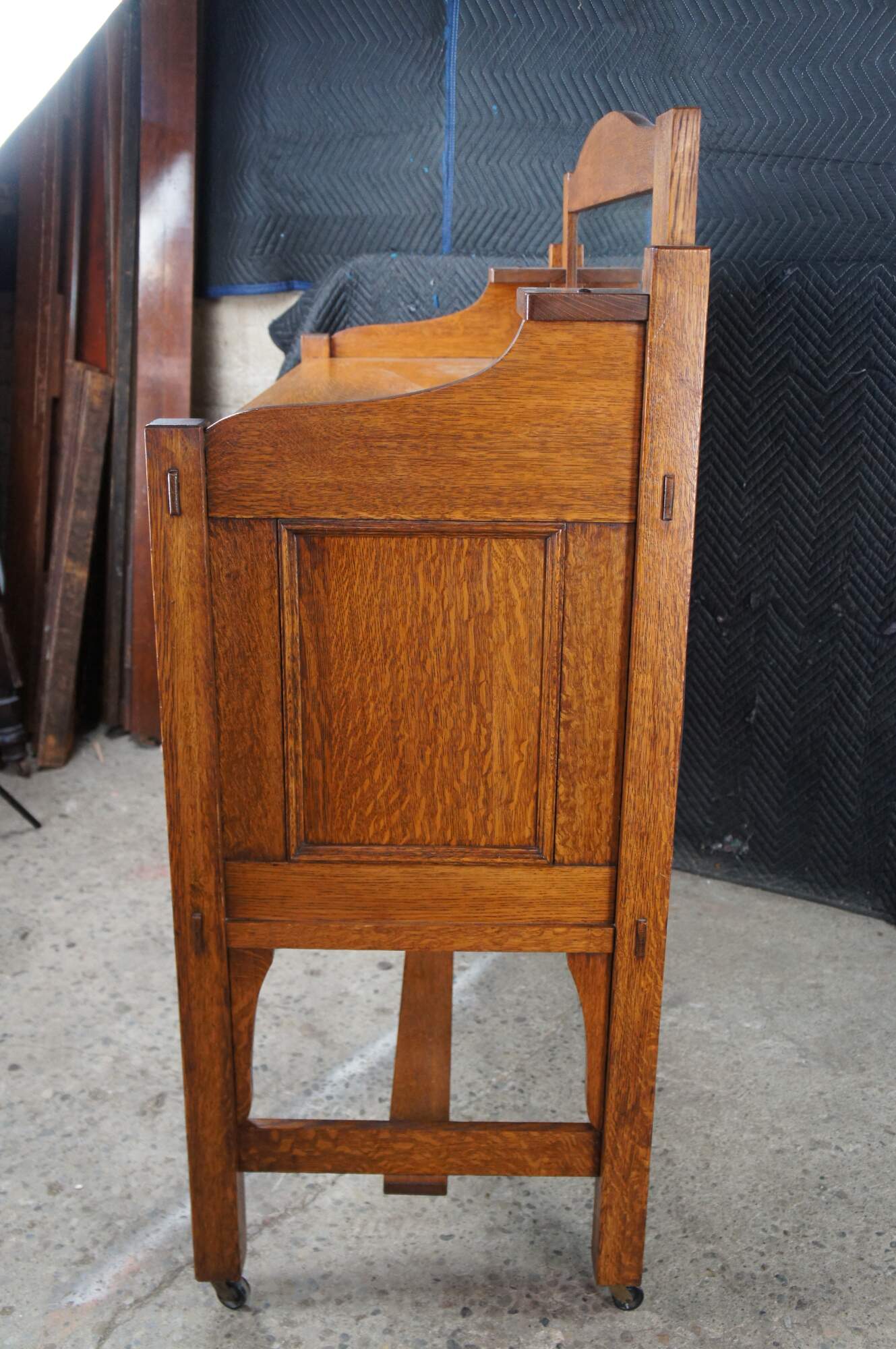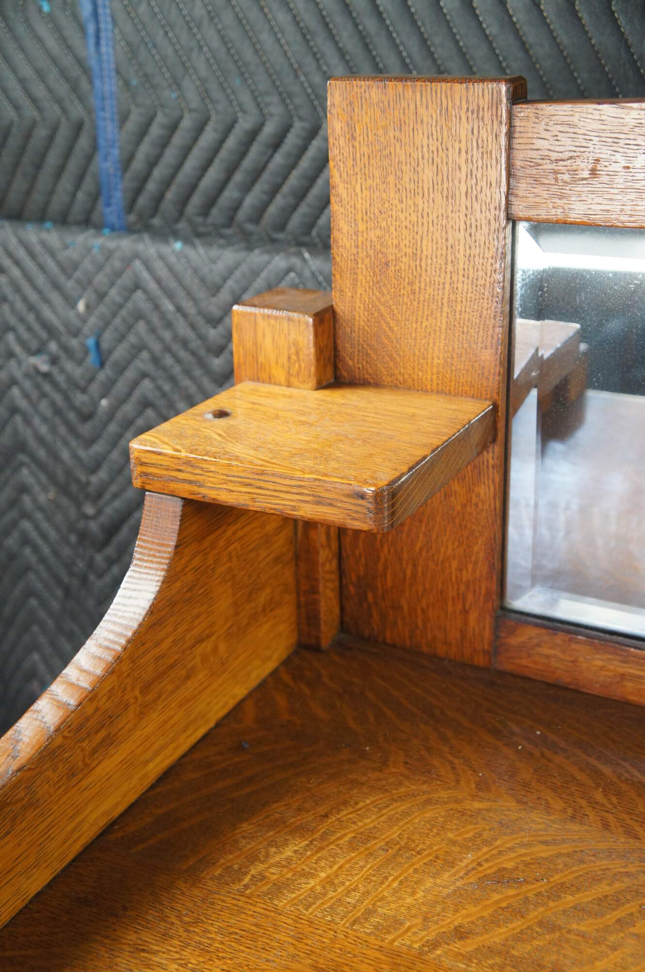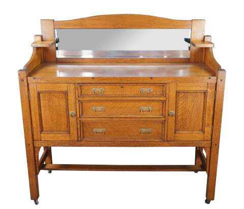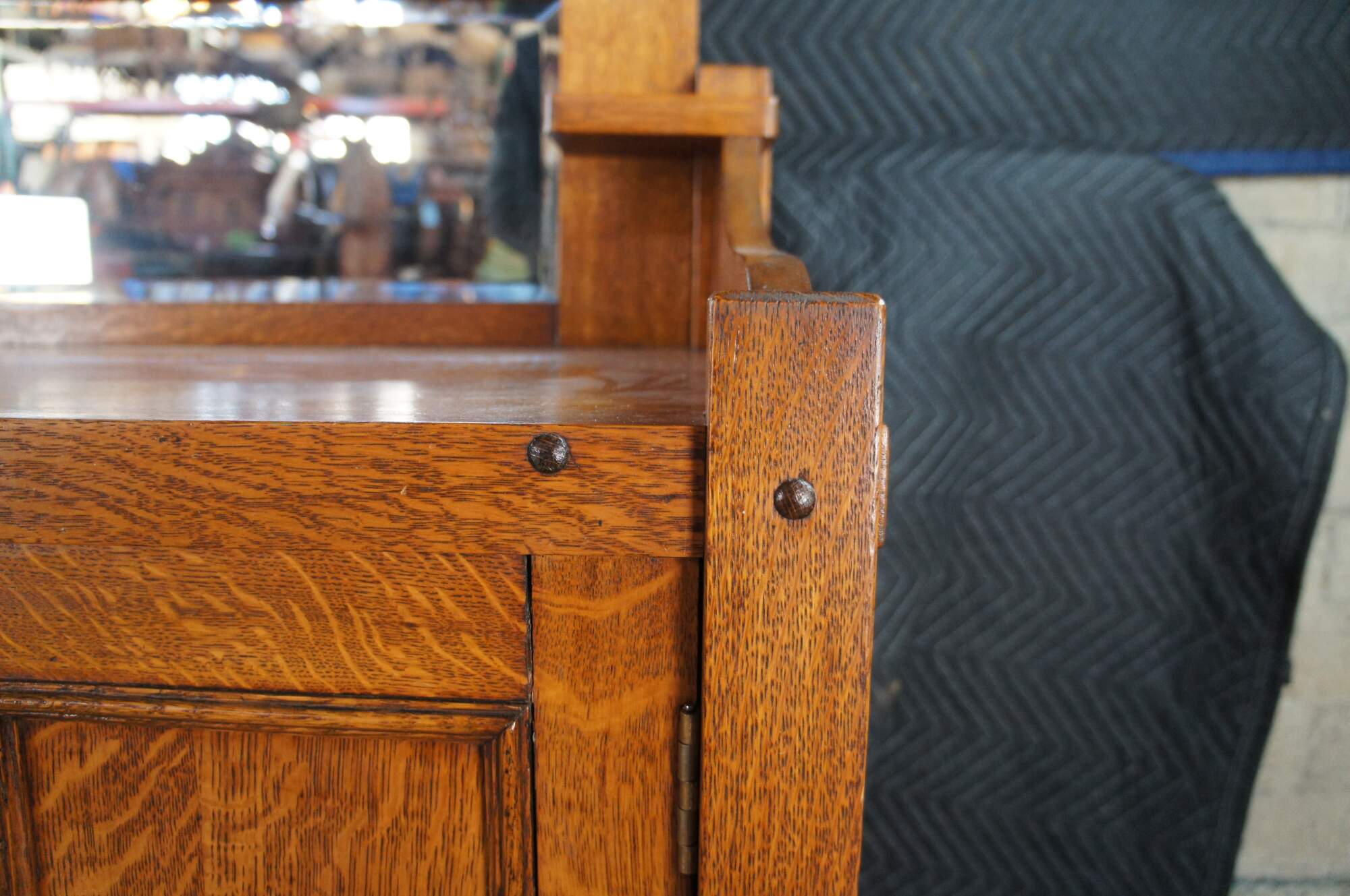 Antique Edwardian era Come-Packt buffet / sideboard / server. Made of quartersawn oak with Arts & Crafts and Mission styling. The cabinet features paneled sides, exposed joinery, and a large beveled mirror backsplash flanked by small candle shelves. The body of the console features three dovetailed drawers flanked by a pair of cabinets, supported by long legs connected by stretchers, and on rolling castors.
