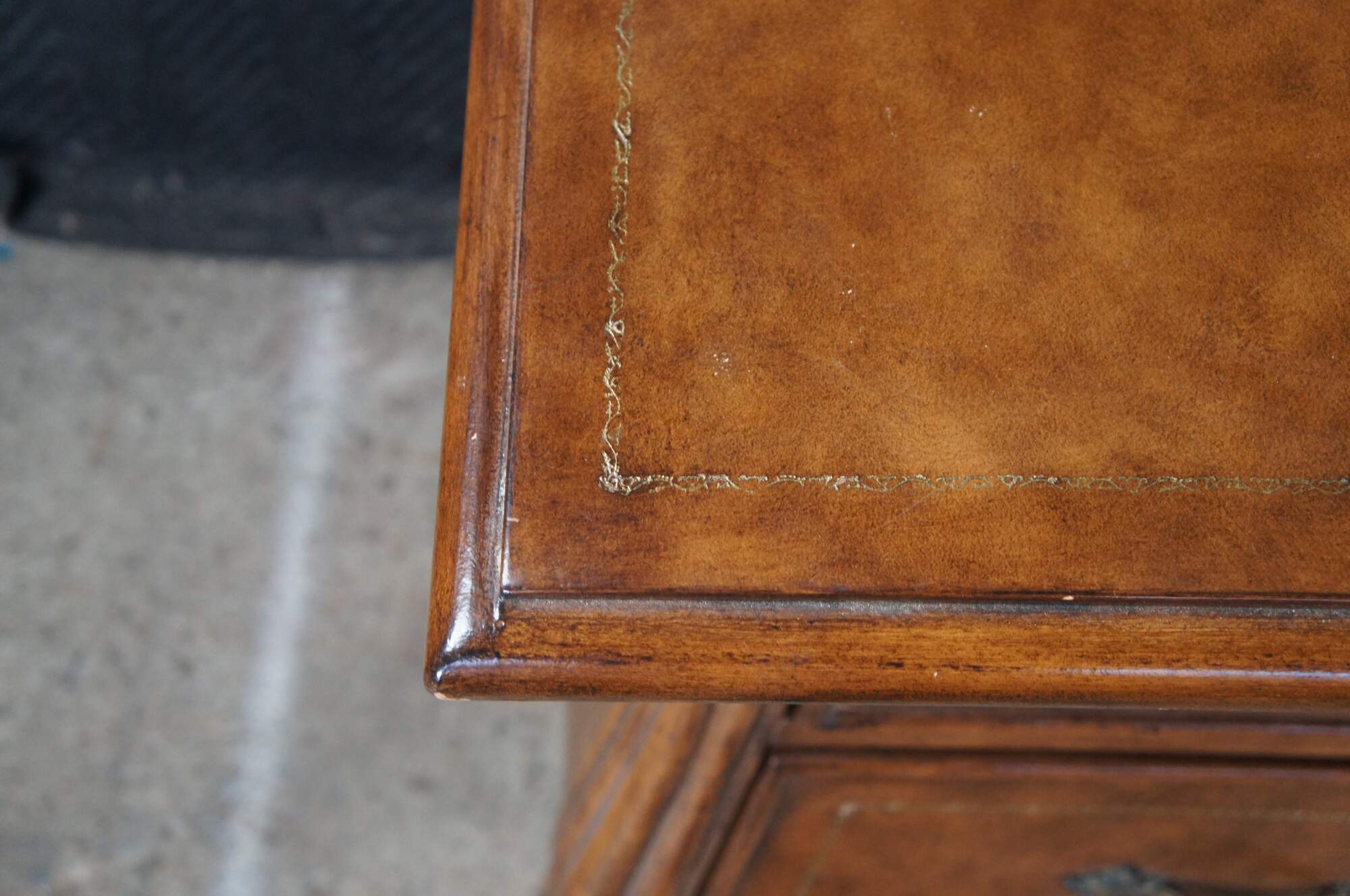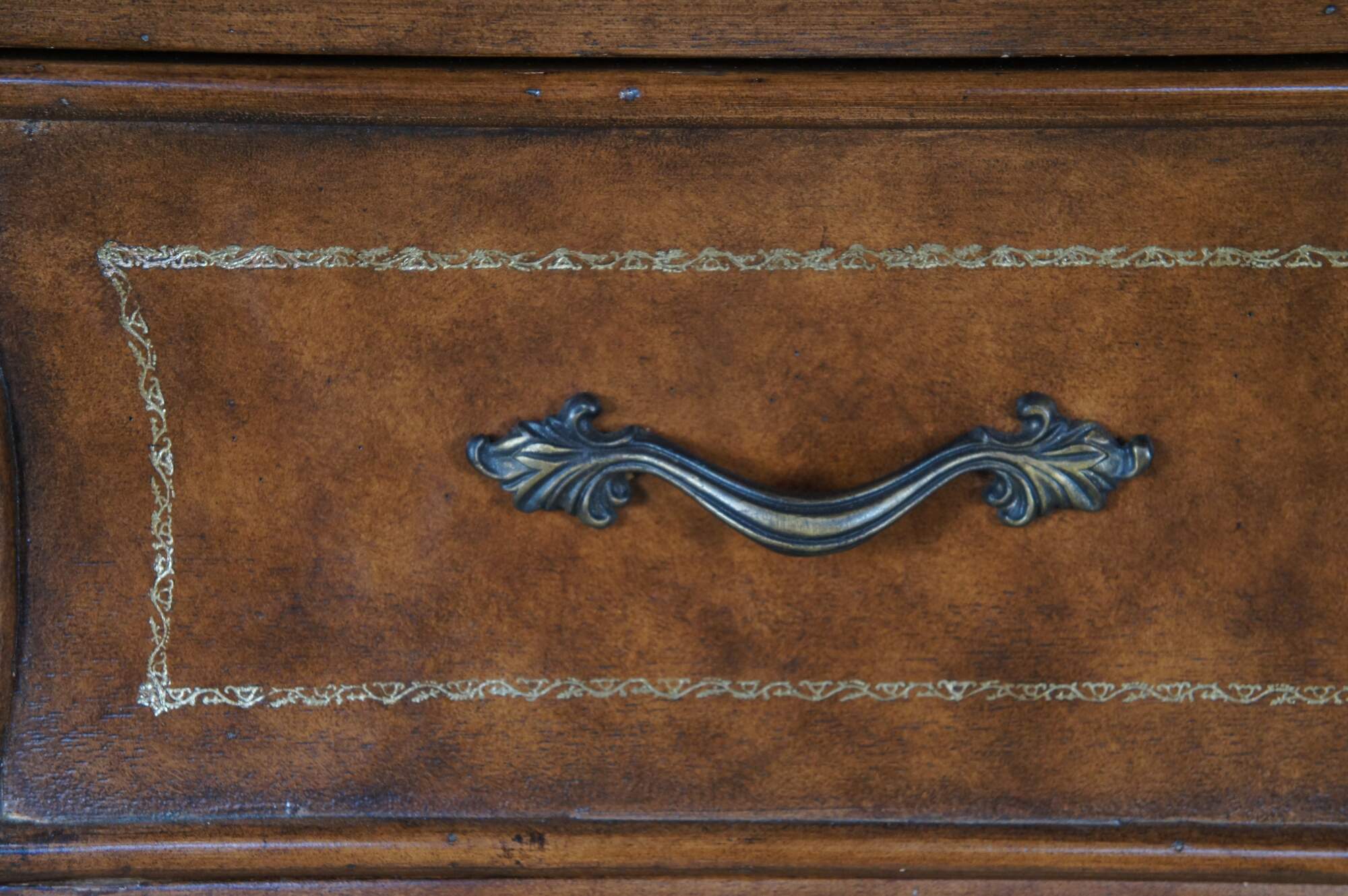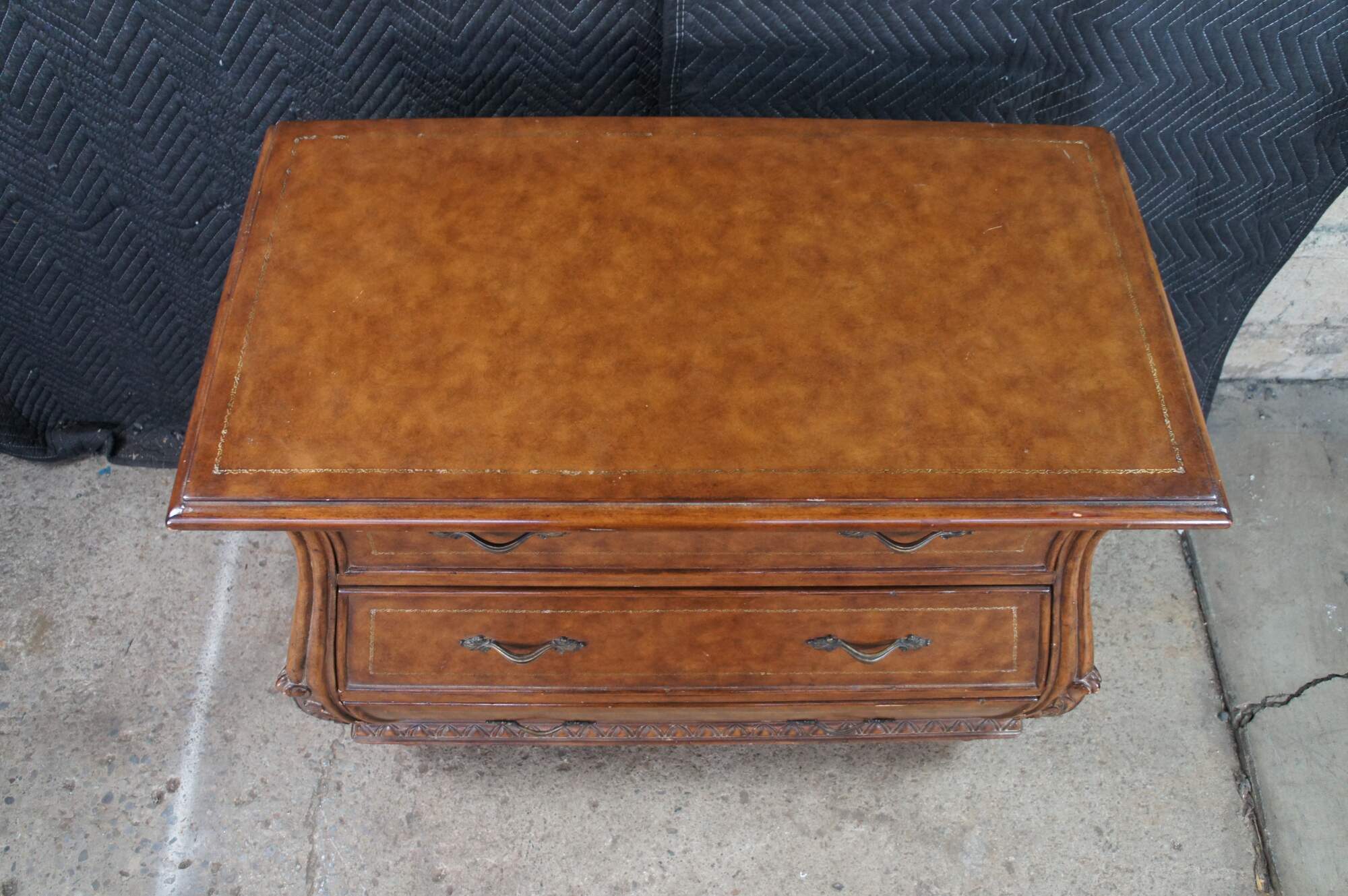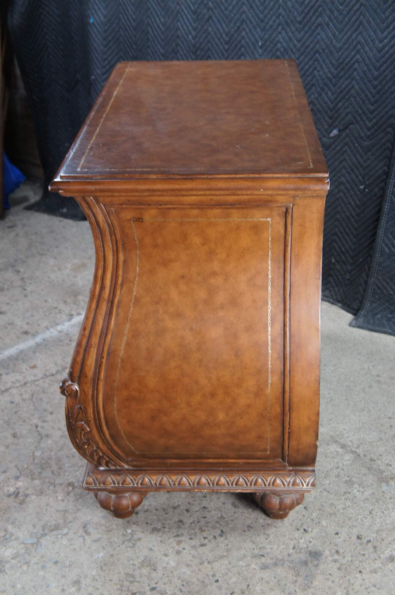Vintage French Louis XVI style bombe dresser / chest of drawers featuring a tooled leather design with acanthus accents. Made in Indonesia 40-72.