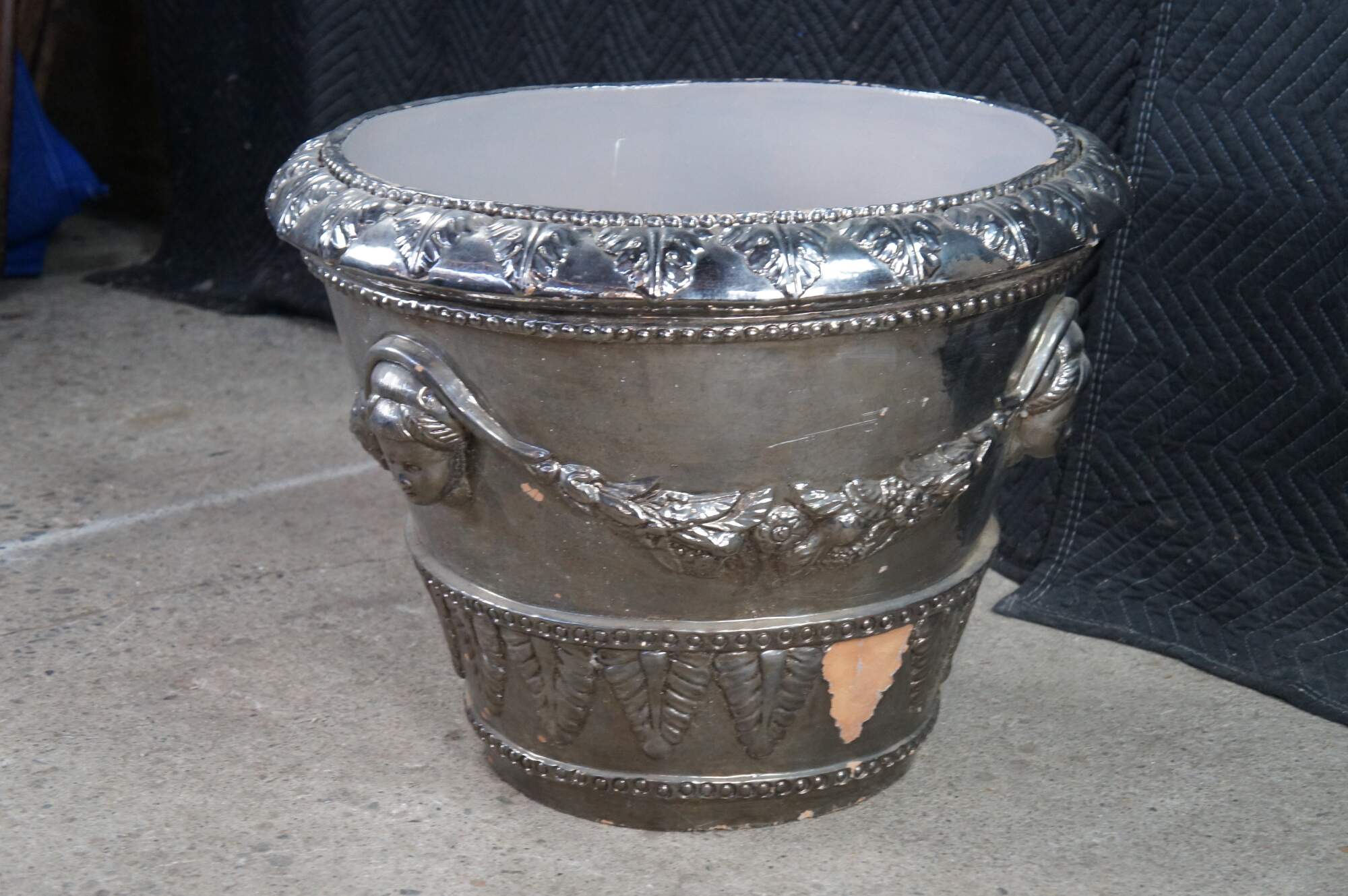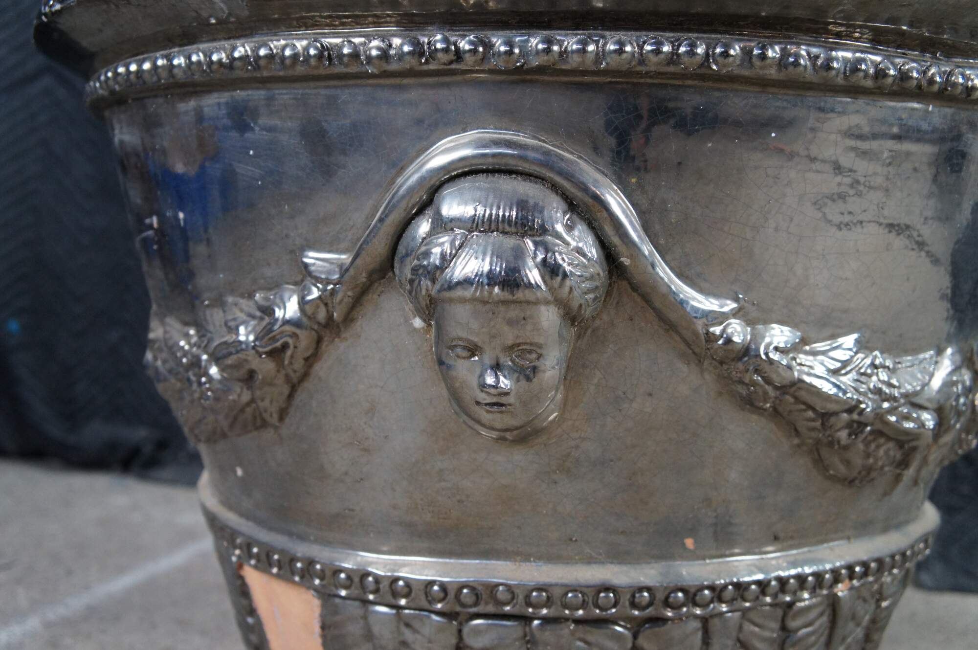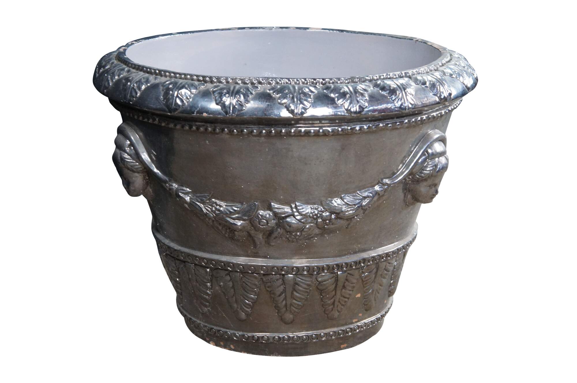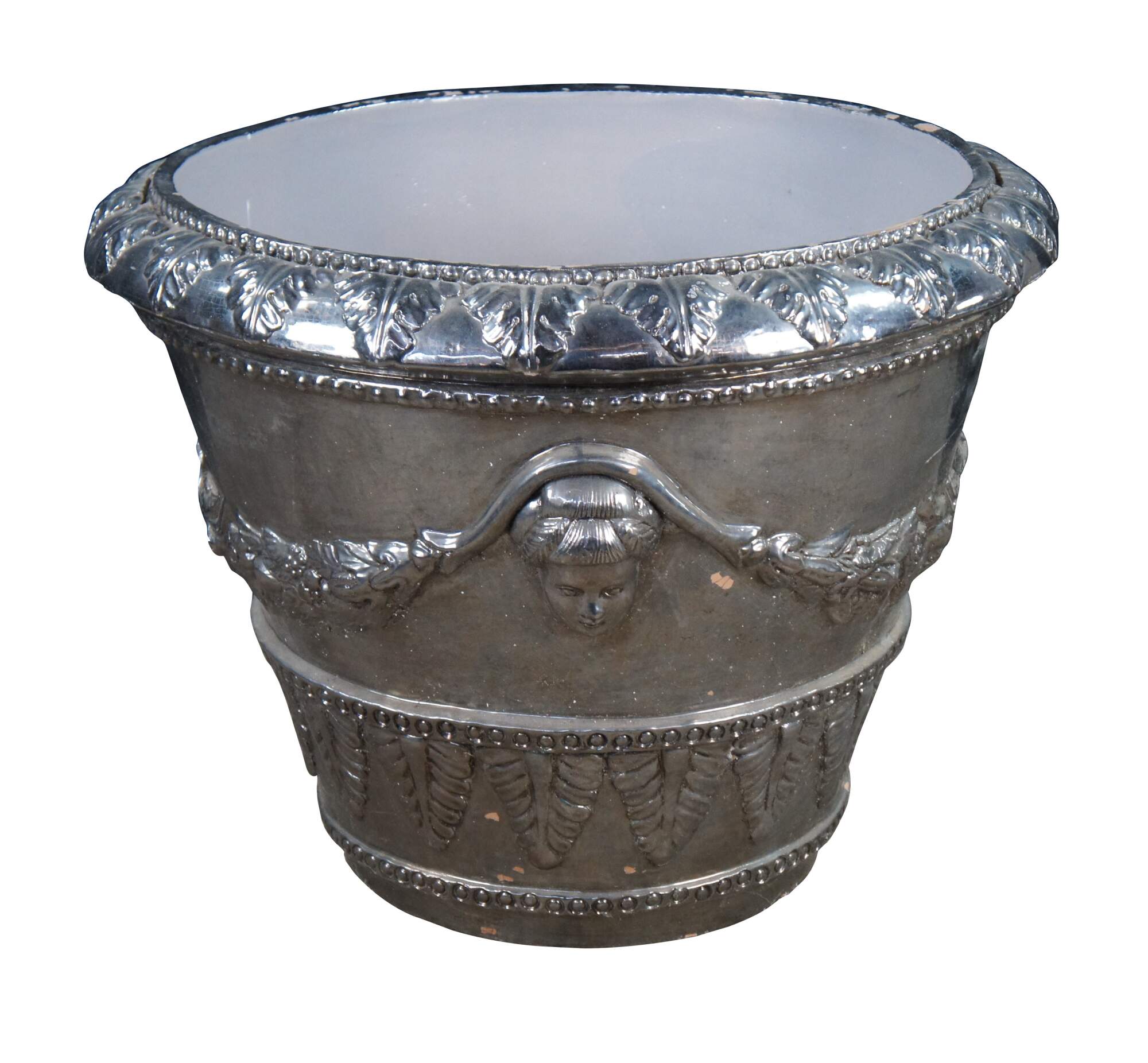A very large silver painted terracotta planter featuring Italian Neoclassical designs with faces, swags and acanthis accents.