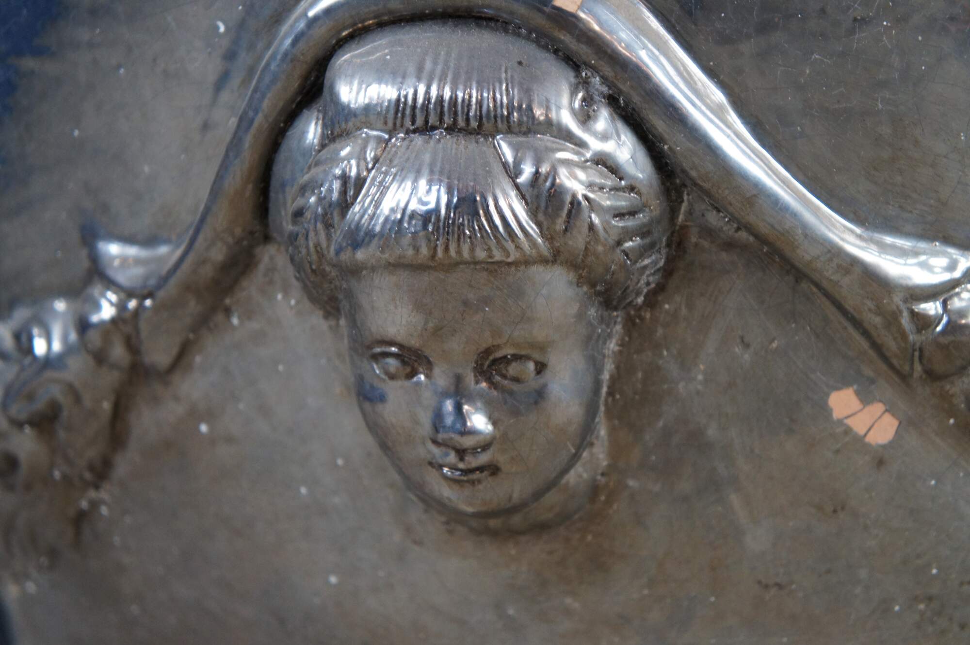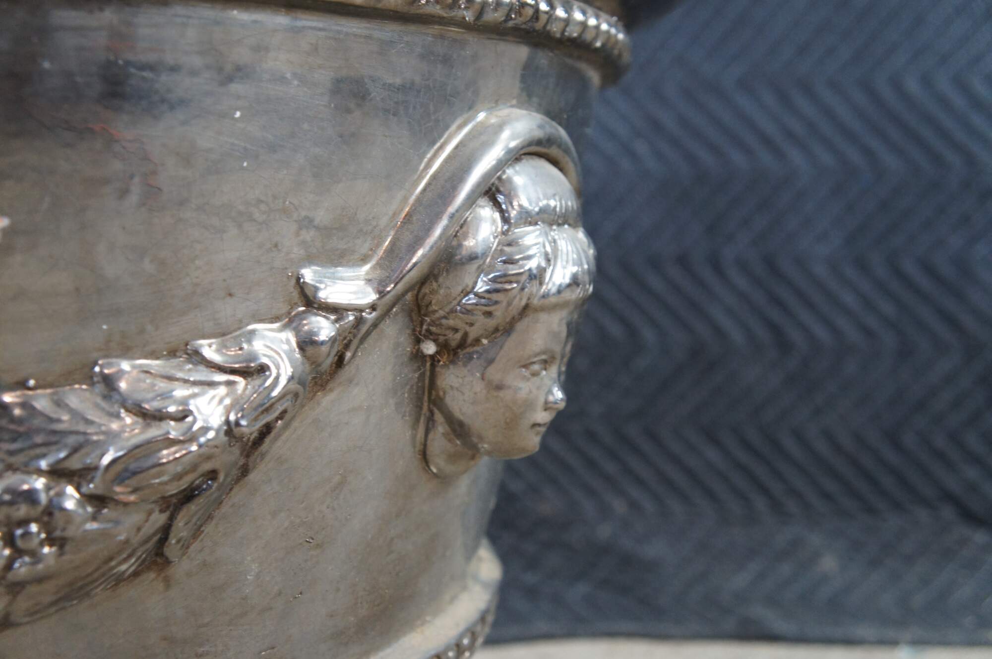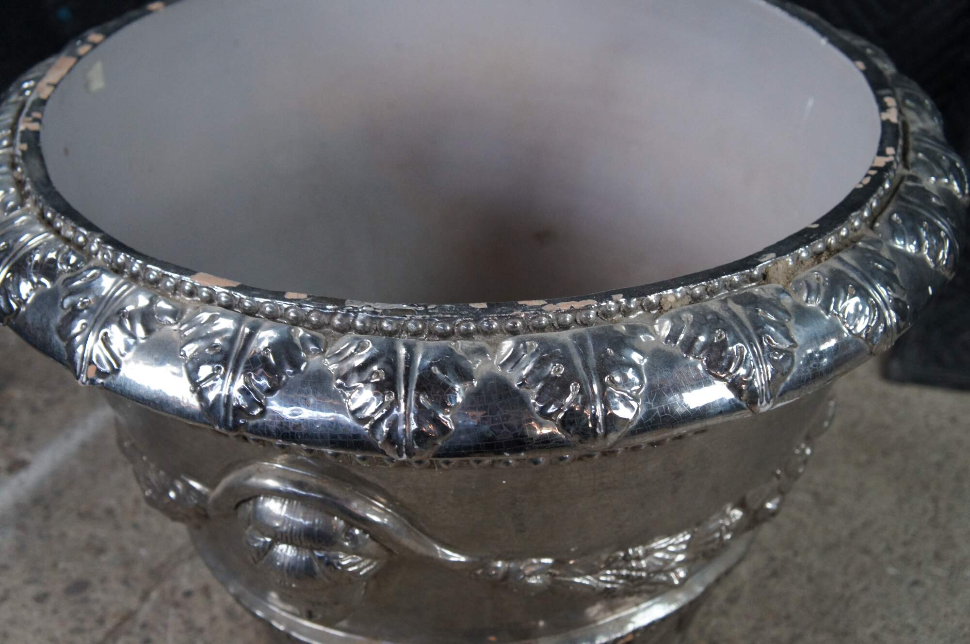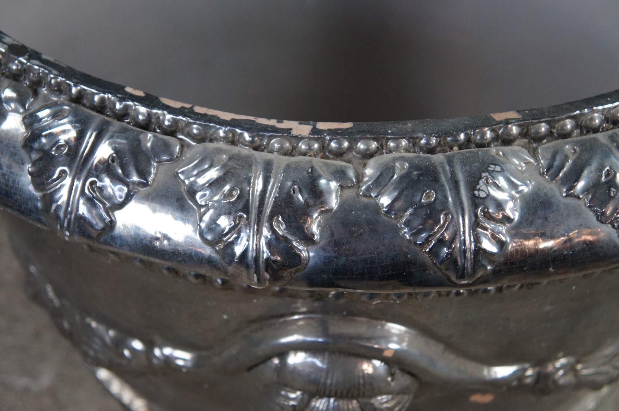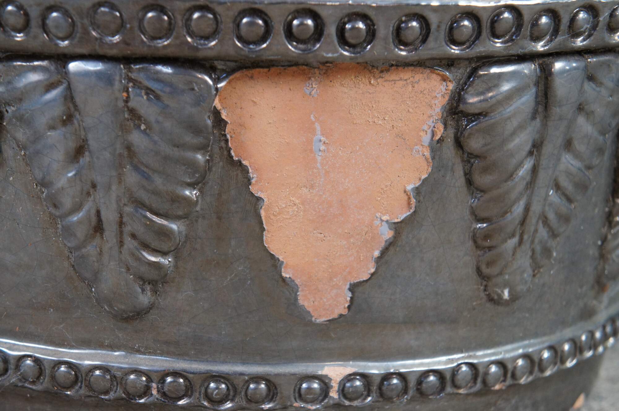 A very large silver painted terracotta planter featuring Italian Neoclassical designs with faces, swags and acanthis accents.