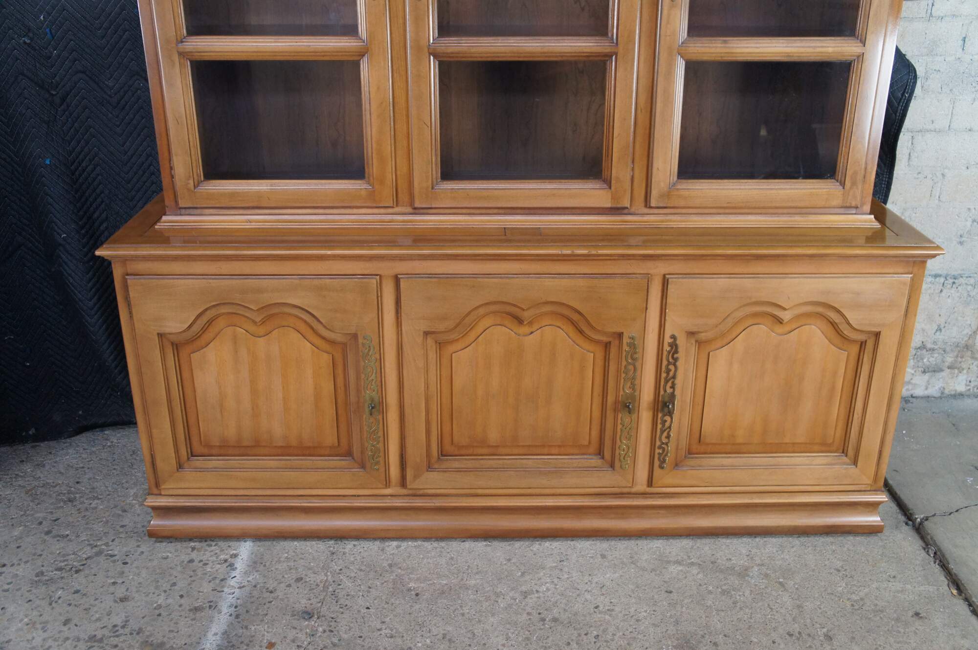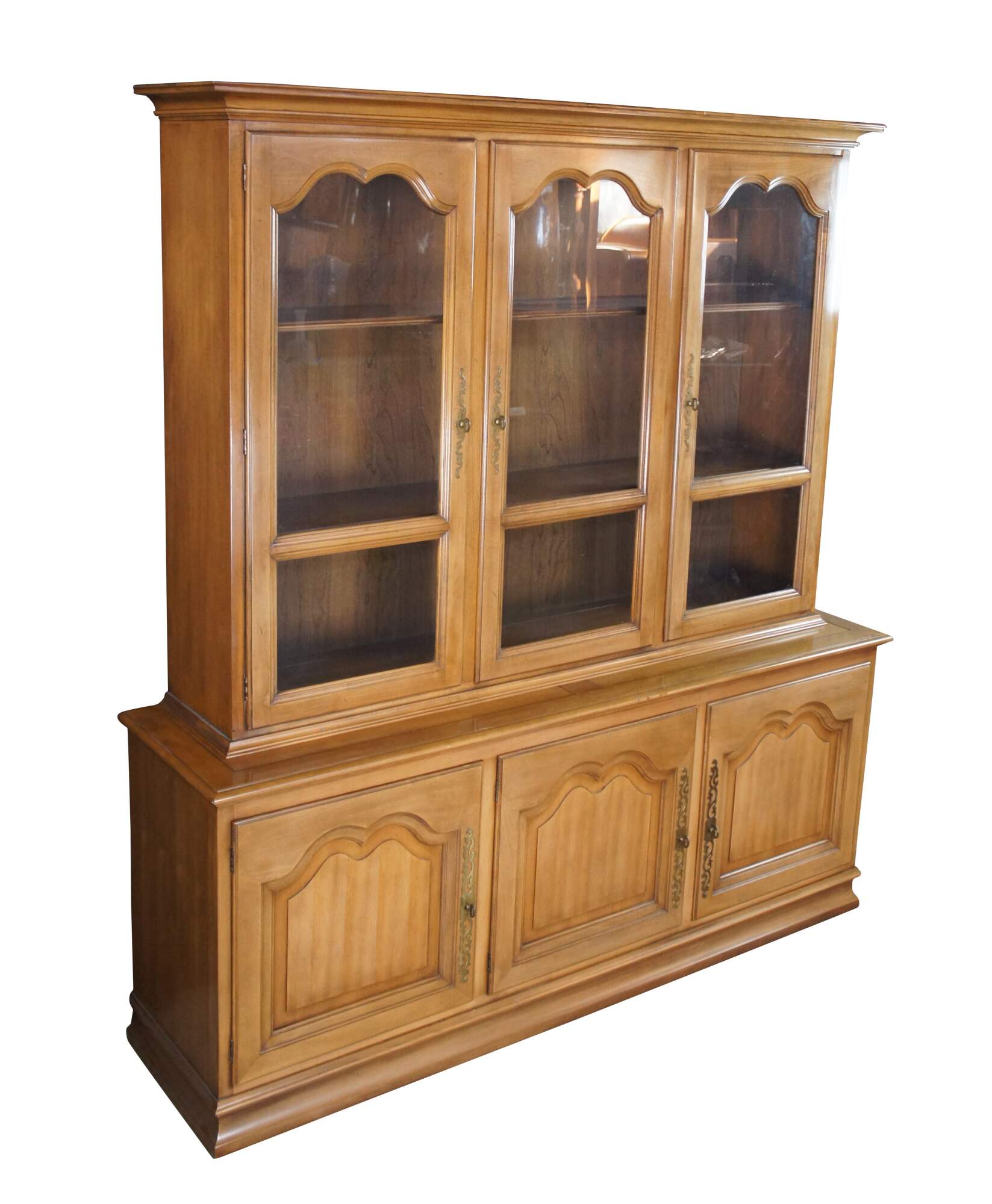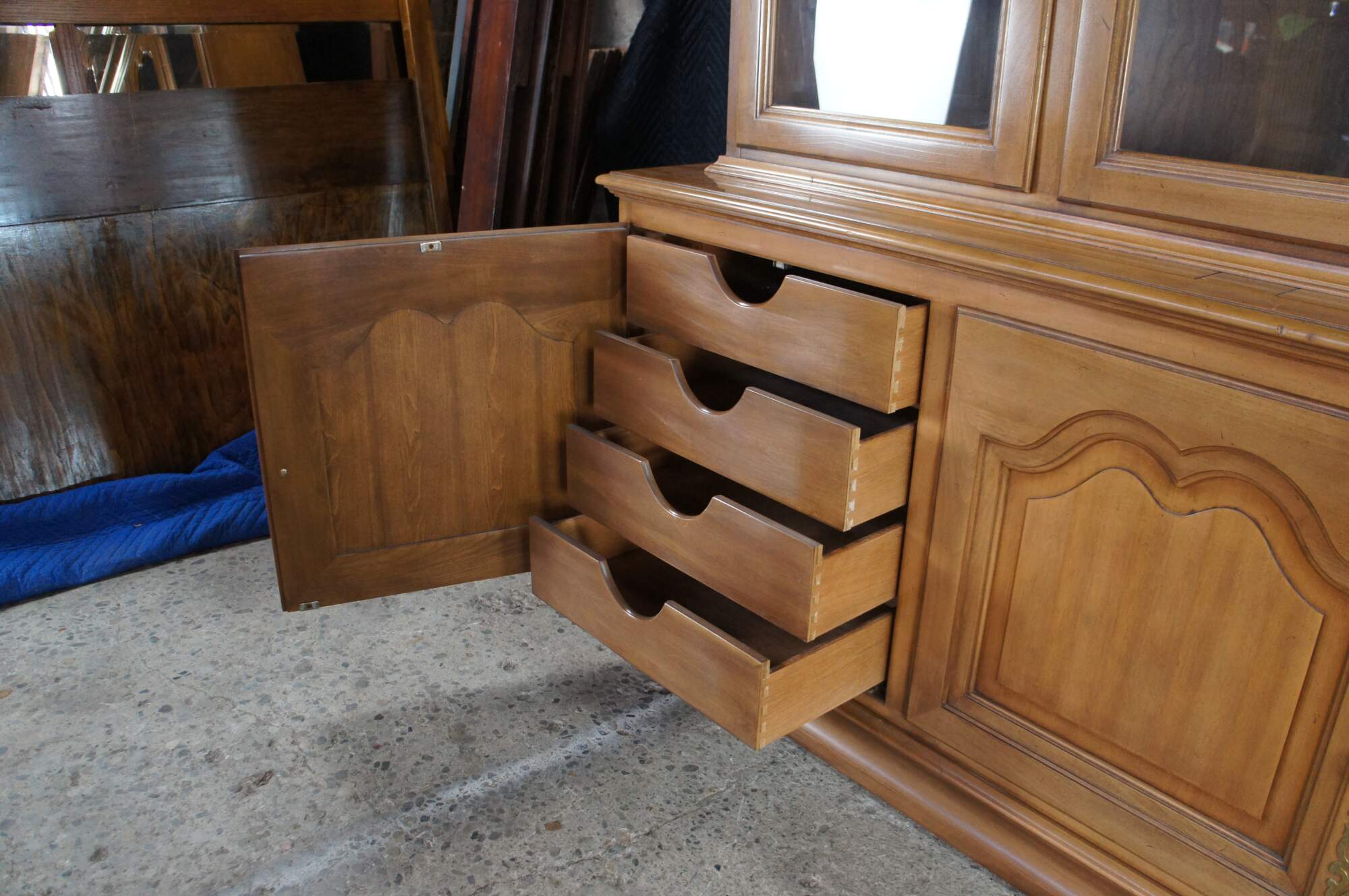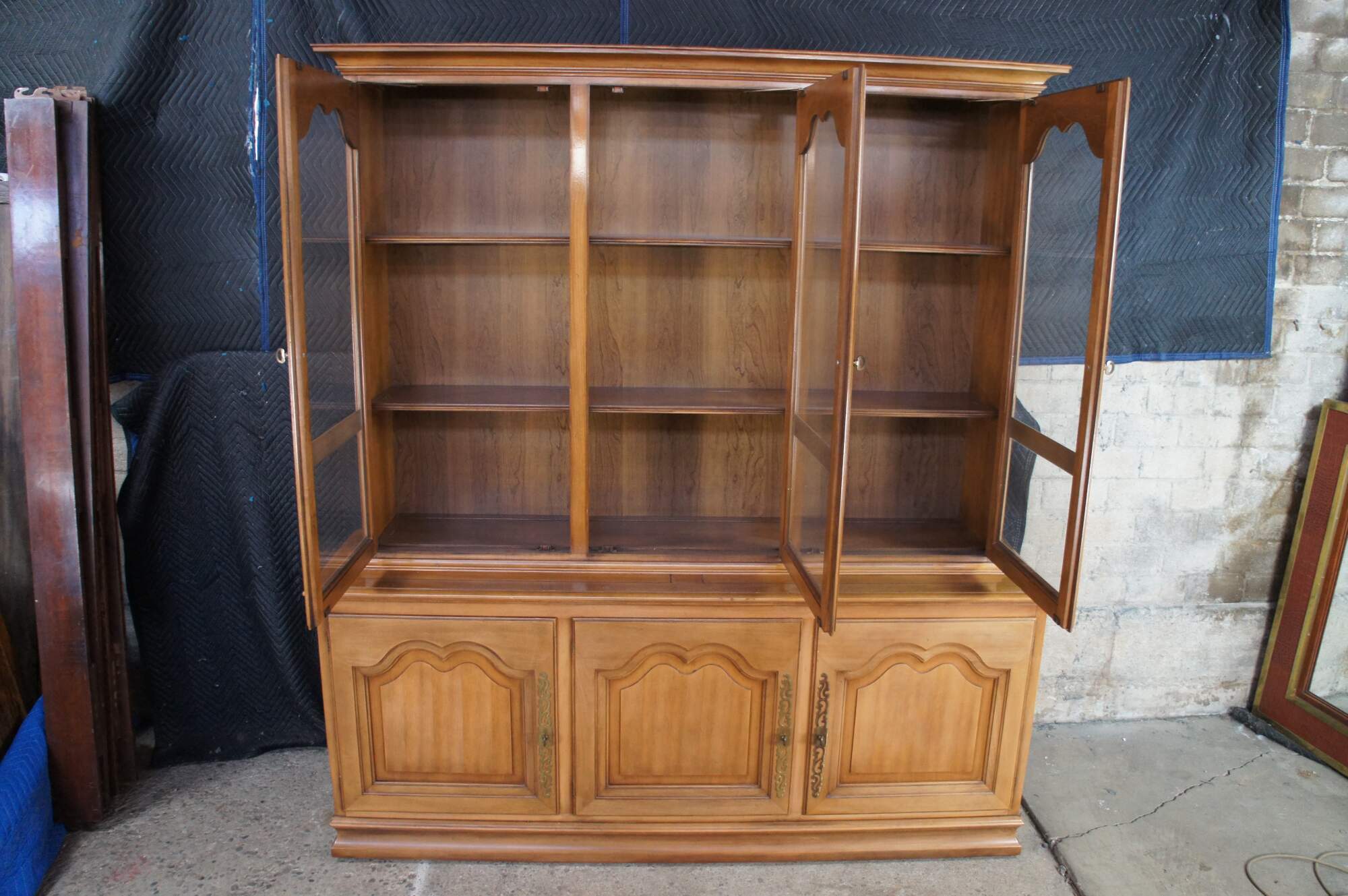 Circa 1970s Century Furniture Italian Provincial China Cabinet. Made from walnut with a stepback hutch featuring 3 shelves for display of china and collectibles. Buffet portion opens to 4 drawers and accessory storage.