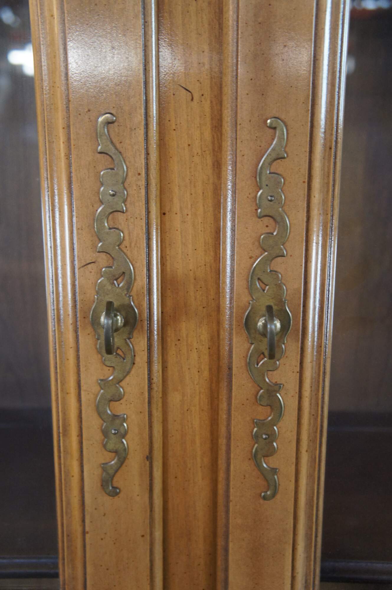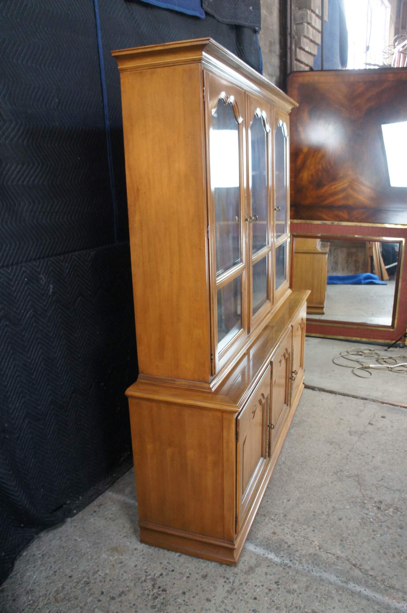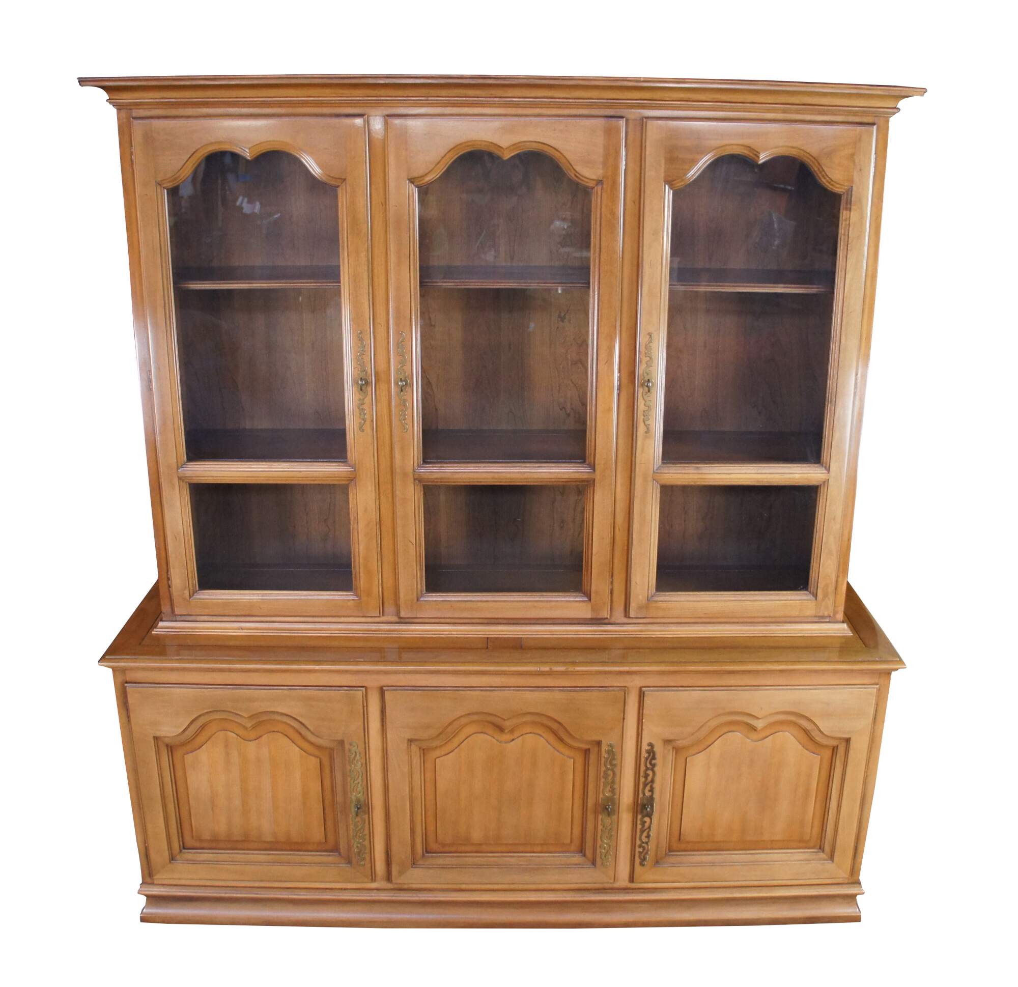 Circa 1970s Century Furniture Italian Provincial China Cabinet. Made from walnut with a stepback hutch featuring 3 shelves for display of china and collectibles. Buffet portion opens to 4 drawers and accessory storage.
