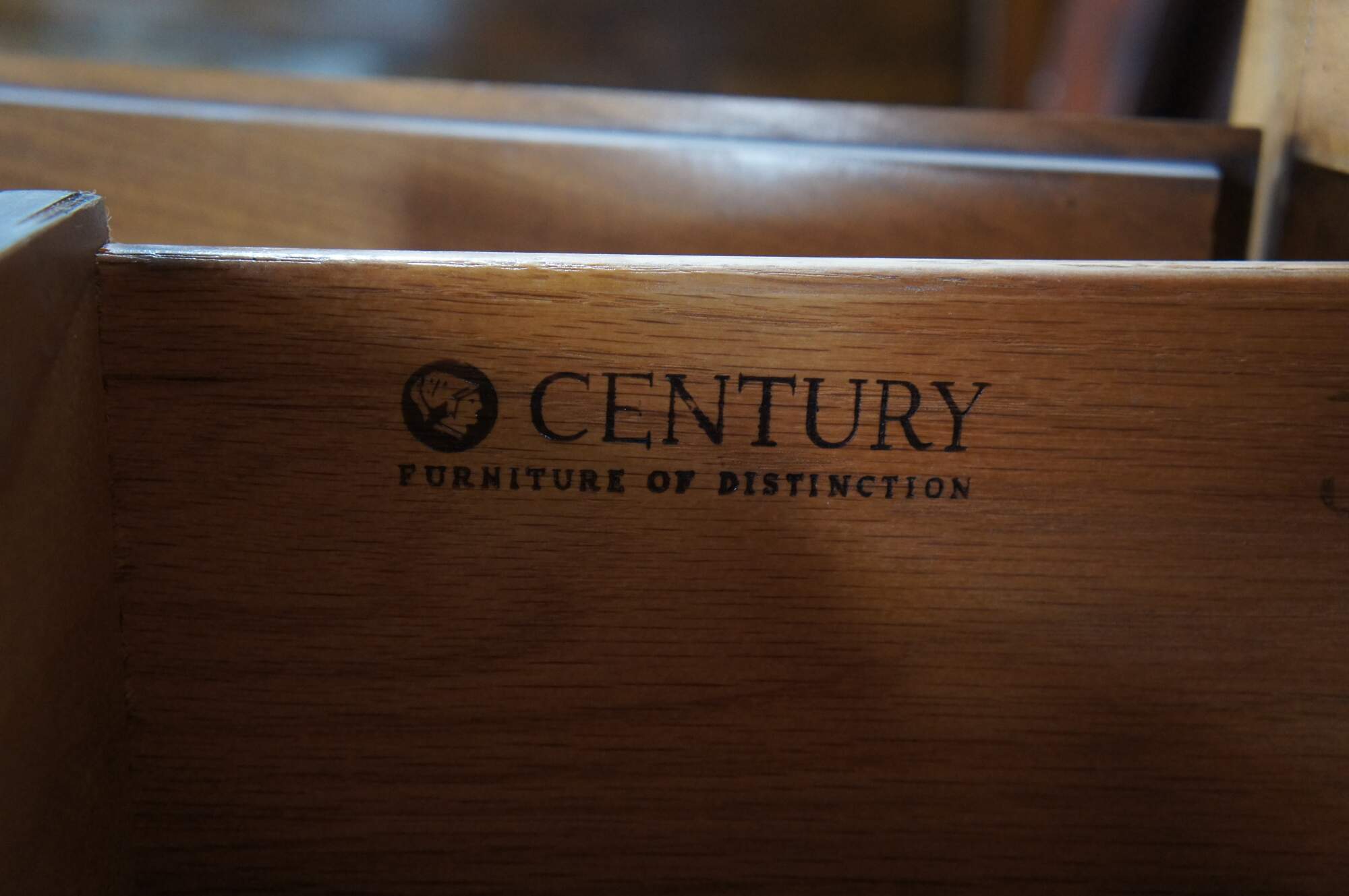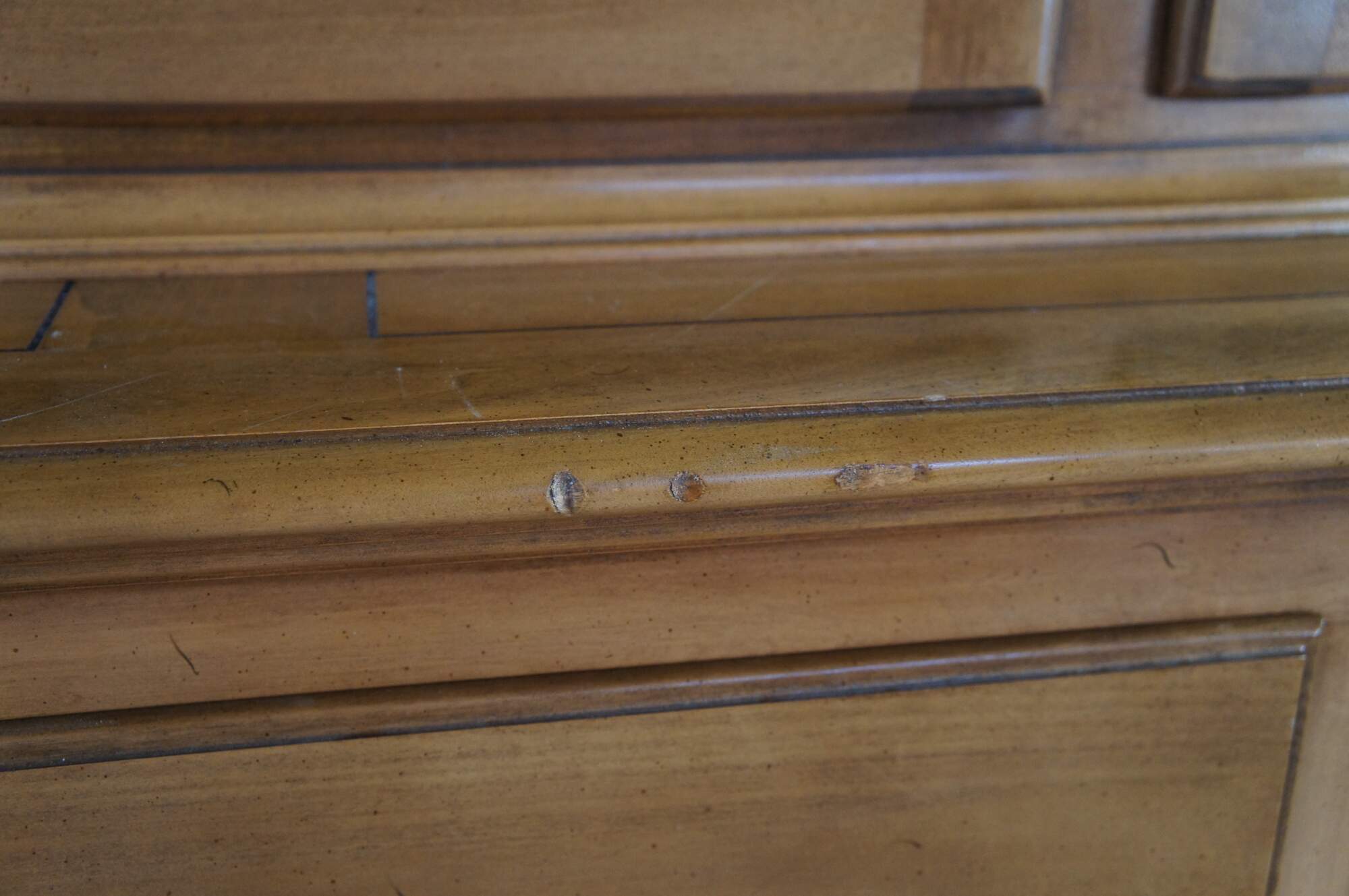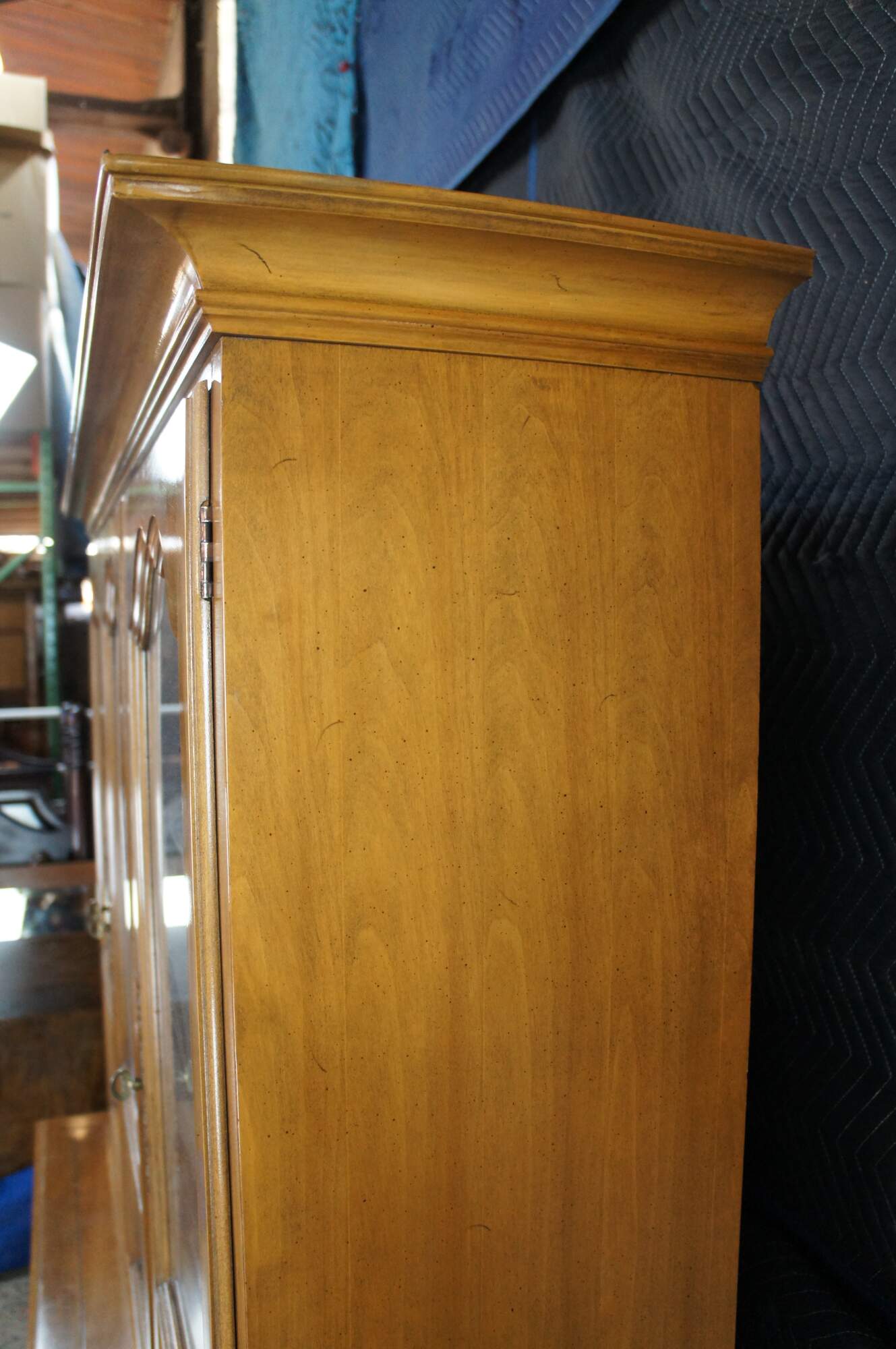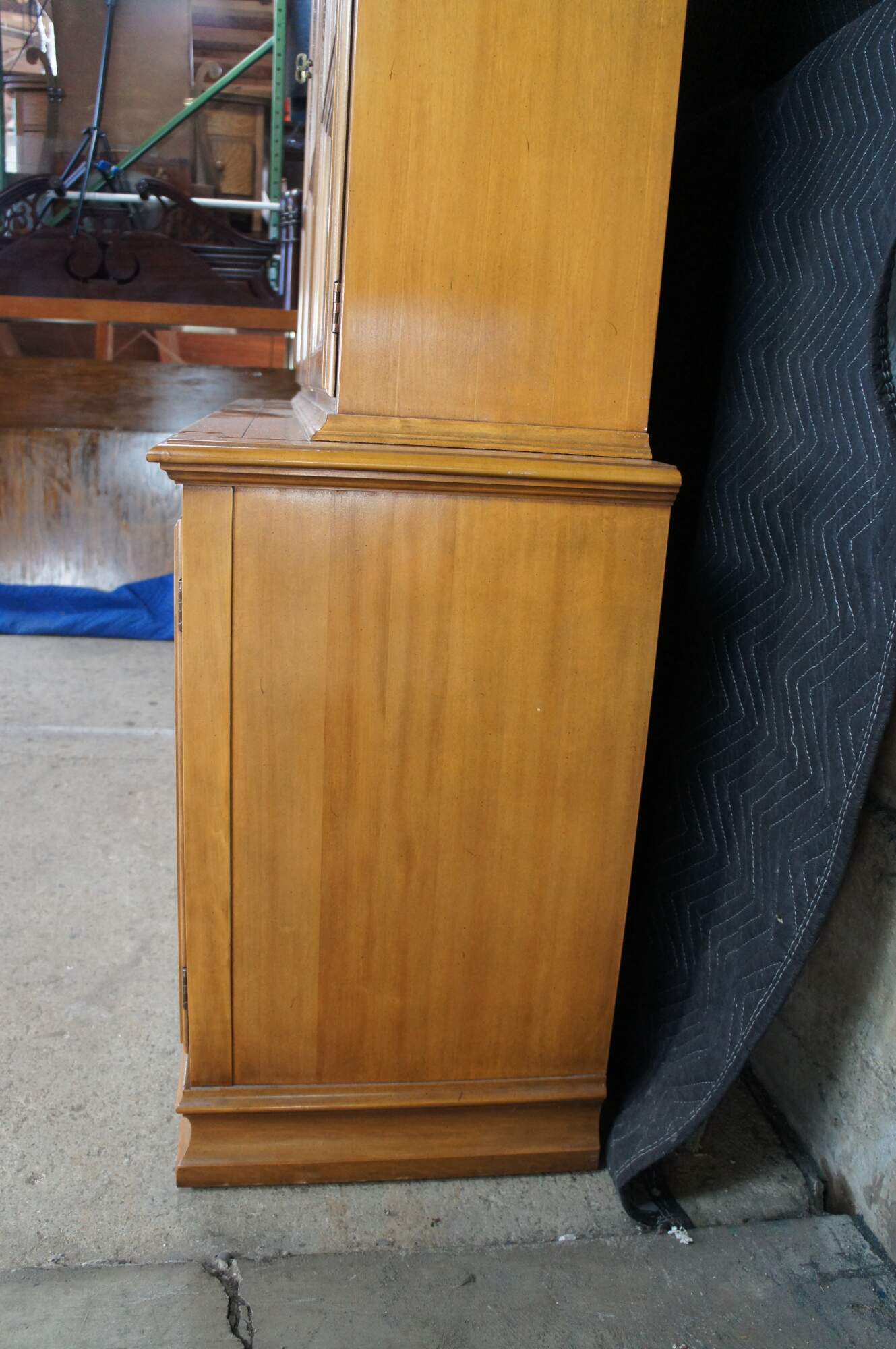 Circa 1970s Century Furniture Italian Provincial China Cabinet. Made from walnut with a stepback hutch featuring 3 shelves for display of china and collectibles. Buffet portion opens to 4 drawers and accessory storage.