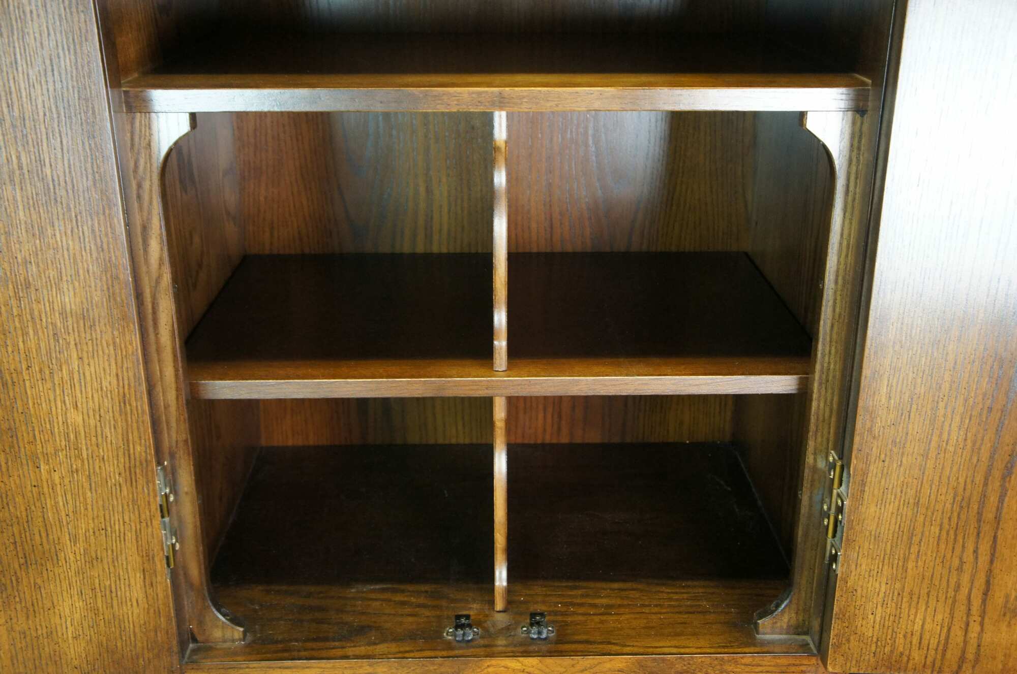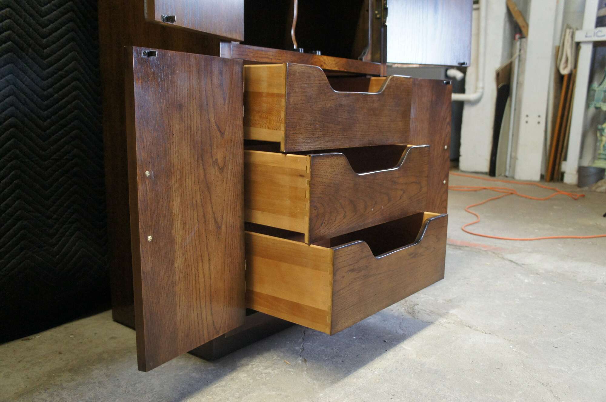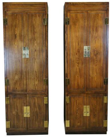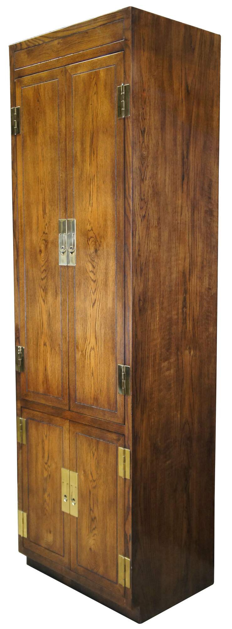 Two vintage Henredon scene I campaign style clothing armoires or wardrobe cabinets. Made of oak featuring upper shelves with four central cubbies and three lower drawers. Accented with modern brass hardware. Circa 1986s. 9100-05. 3162890.