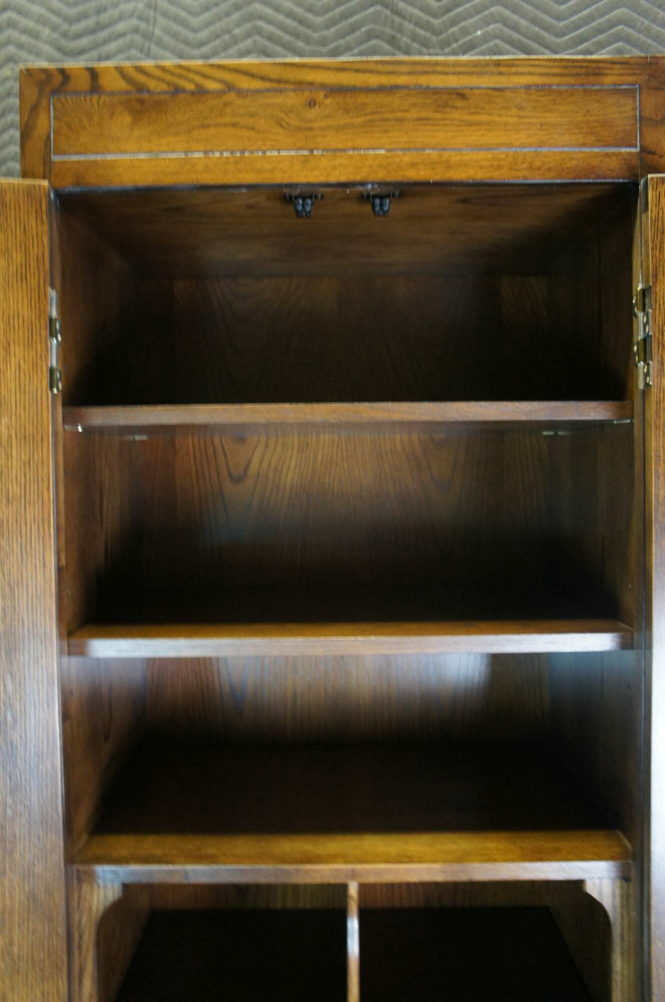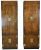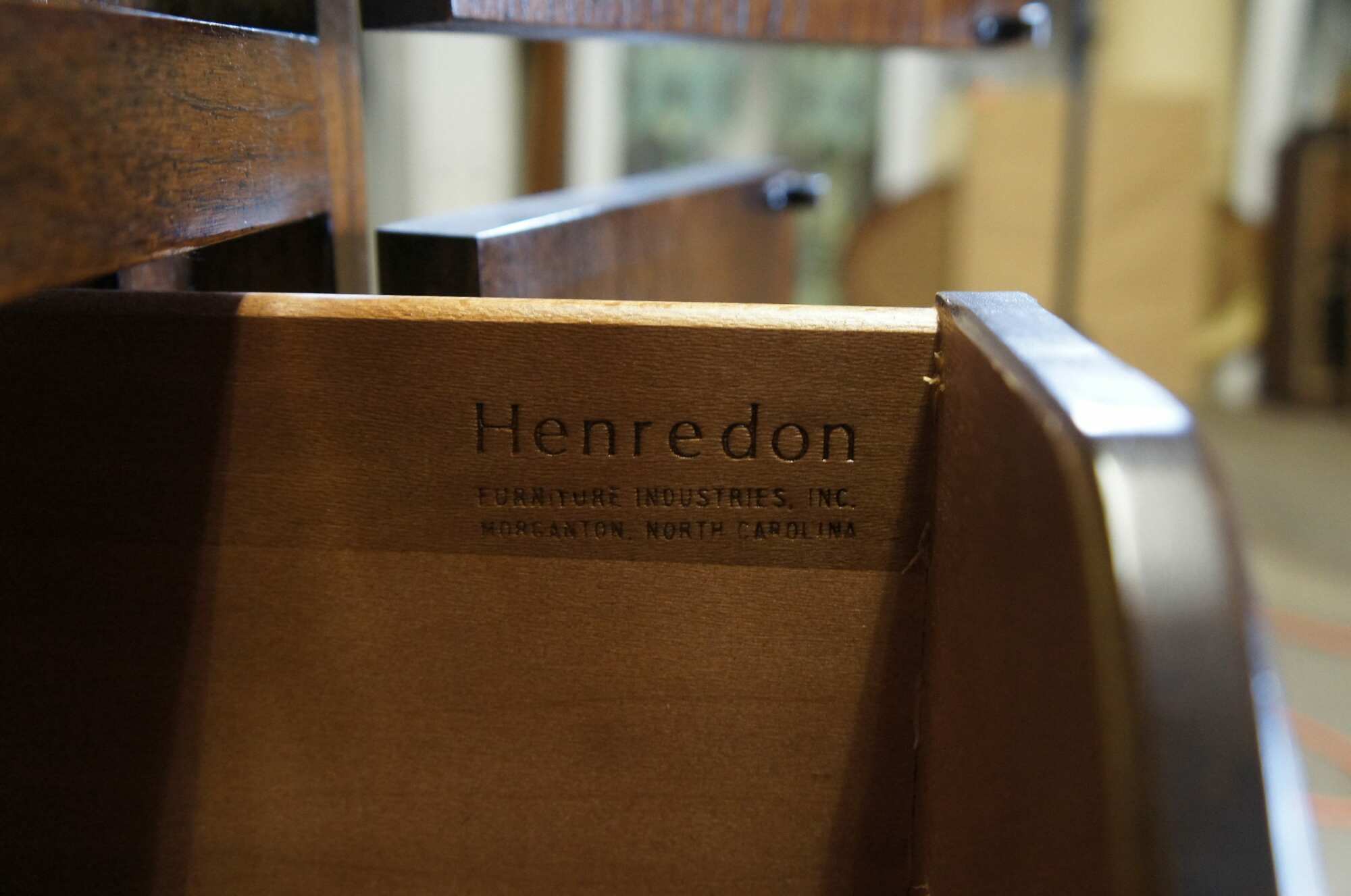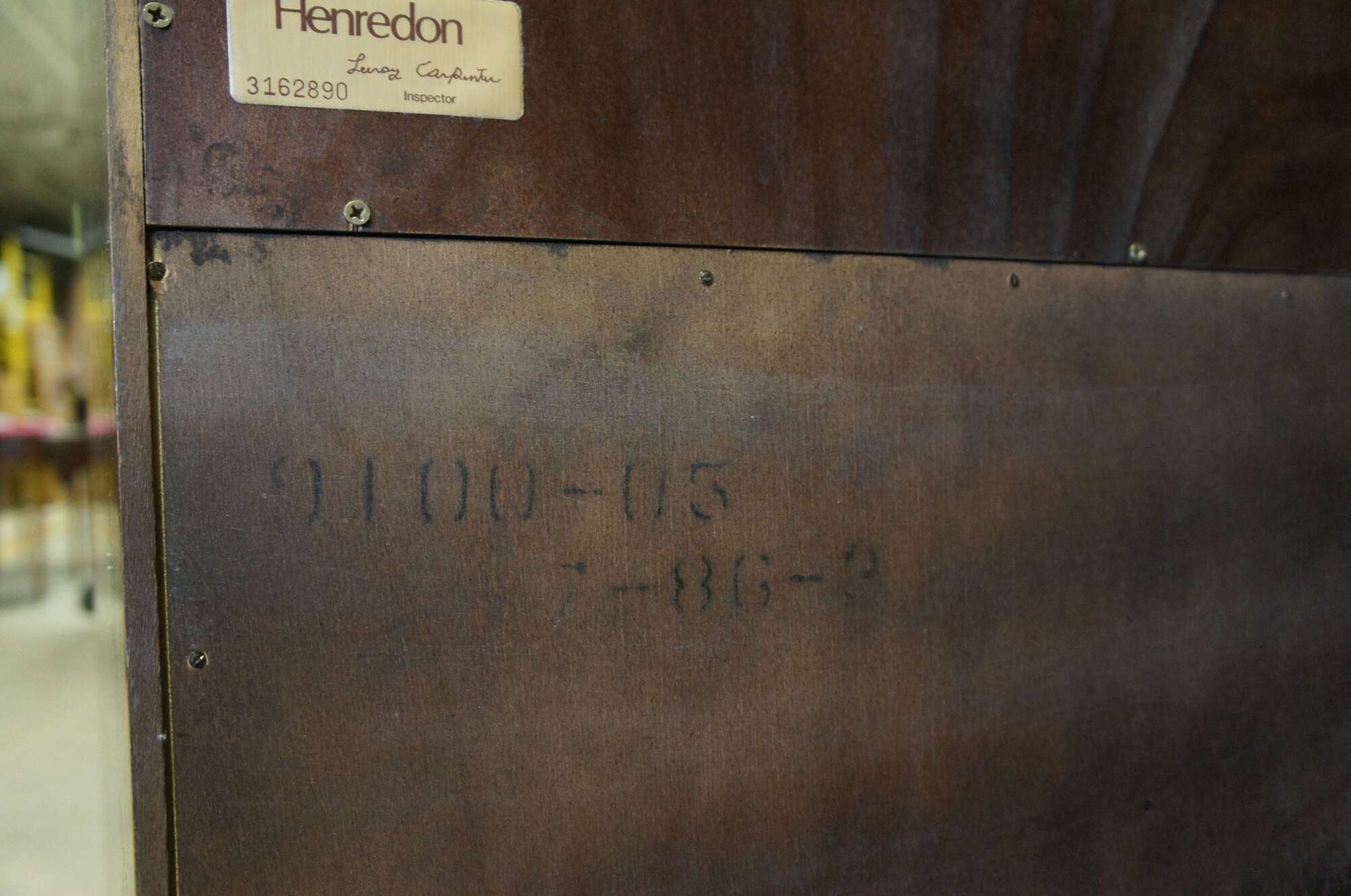 Two vintage Henredon scene I campaign style clothing armoires or wardrobe cabinets. Made of oak featuring upper shelves with four central cubbies and three lower drawers. Accented with modern brass hardware. Circa 1986s. 9100-05. 3162890.