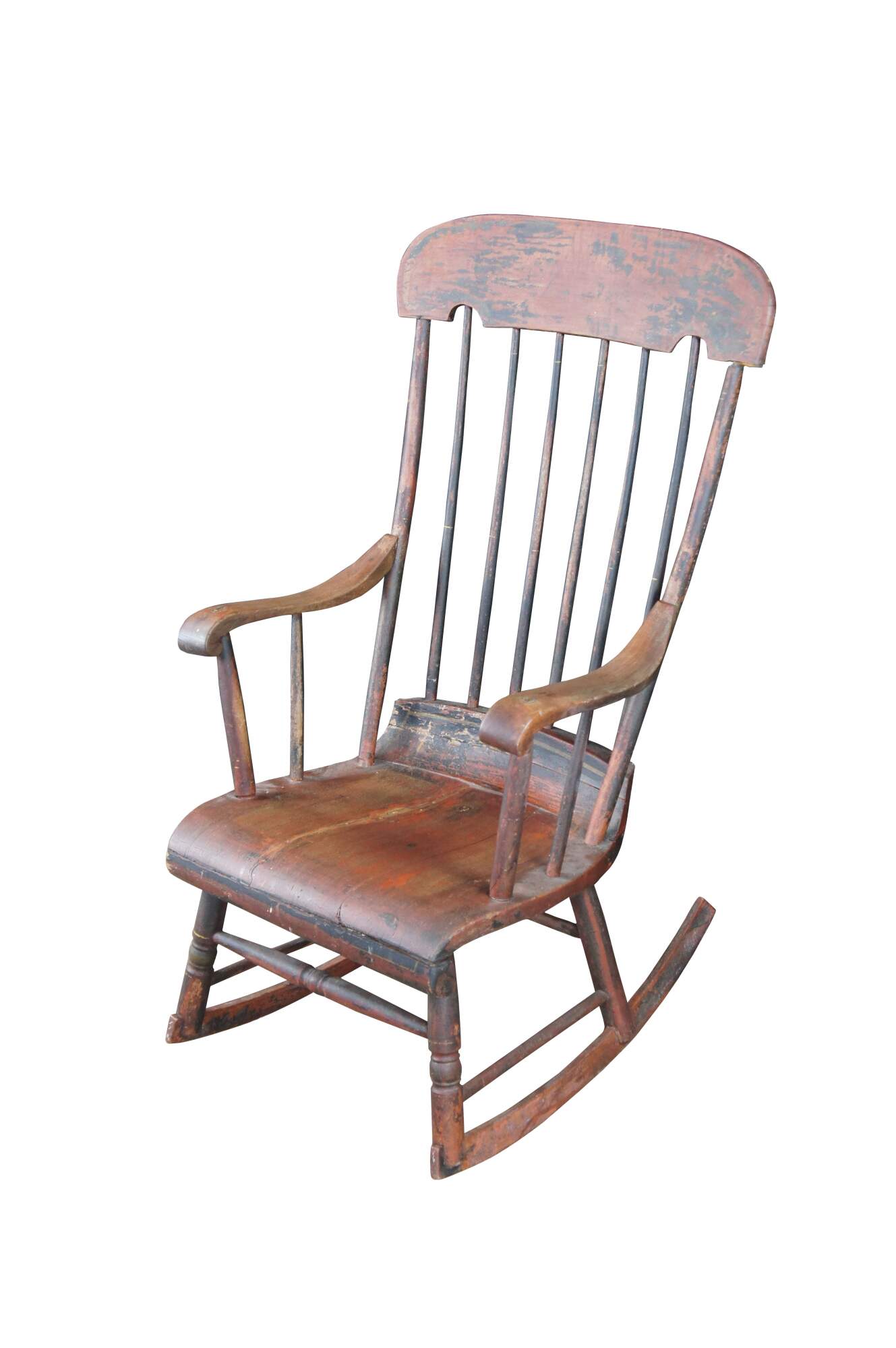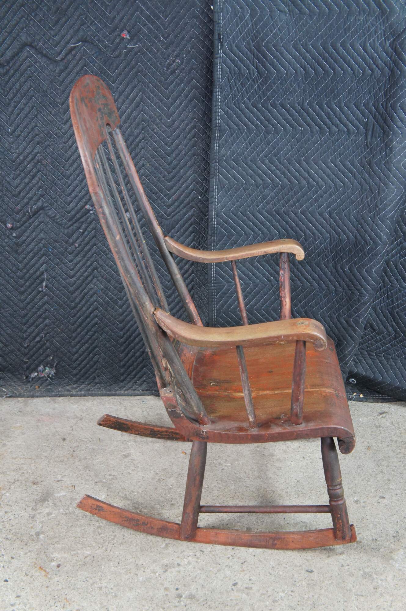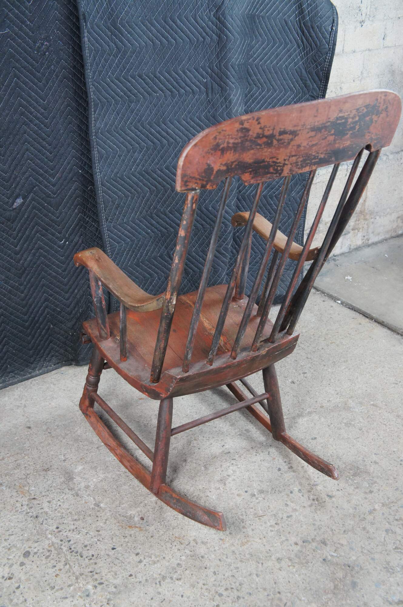 Antique Early American Country Farmhouse Windsor Hitchcock style slat back rocking armchair. Likely an old Boston stenciled rocker, but has been repainted / heavily faded.