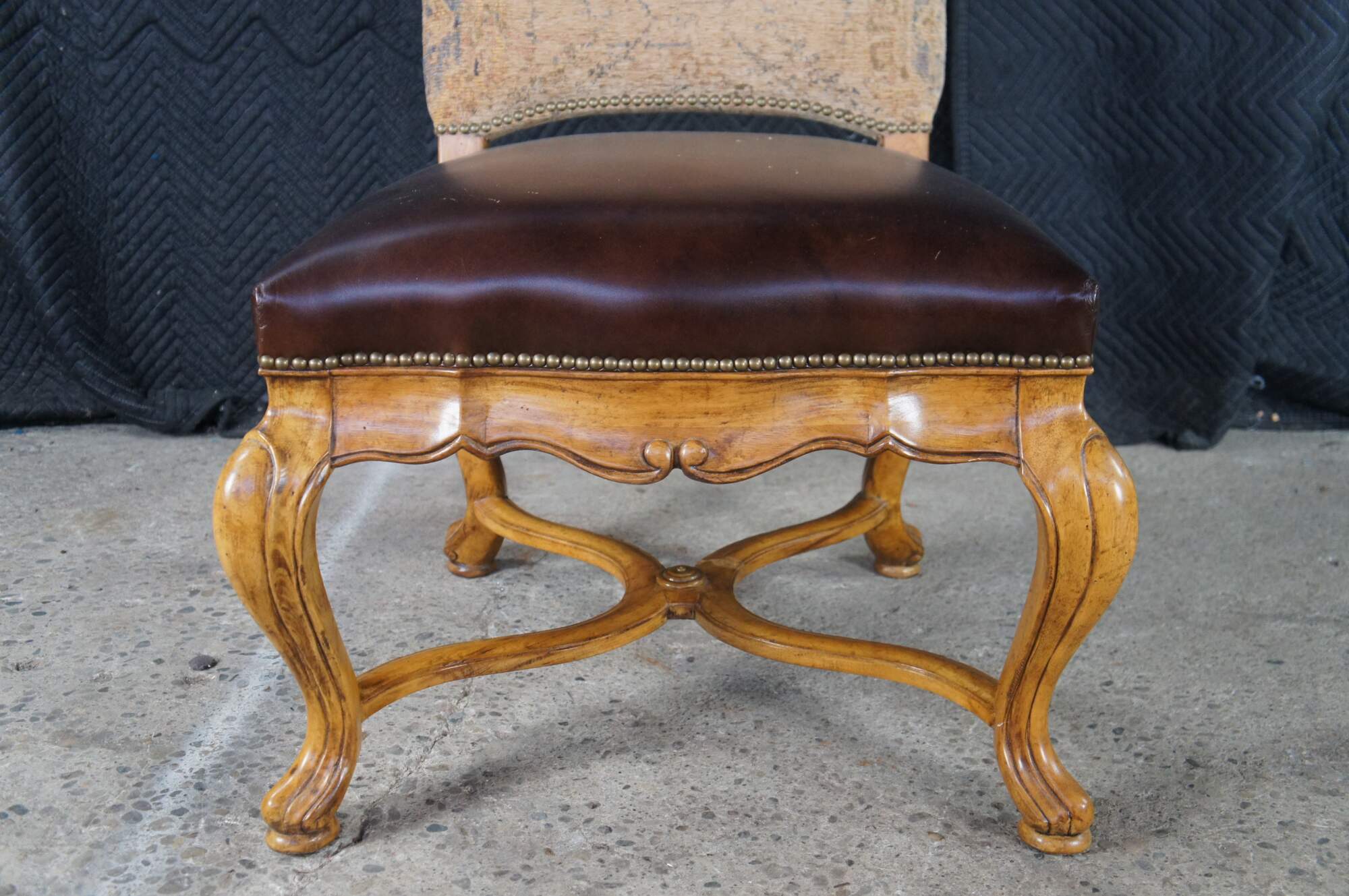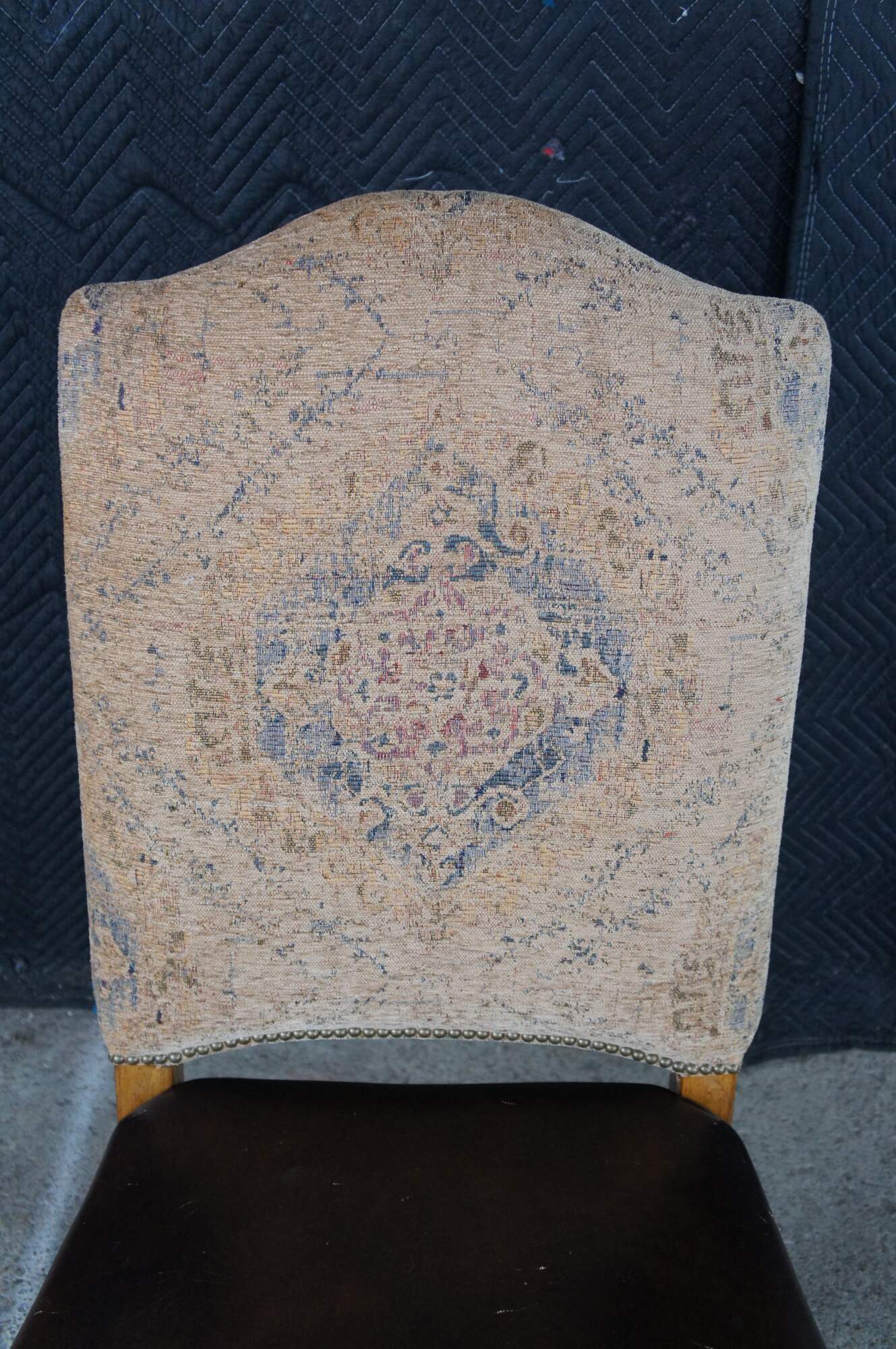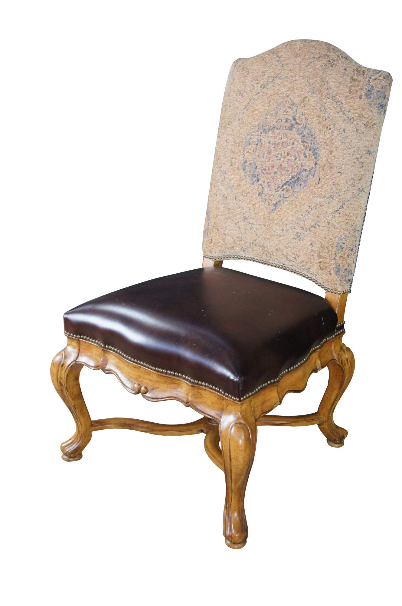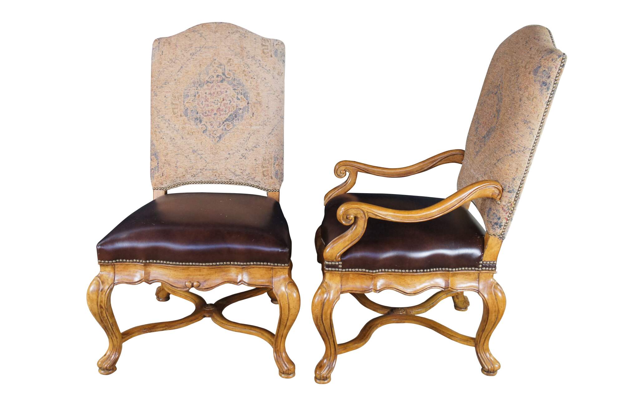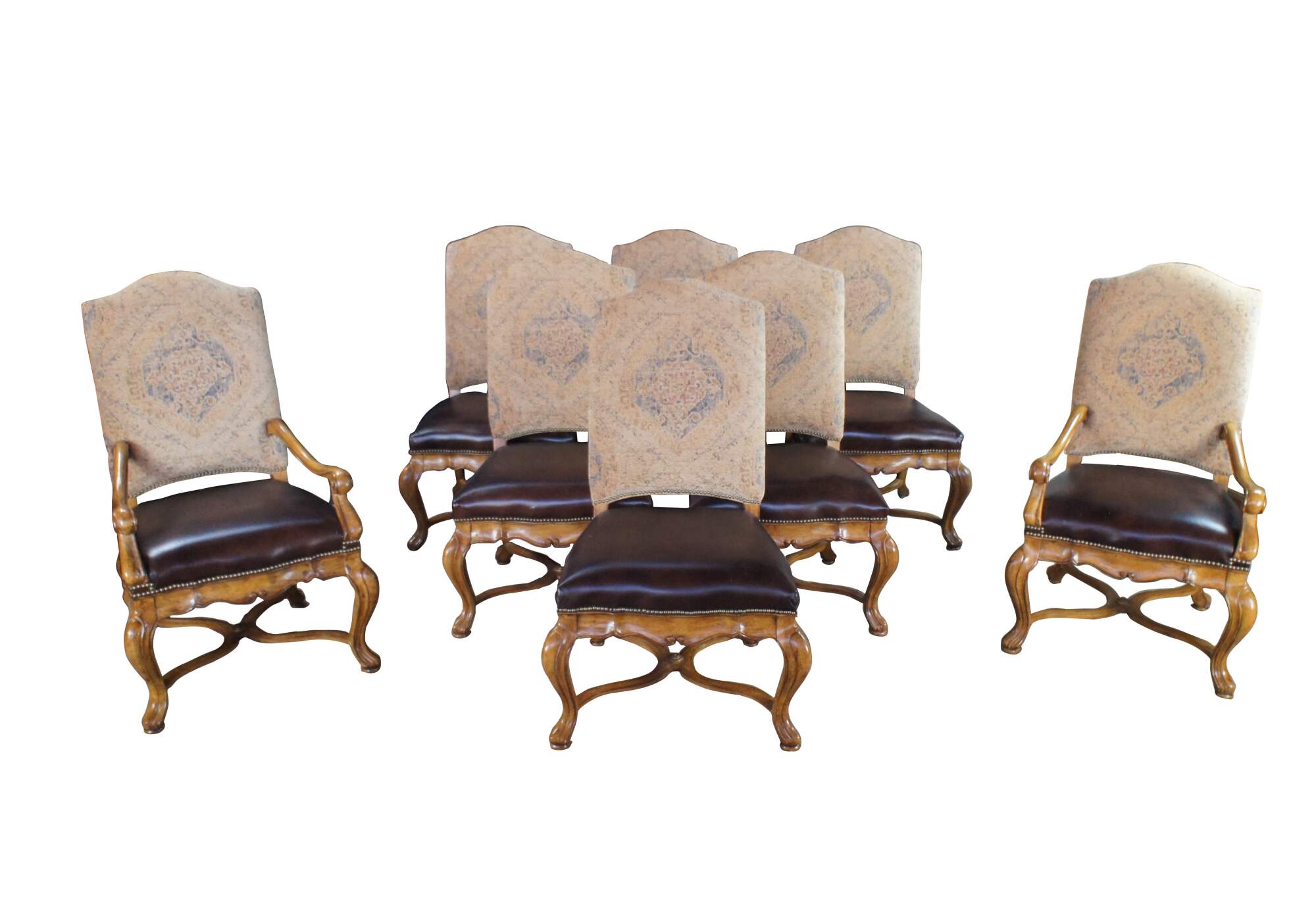 Eight vintage dining chairs from the Hills of Tuscany collection by Thomasville Furniture. The chairs are finished in Bibbiano Dark Rustico with brown leathers seats, oriental rug style fabric, brass nailheads trim and serpentine legs with X-stretchers.