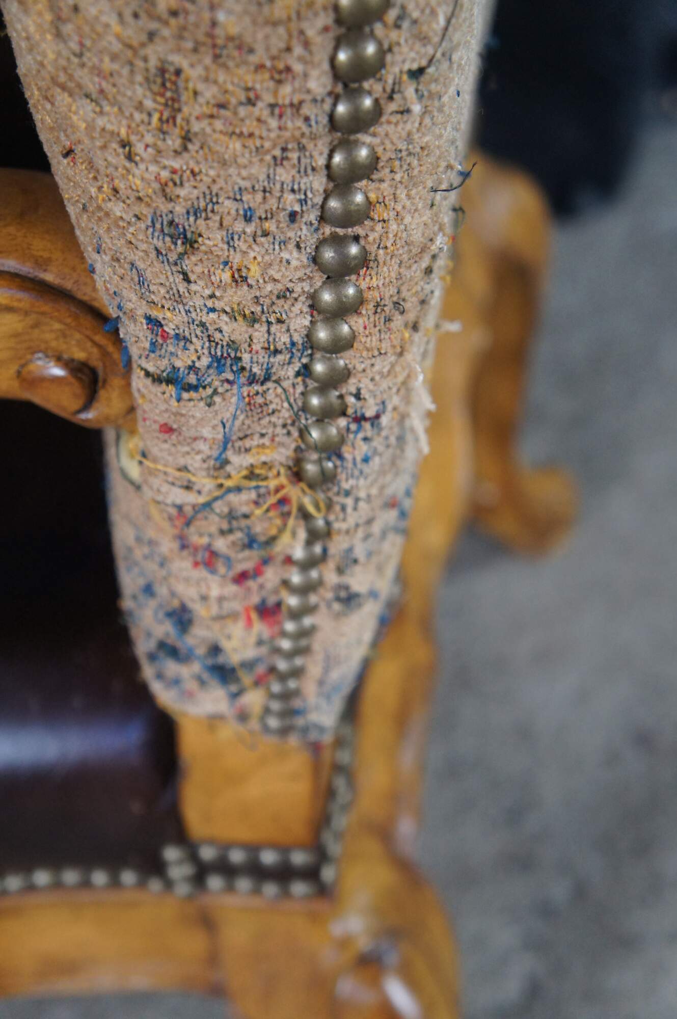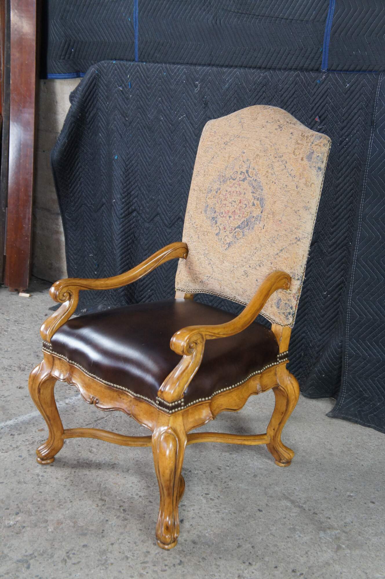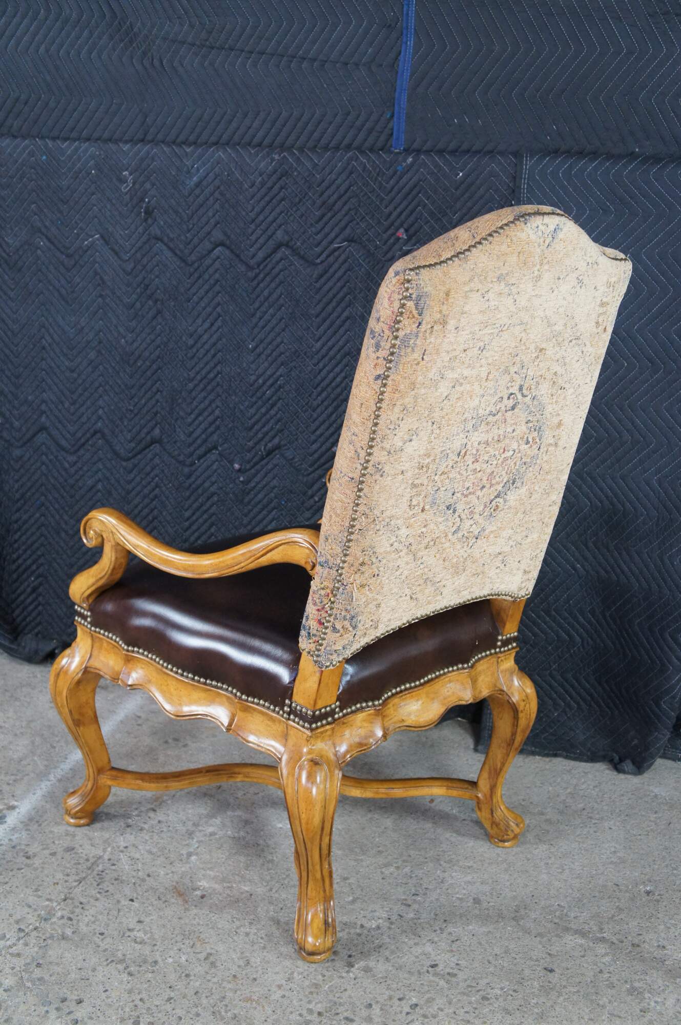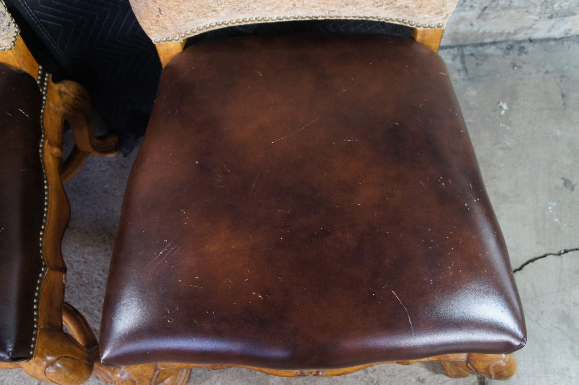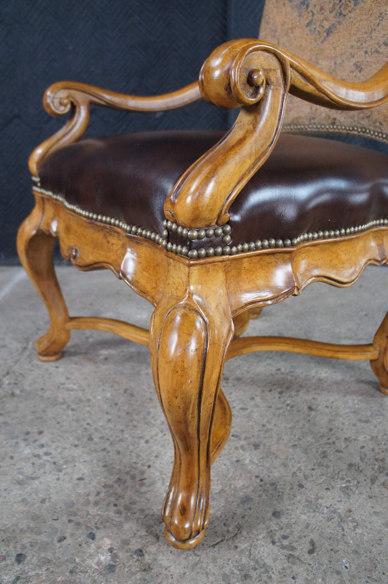 Eight vintage dining chairs from the Hills of Tuscany collection by Thomasville Furniture. The chairs are finished in Bibbiano Dark Rustico with brown leathers seats, oriental rug style fabric, brass nailheads trim and serpentine legs with X-stretchers.