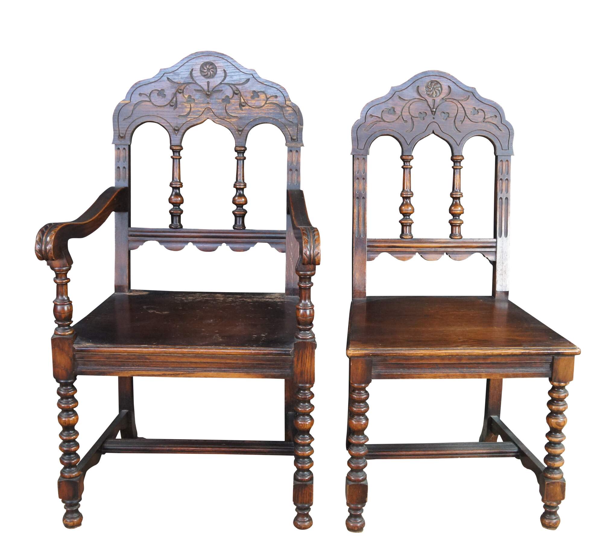 Antique set of six dining chairs featuring Jacobean and Spanish Revival styling. Made of oak with arched gothic back, floral carved accents, and turned posts connected by H stretcher.