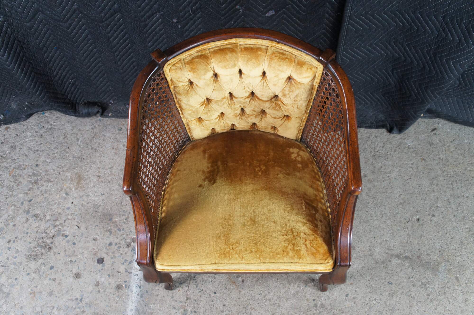 Vintage French Louis XVI style bergere arm chair. Made of walnut featuring a barrel back with tufted velvet upholstery and caned sides.