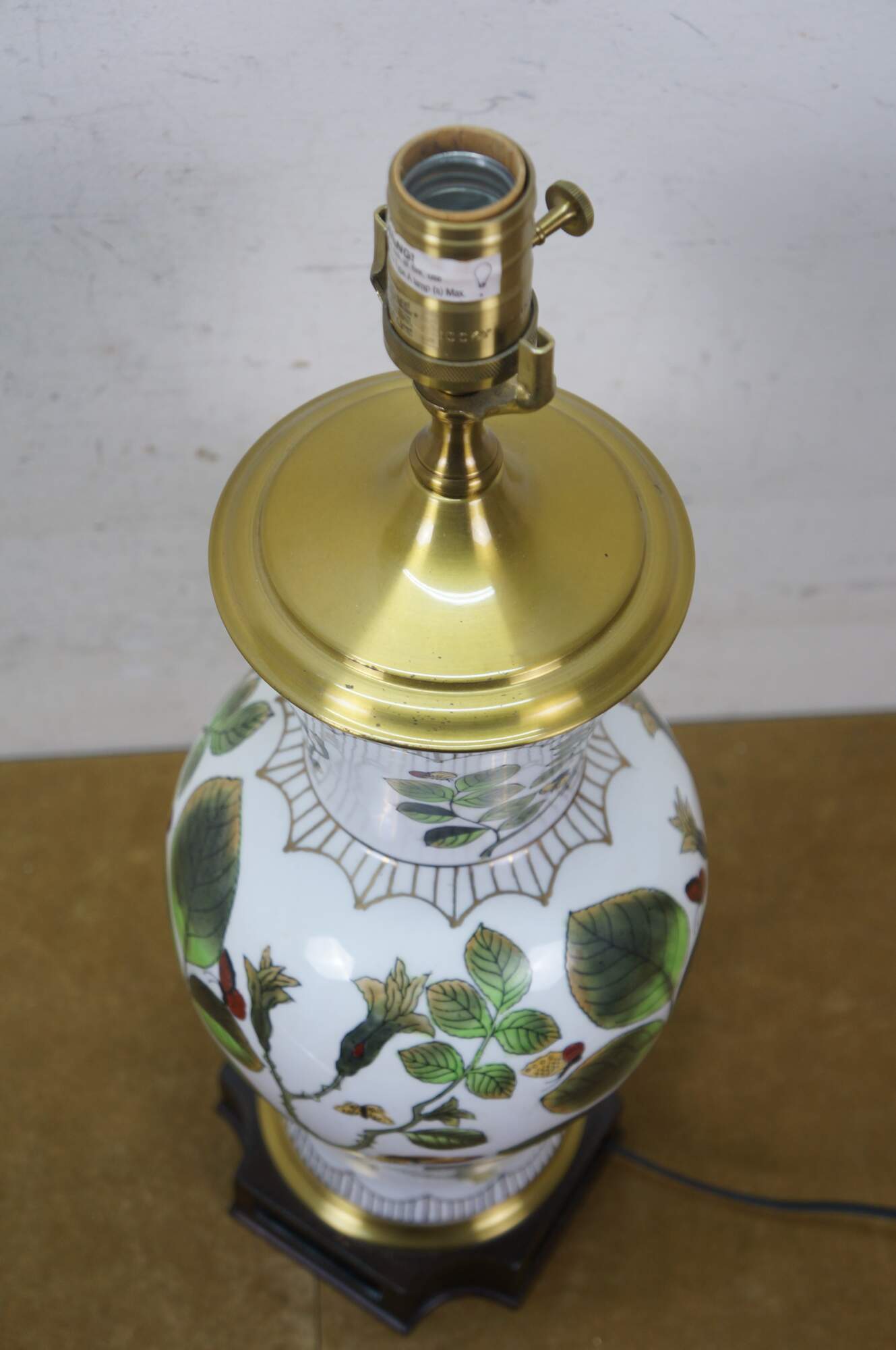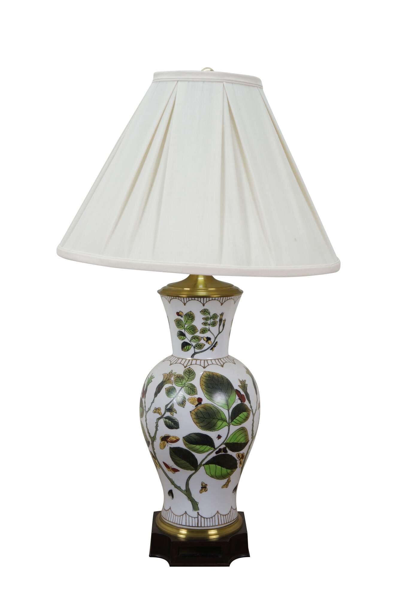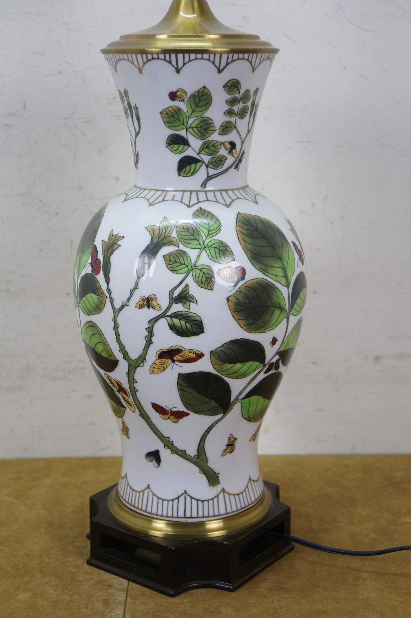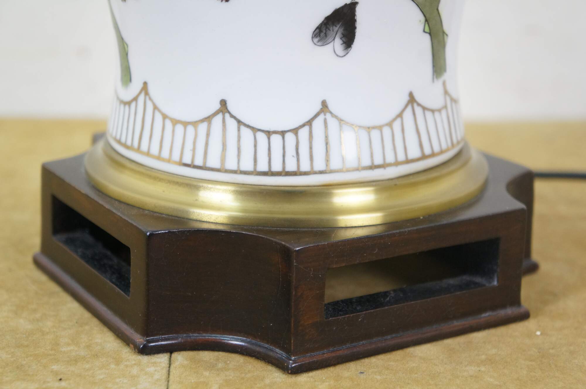 Circa 1980's Wildwood table lamp - Chinoiserie style white porcelain vase shaped body, hand painted with leaves, branches and butterflies, brass accents and a squared off wooden base. Includes harp, orb finial, and white fabric shade.