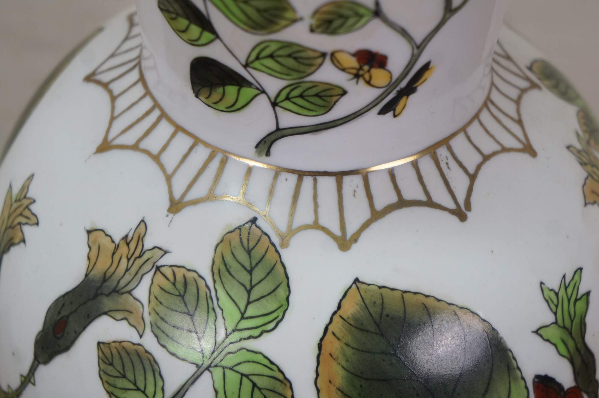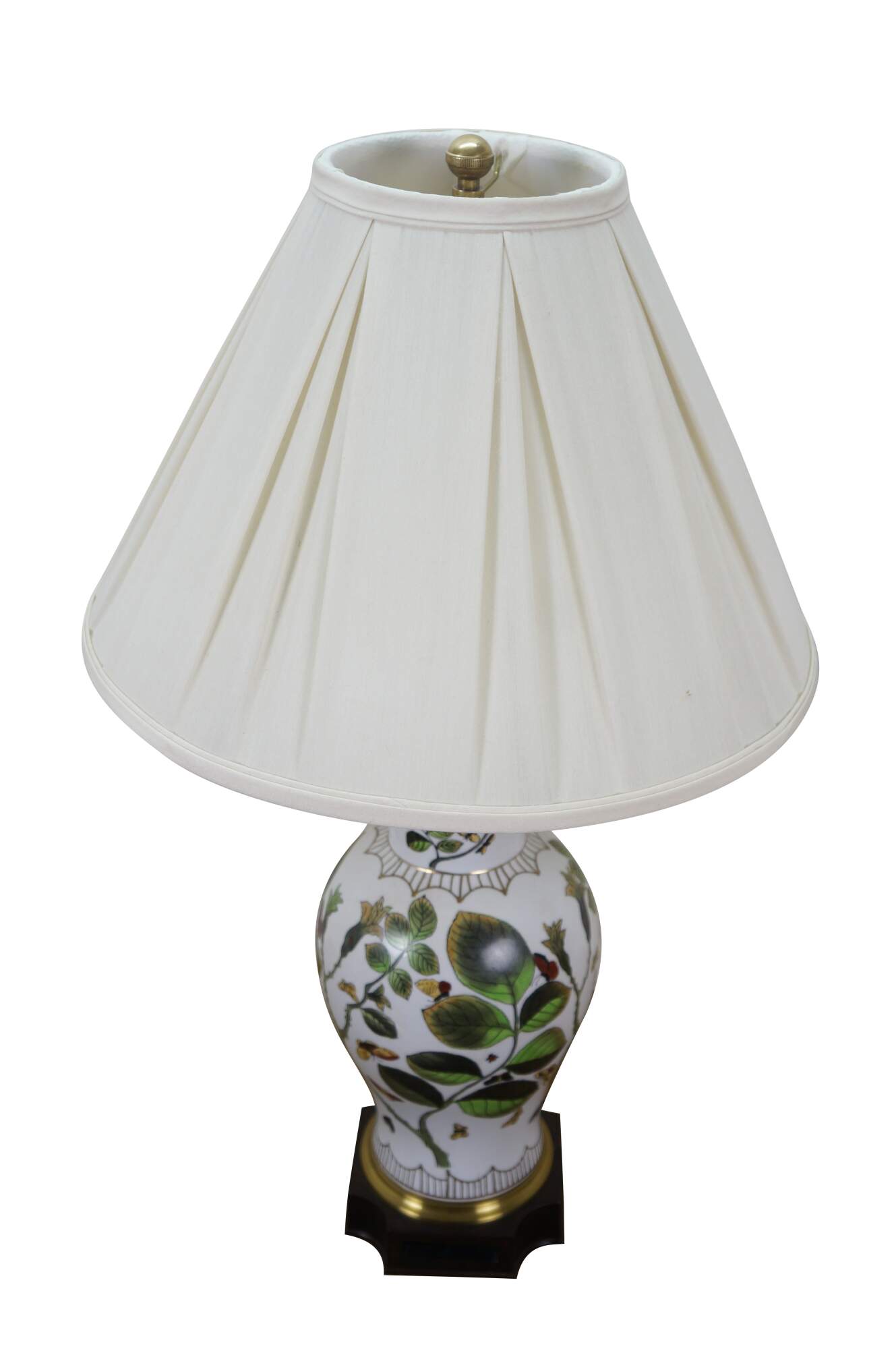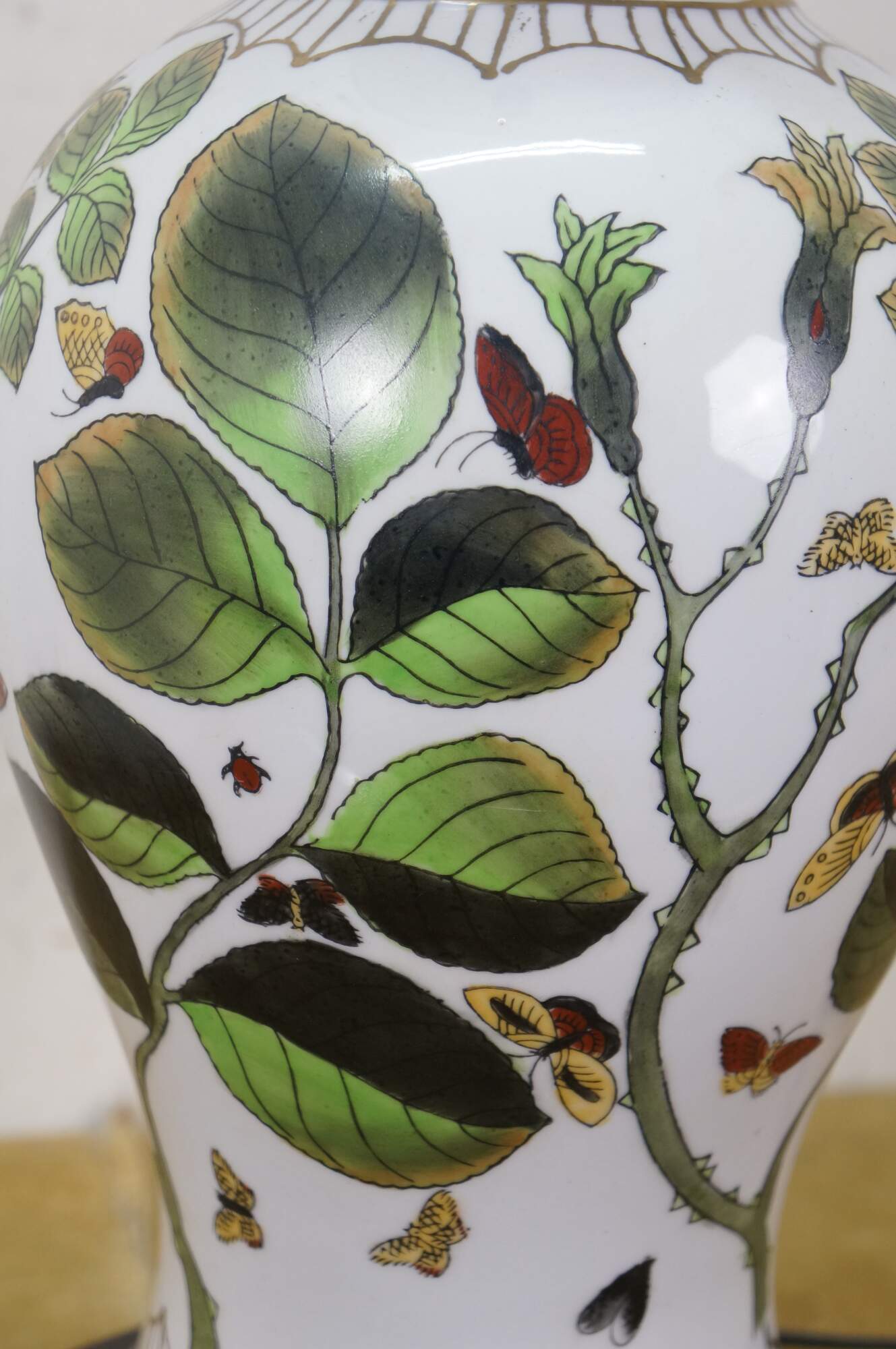 Circa 1980's Wildwood table lamp - Chinoiserie style white porcelain vase shaped body, hand painted with leaves, branches and butterflies, brass accents and a squared off wooden base. Includes harp, orb finial, and white fabric shade.
