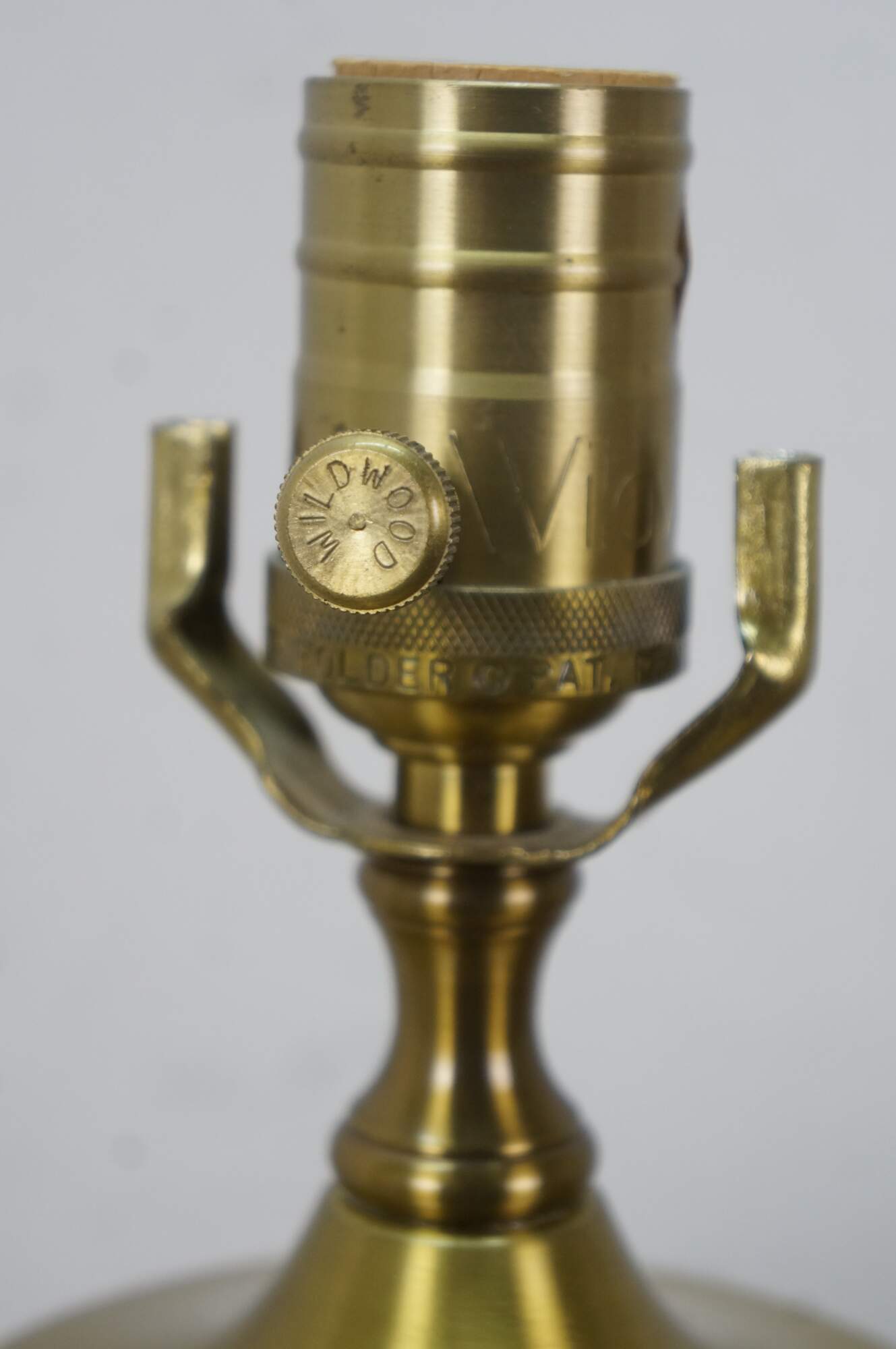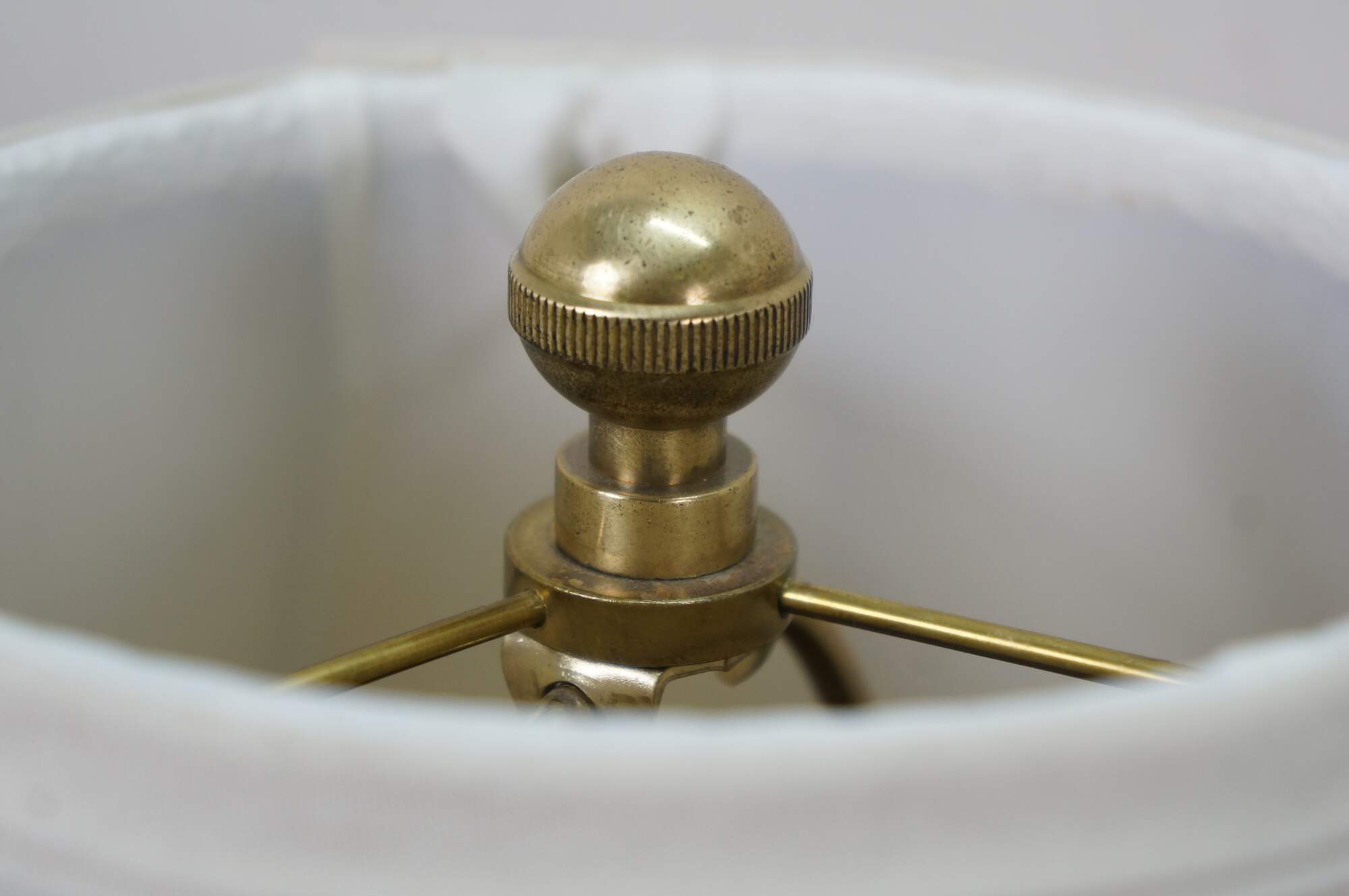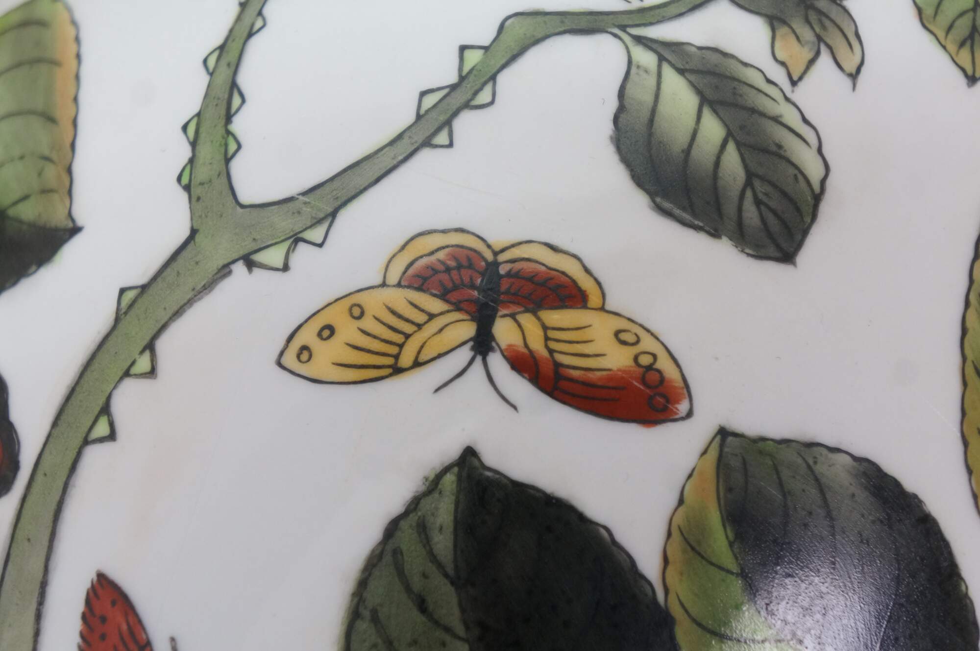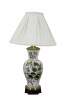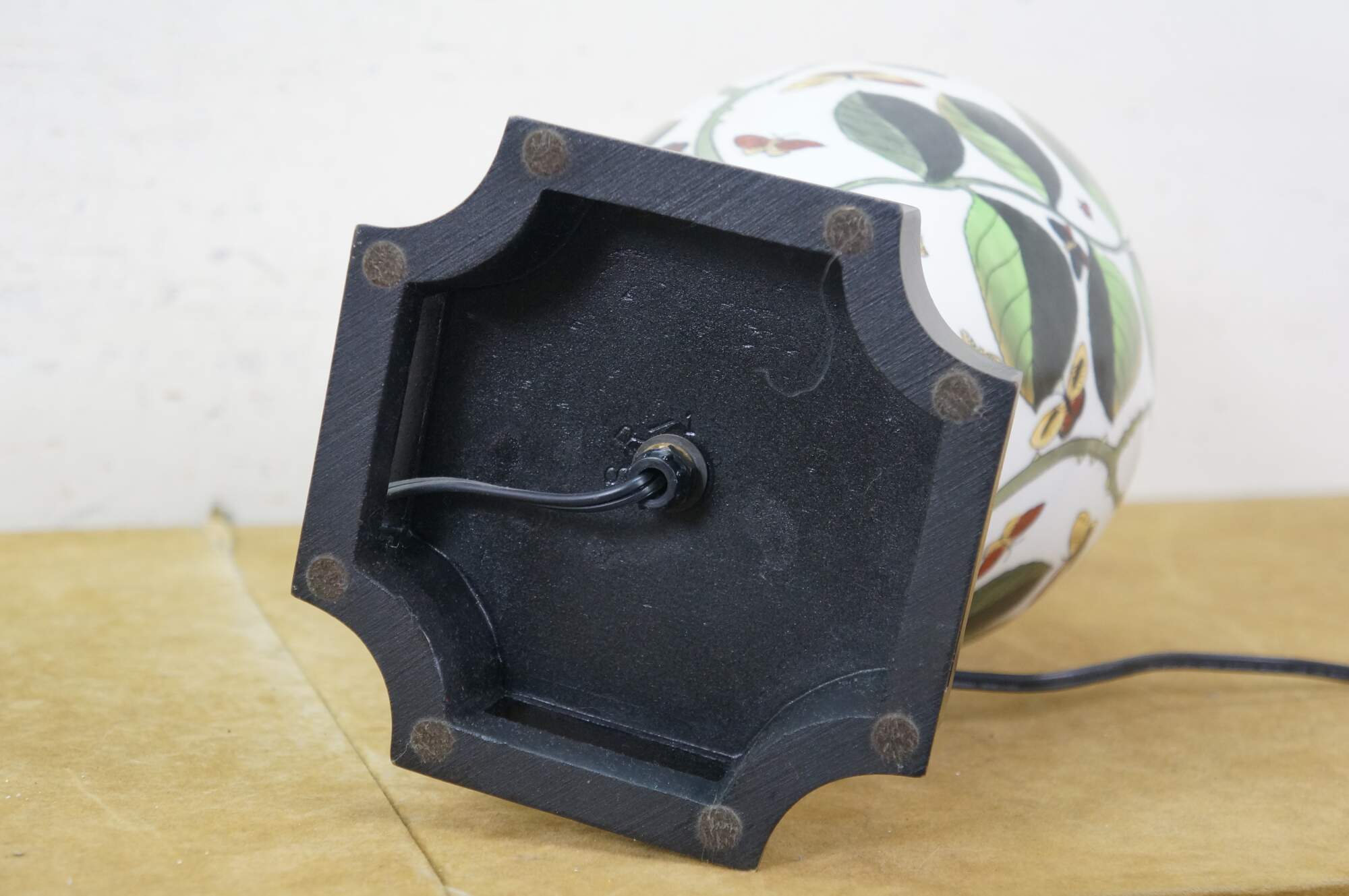 Circa 1980's Wildwood table lamp - Chinoiserie style white porcelain vase shaped body, hand painted with leaves, branches and butterflies, brass accents and a squared off wooden base. Includes harp, orb finial, and white fabric shade.