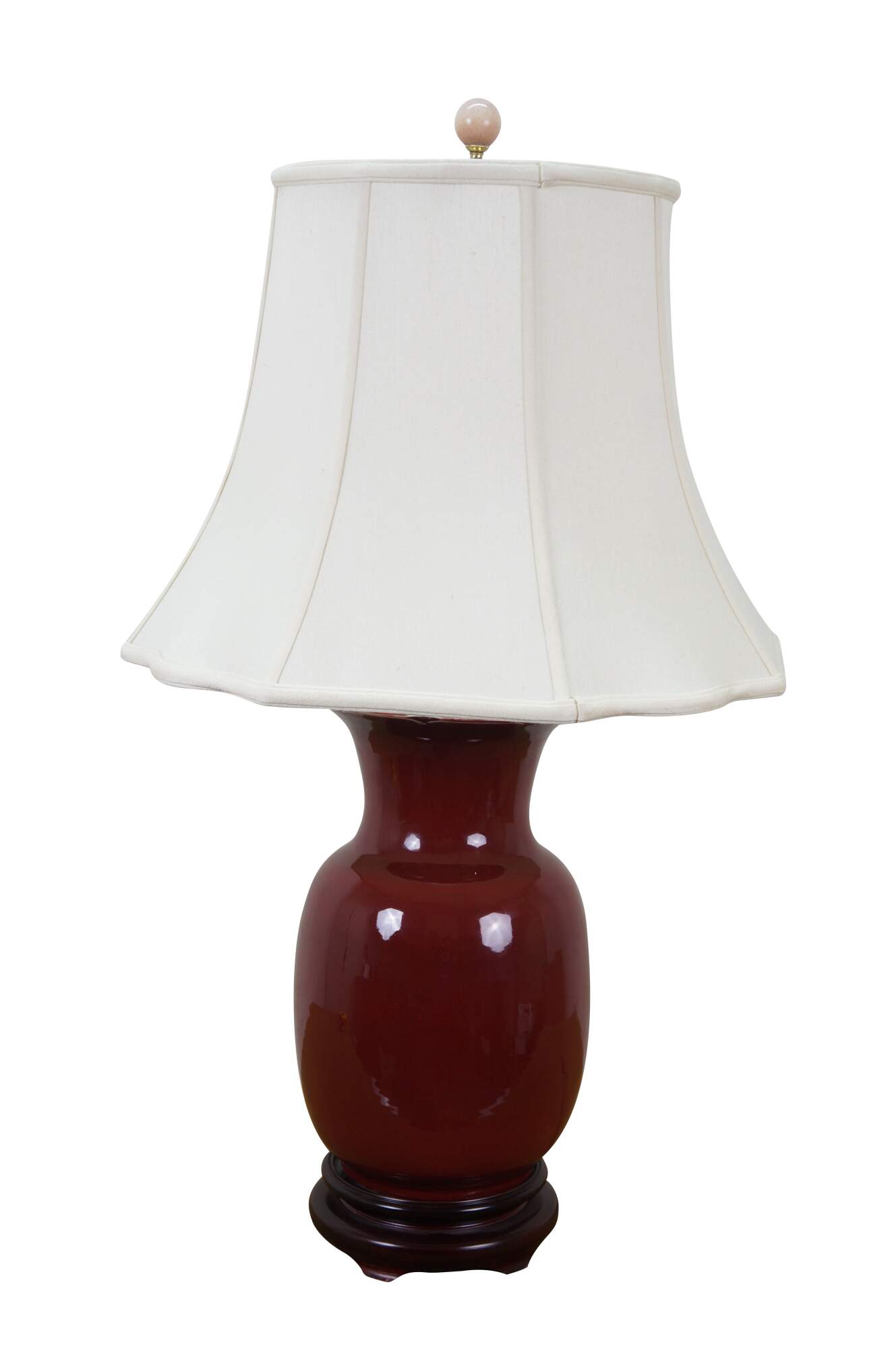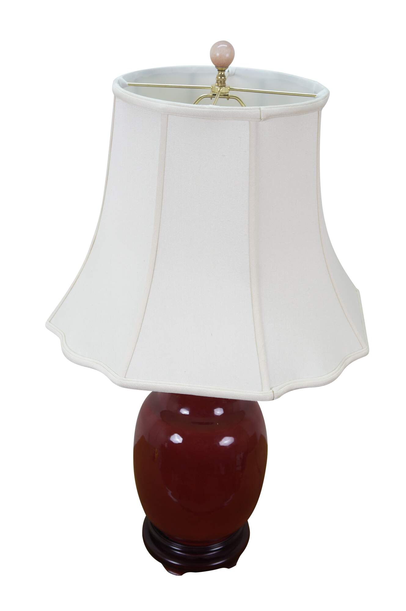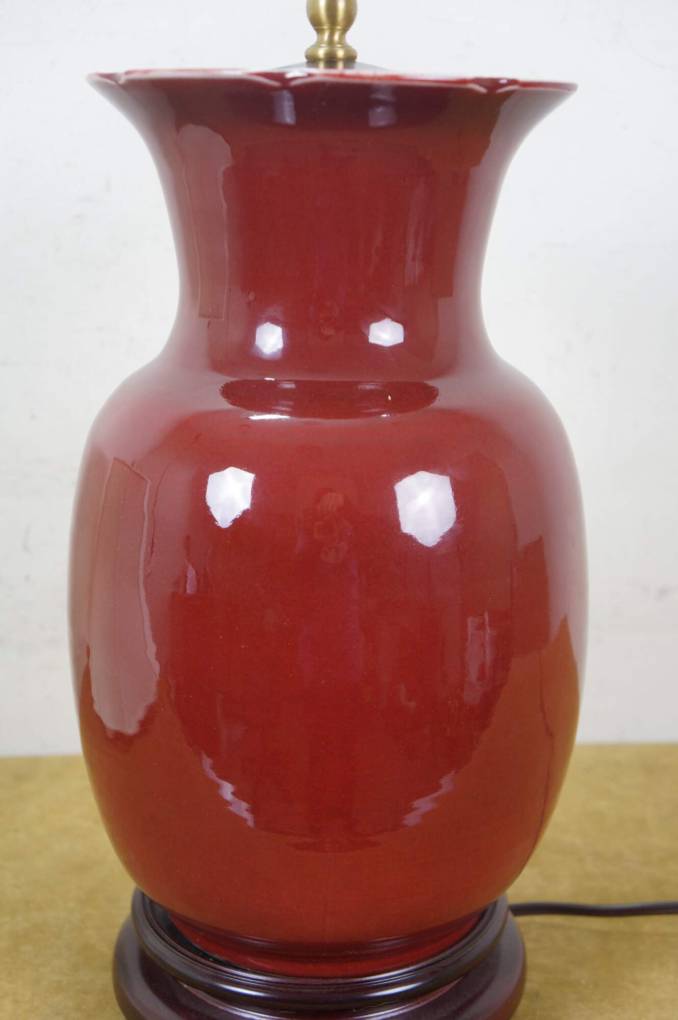 Late 20th century Chinoiserie vase shaped oxblood red porcelain table lamp with wooden base. Includes harp, pink glass orb finial, and white fabric shade. Made in China.