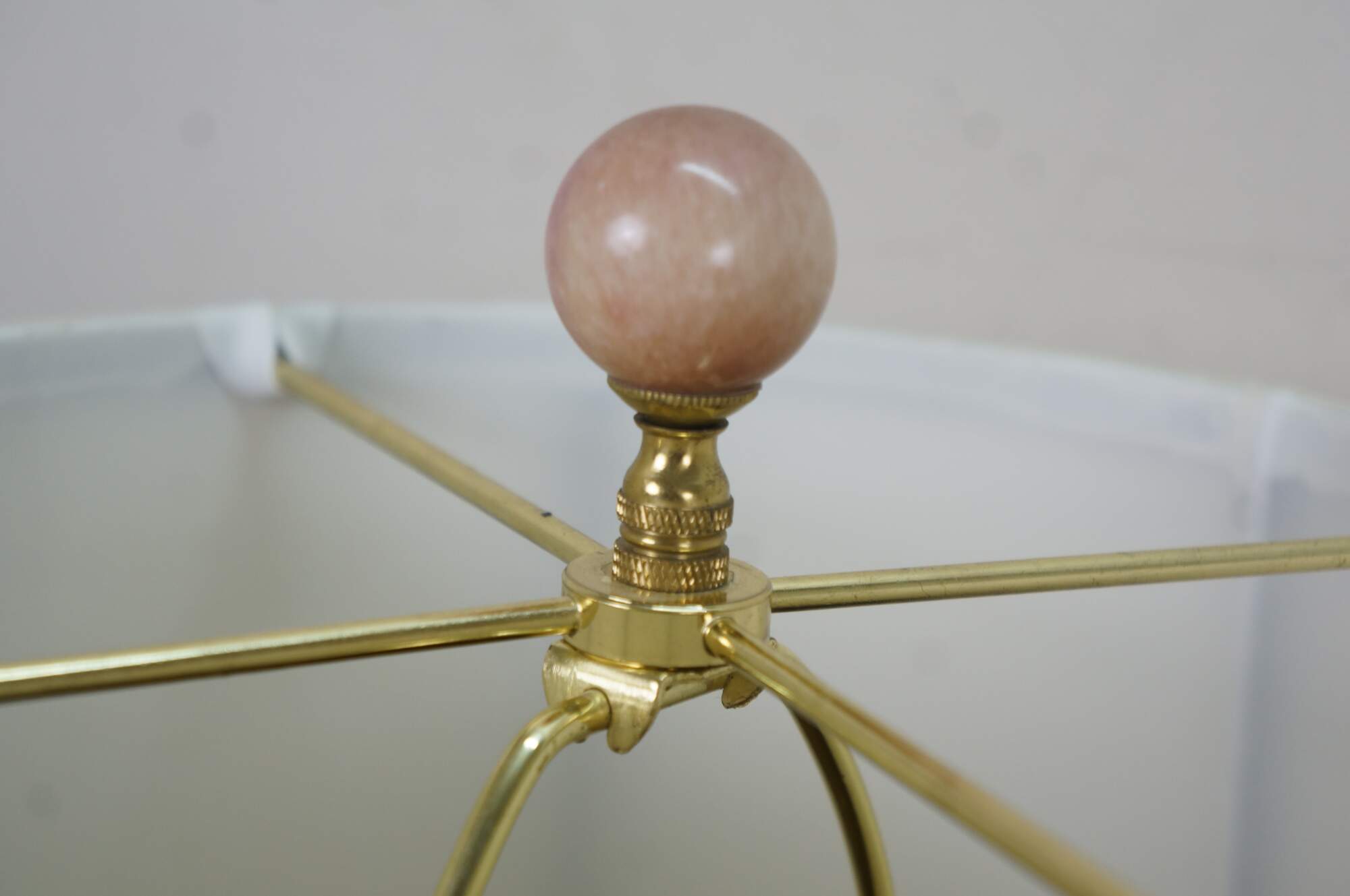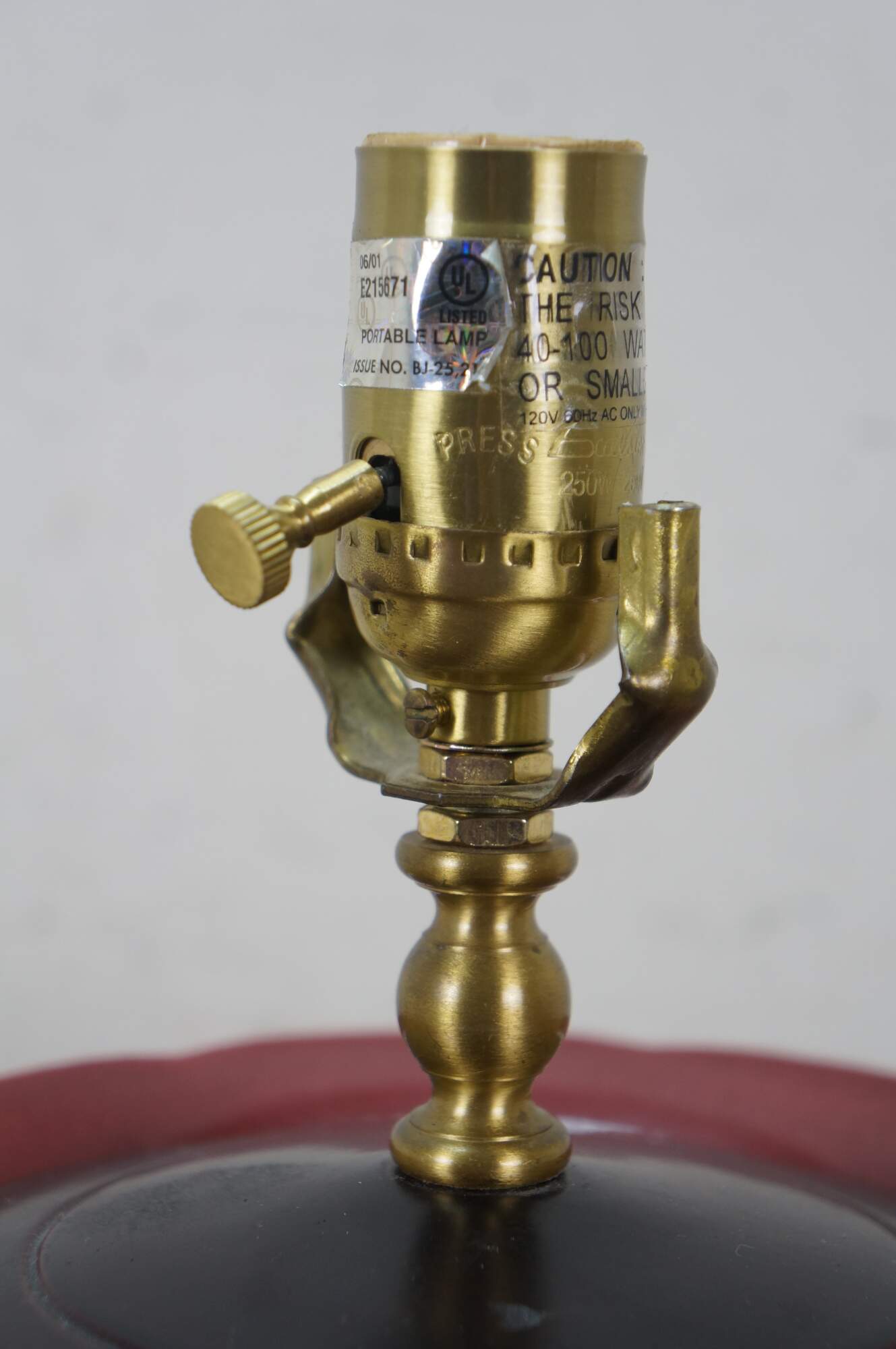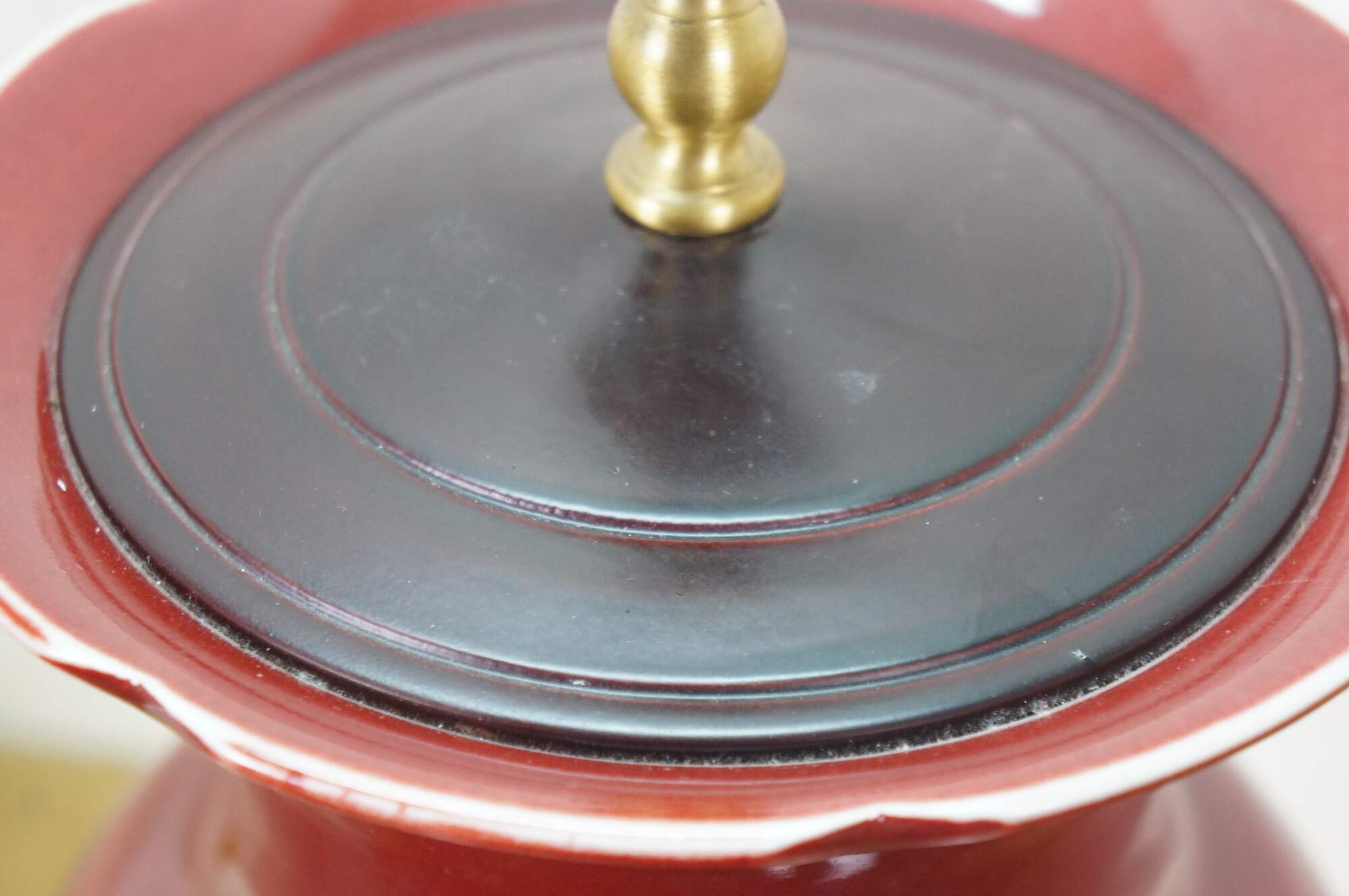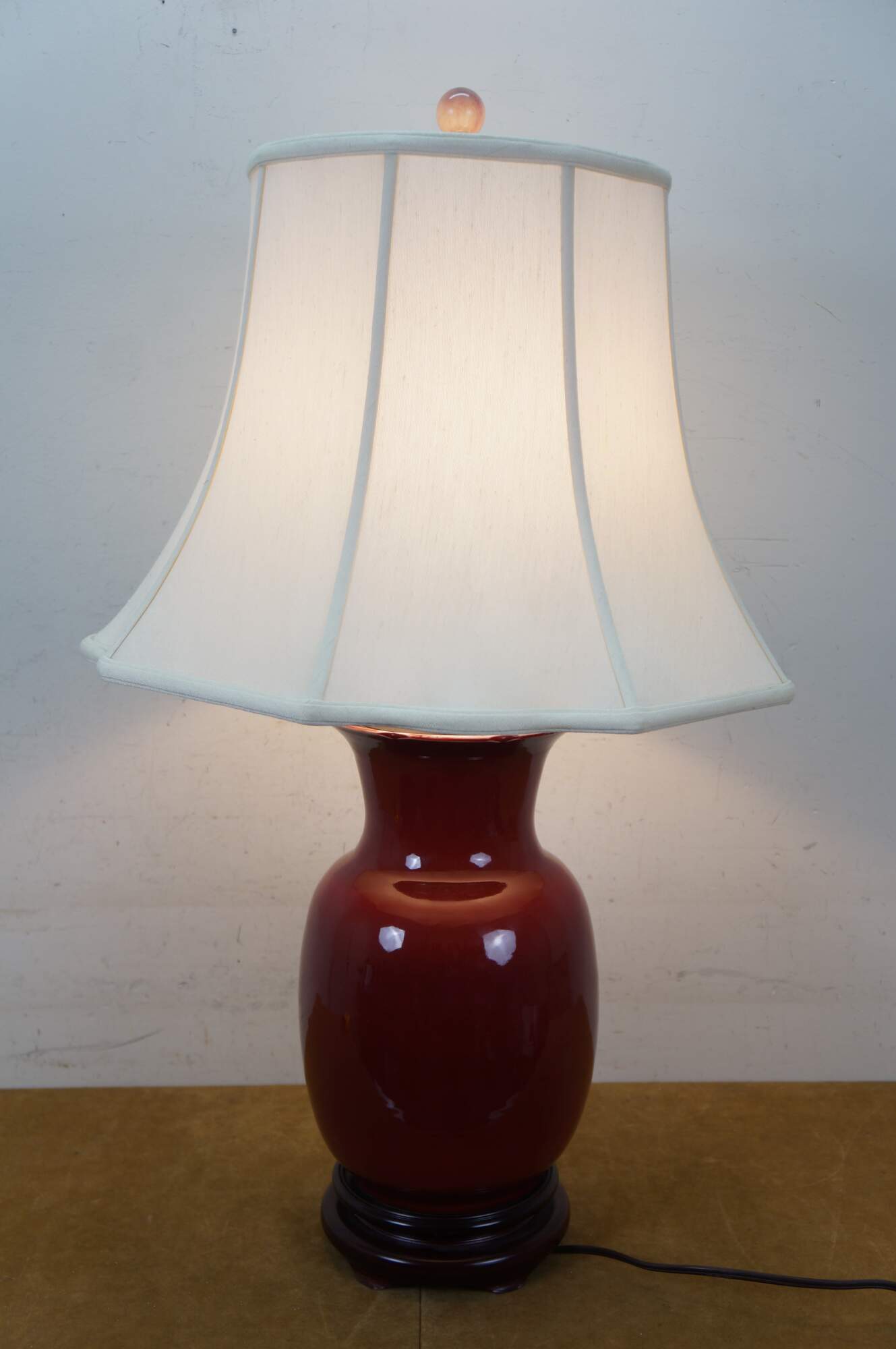 Late 20th century Chinoiserie vase shaped oxblood red porcelain table lamp with wooden base. Includes harp, pink glass orb finial, and white fabric shade. Made in China.