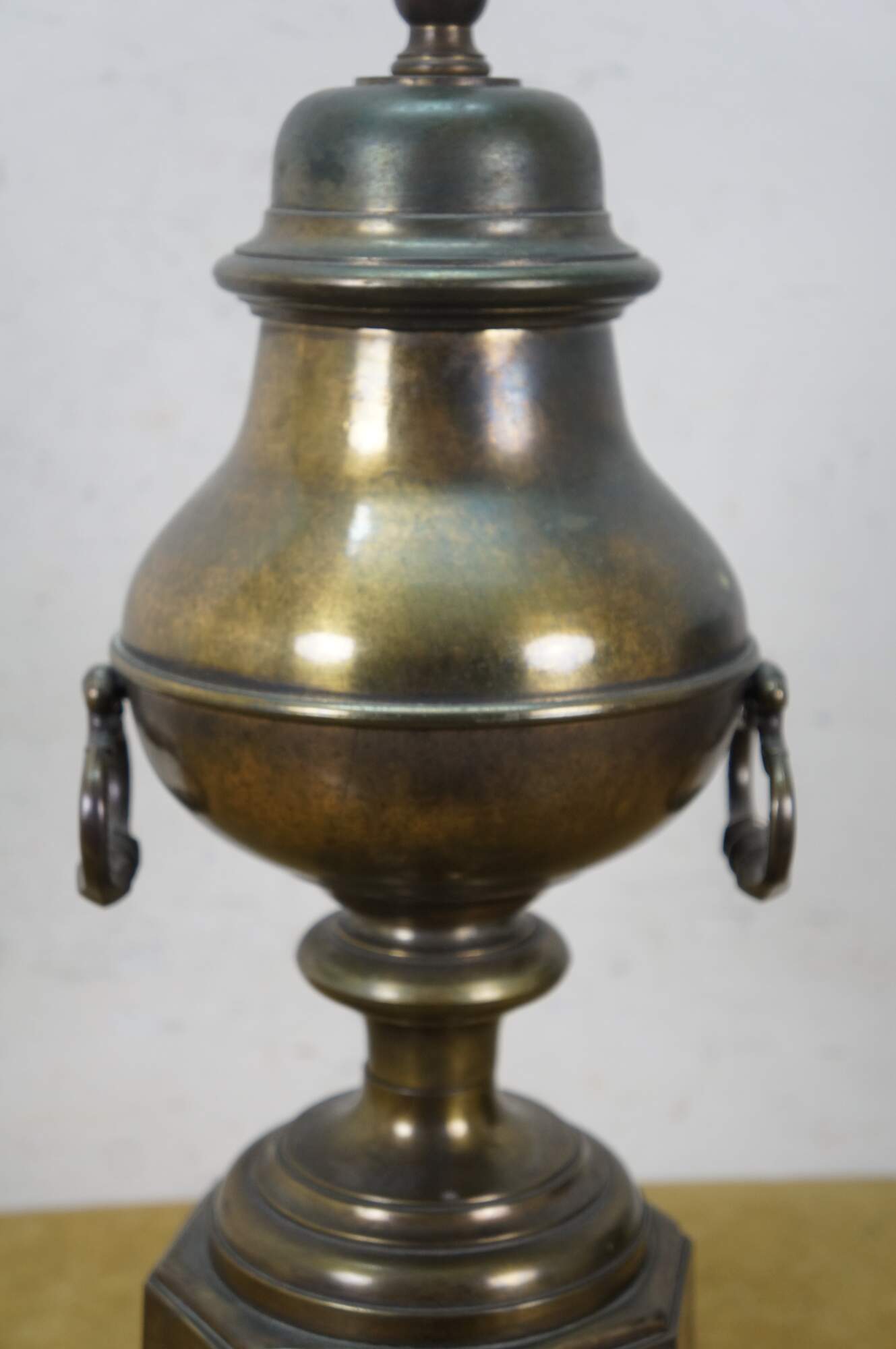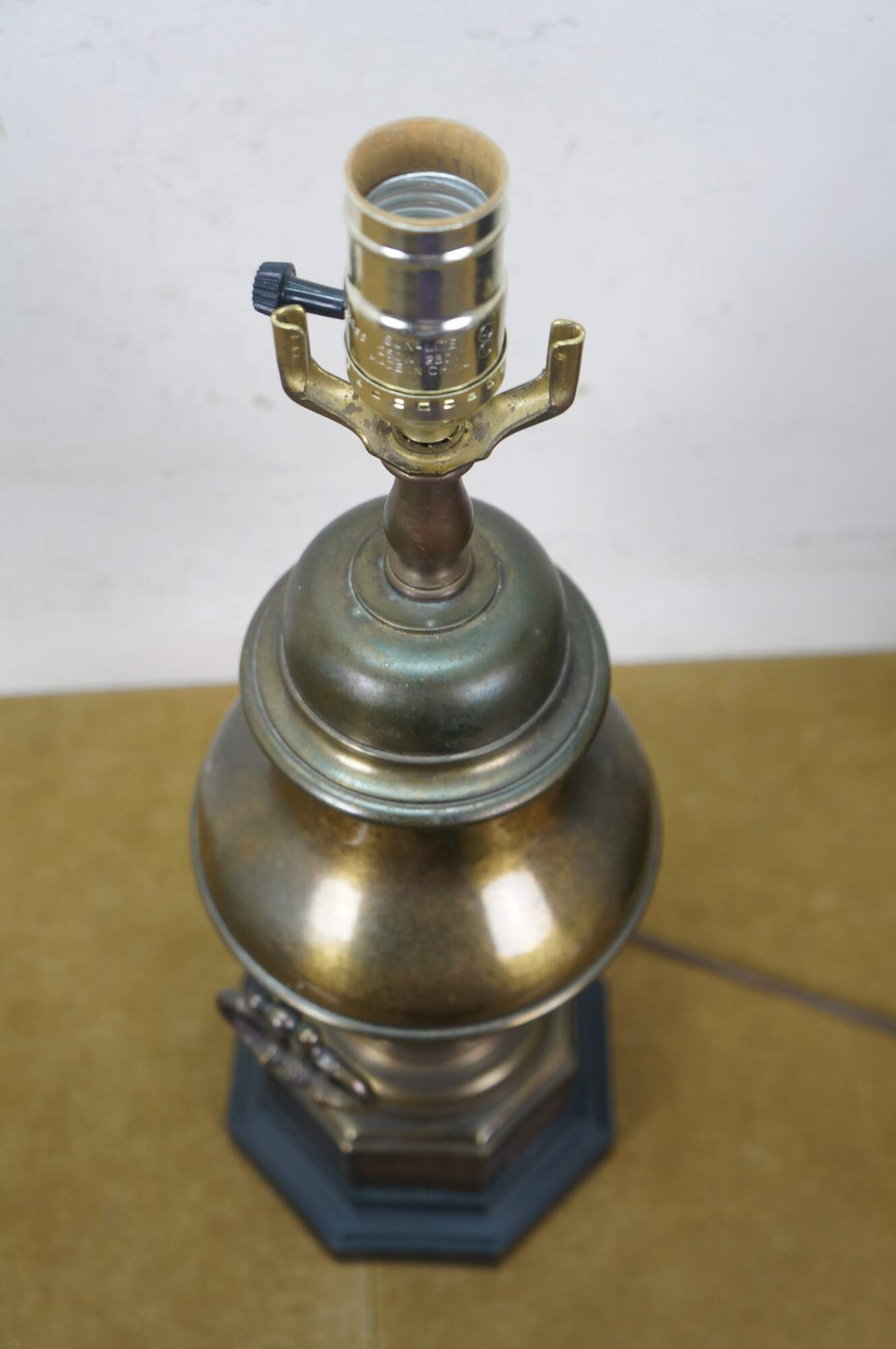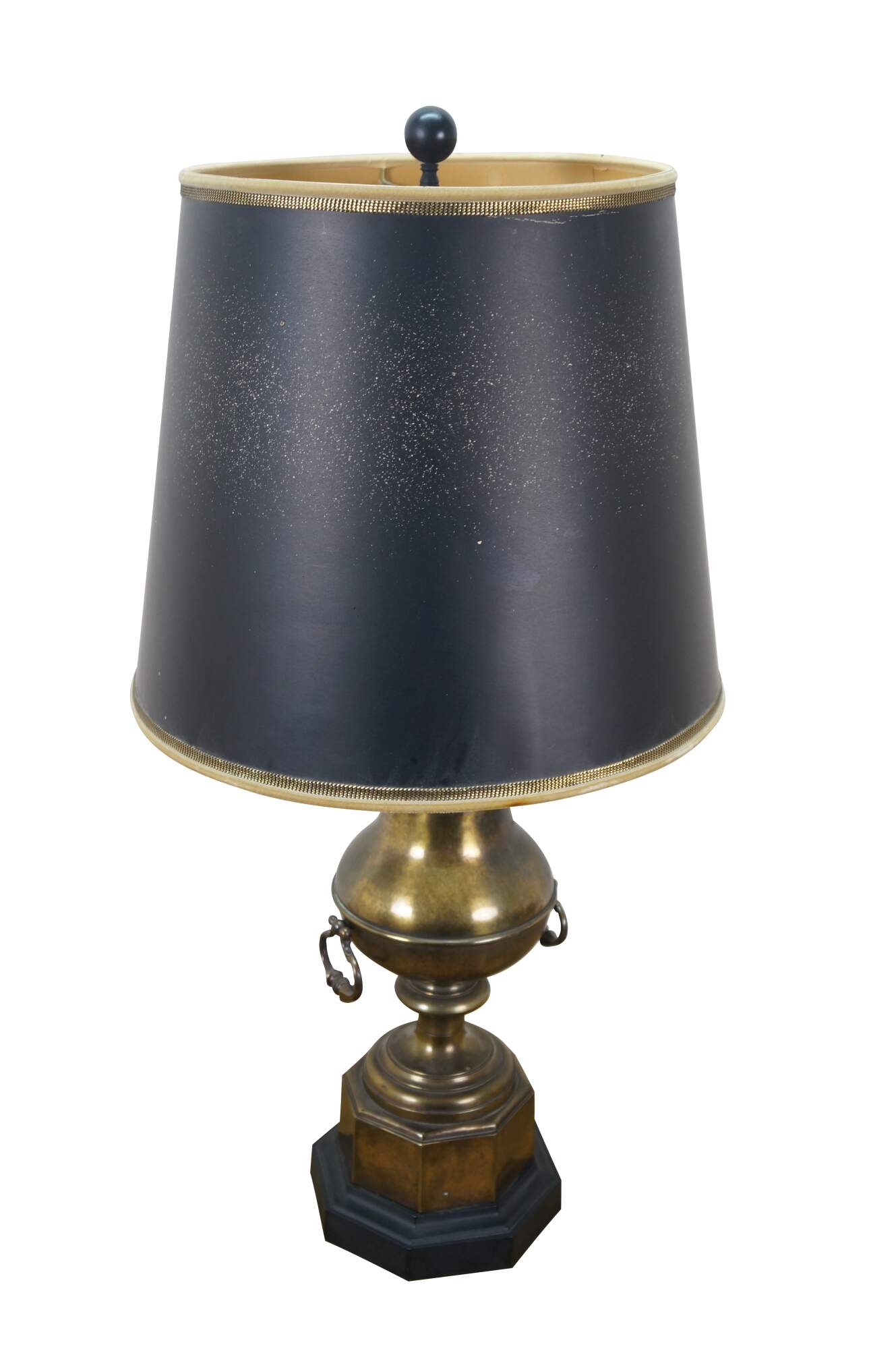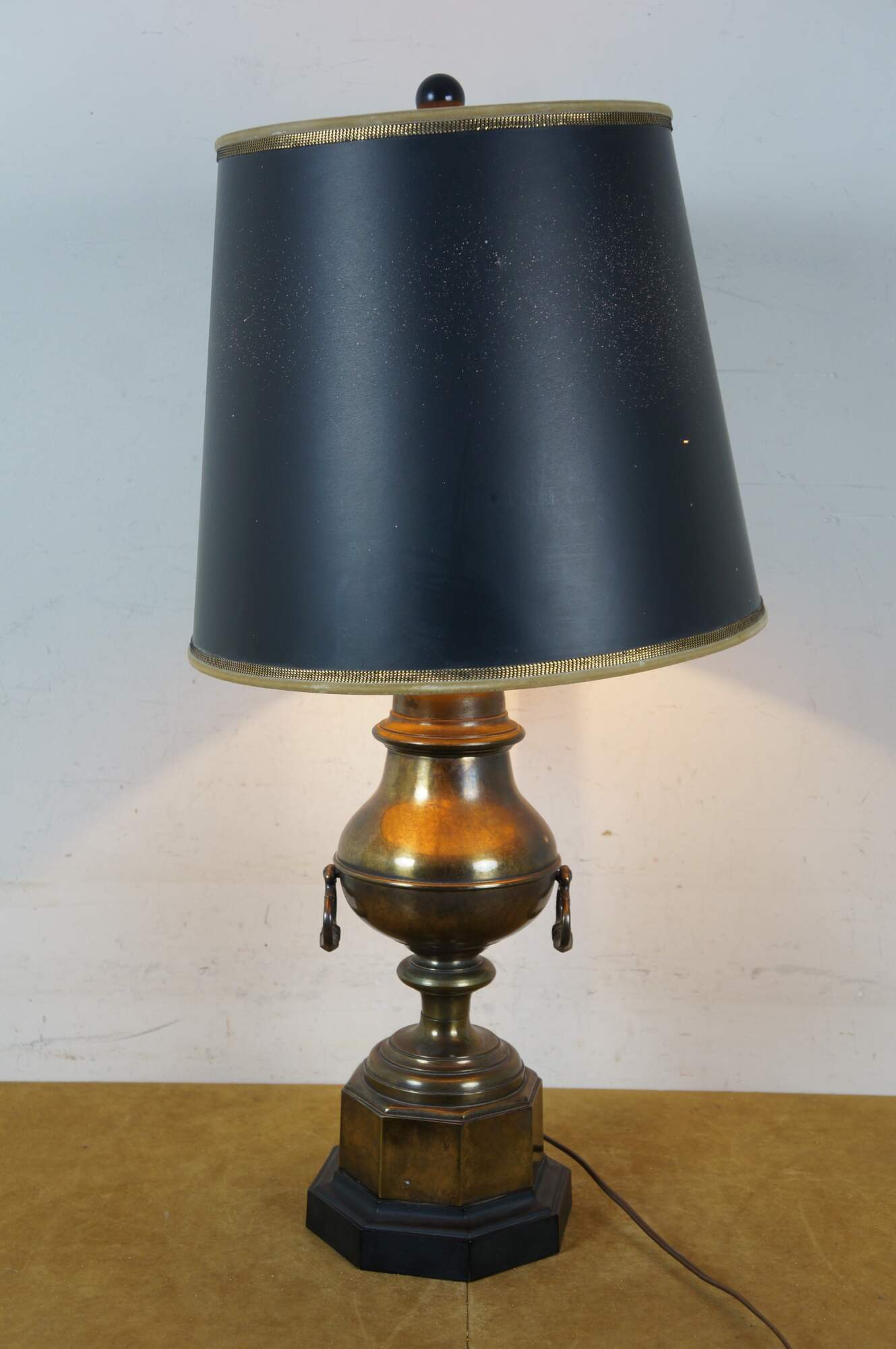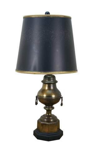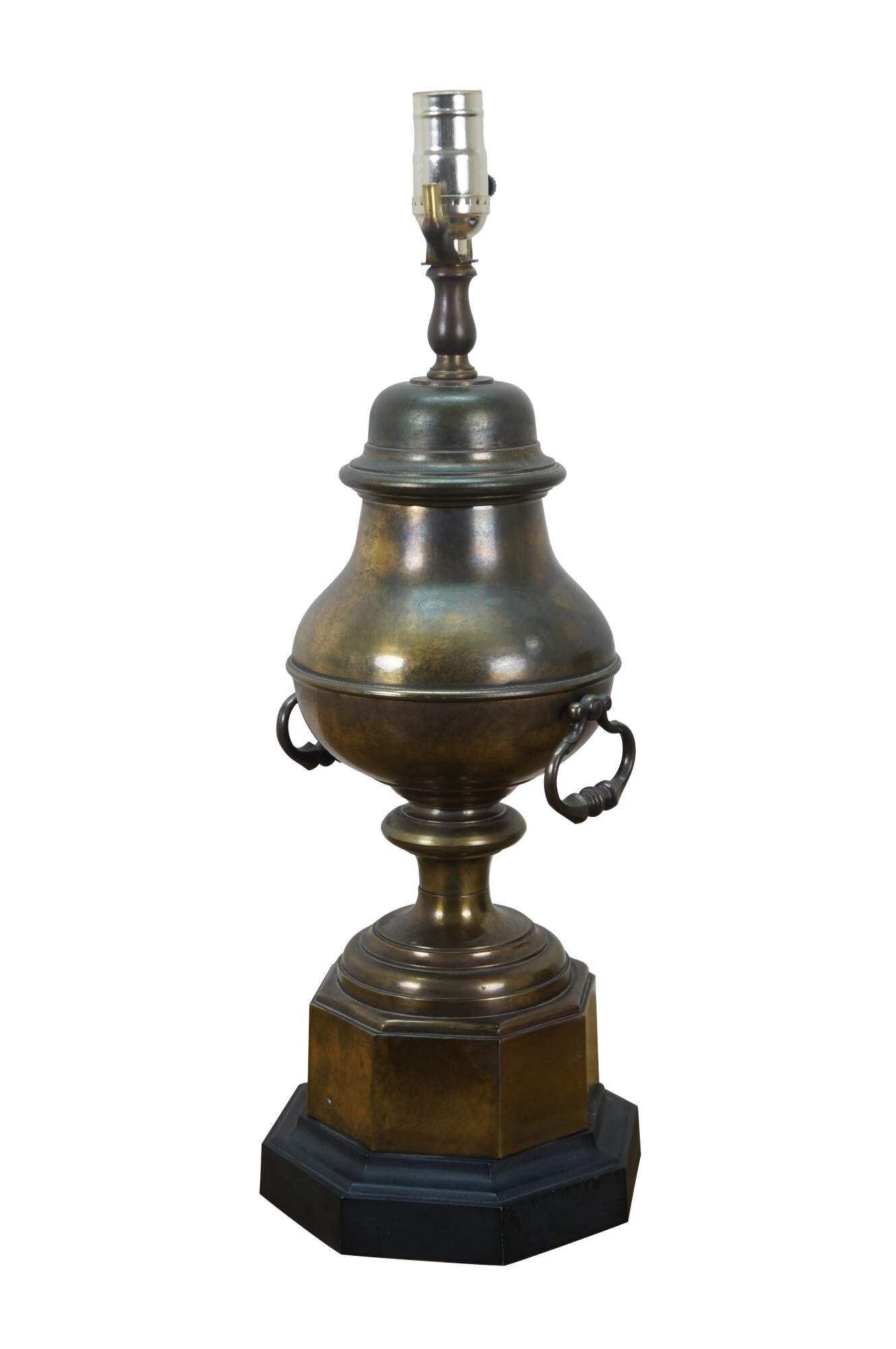 Mid to late 20th century Empire style brass table lamp in the shape of a Samovar or lidded urn with bail handles on a tiered octagonal brass and black painted wood base. Includes harp, orb finial and black paper shade with gold trim.