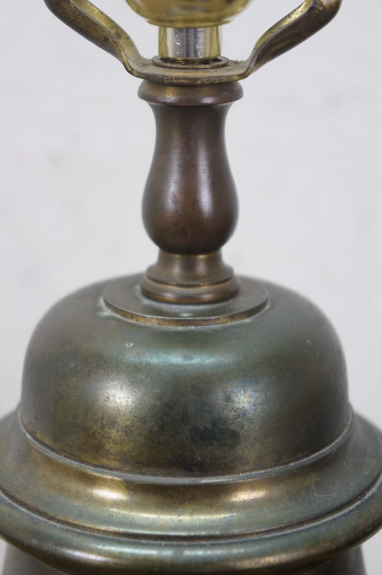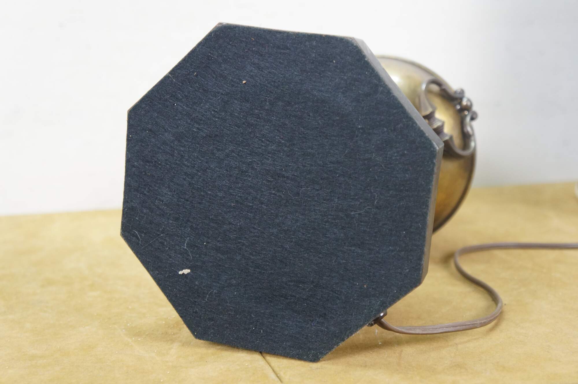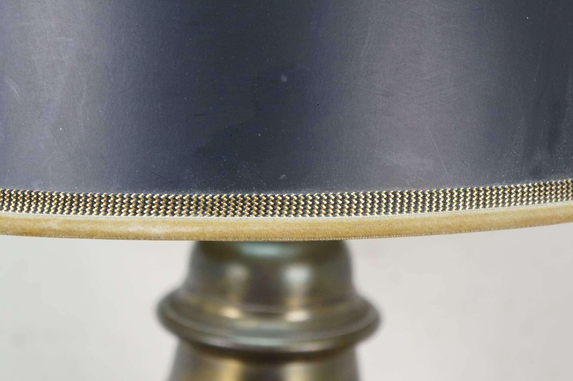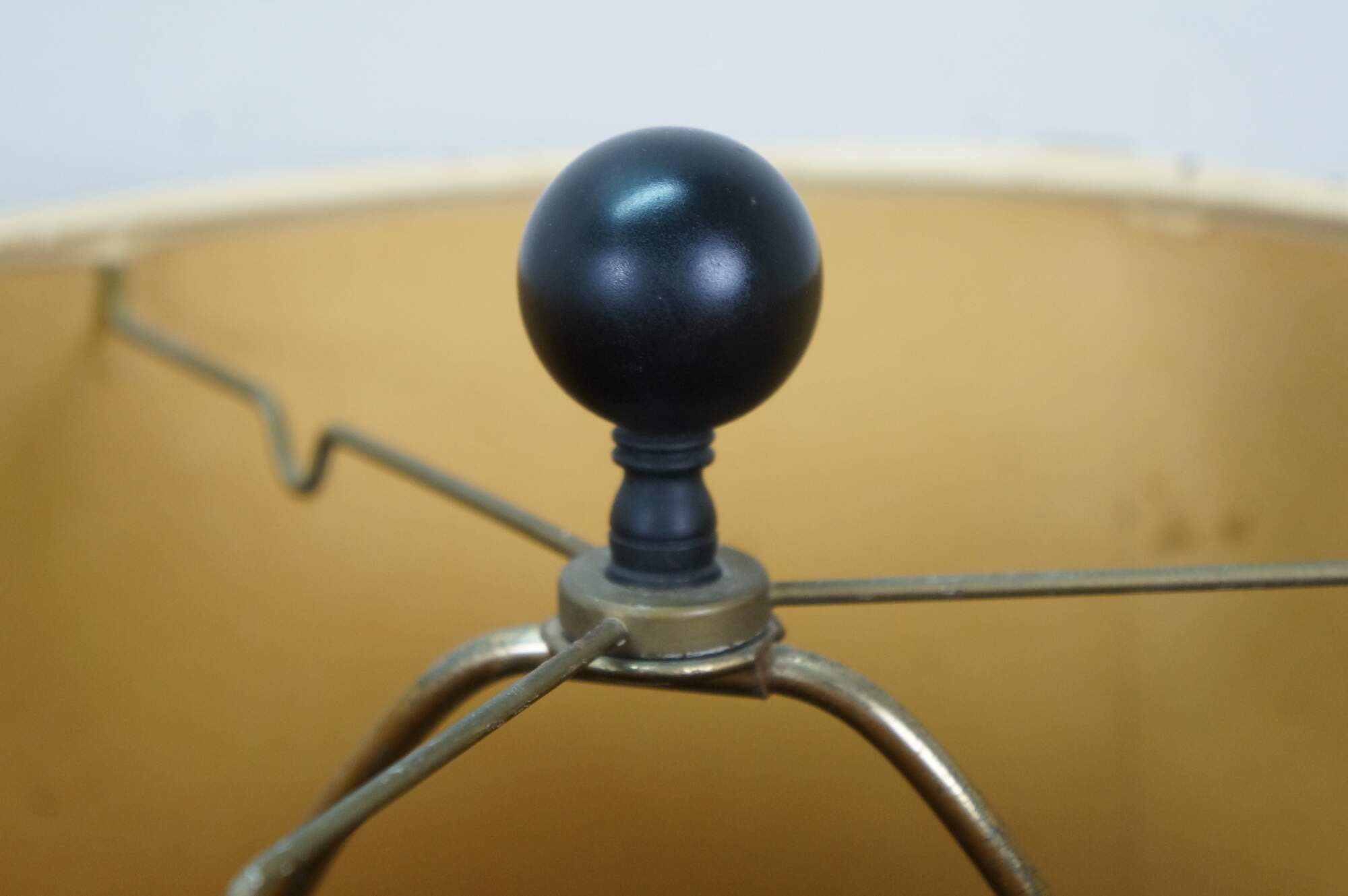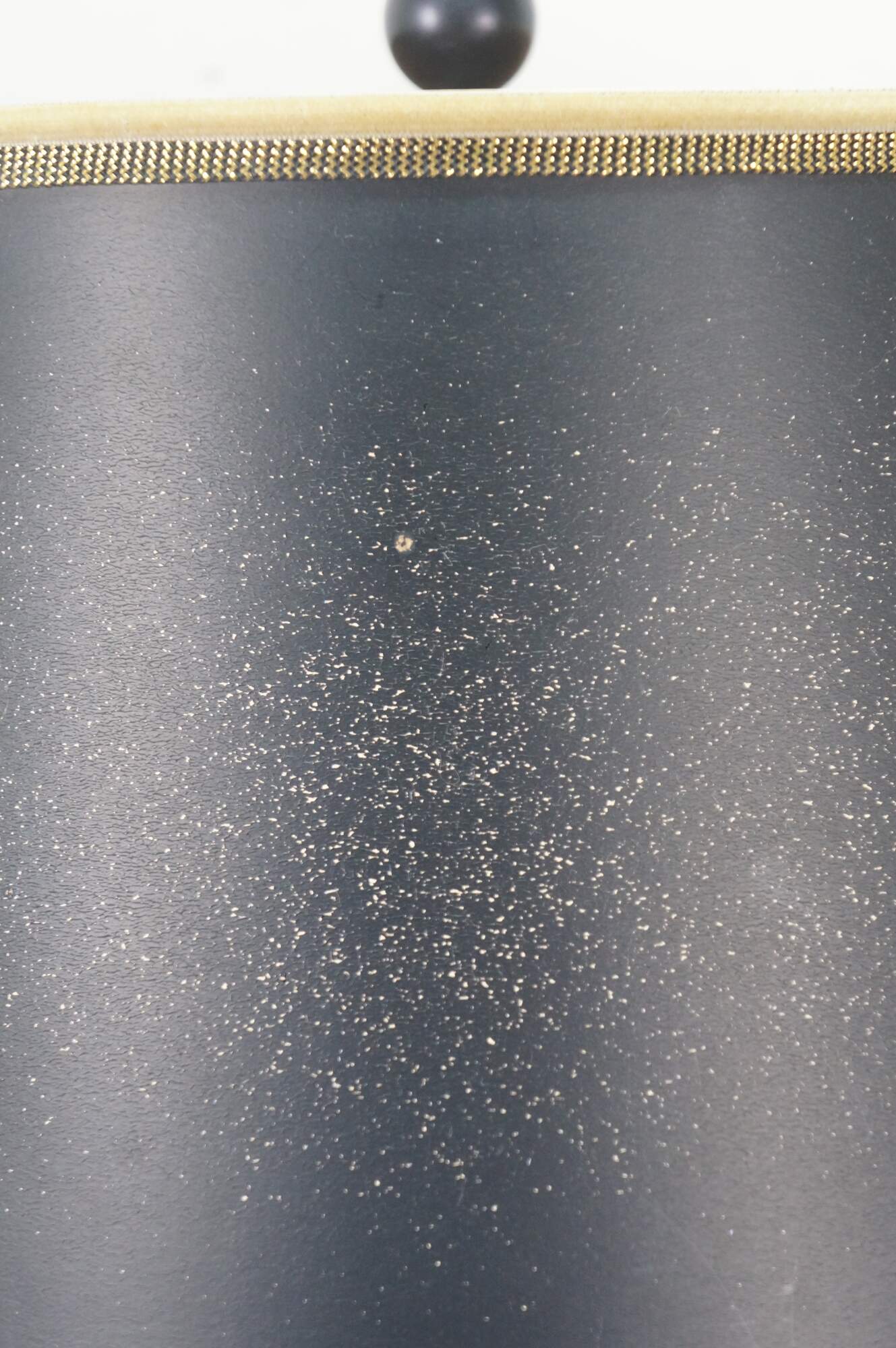 Mid to late 20th century Empire style brass table lamp in the shape of a Samovar or lidded urn with bail handles on a tiered octagonal brass and black painted wood base. Includes harp, orb finial and black paper shade with gold trim.
