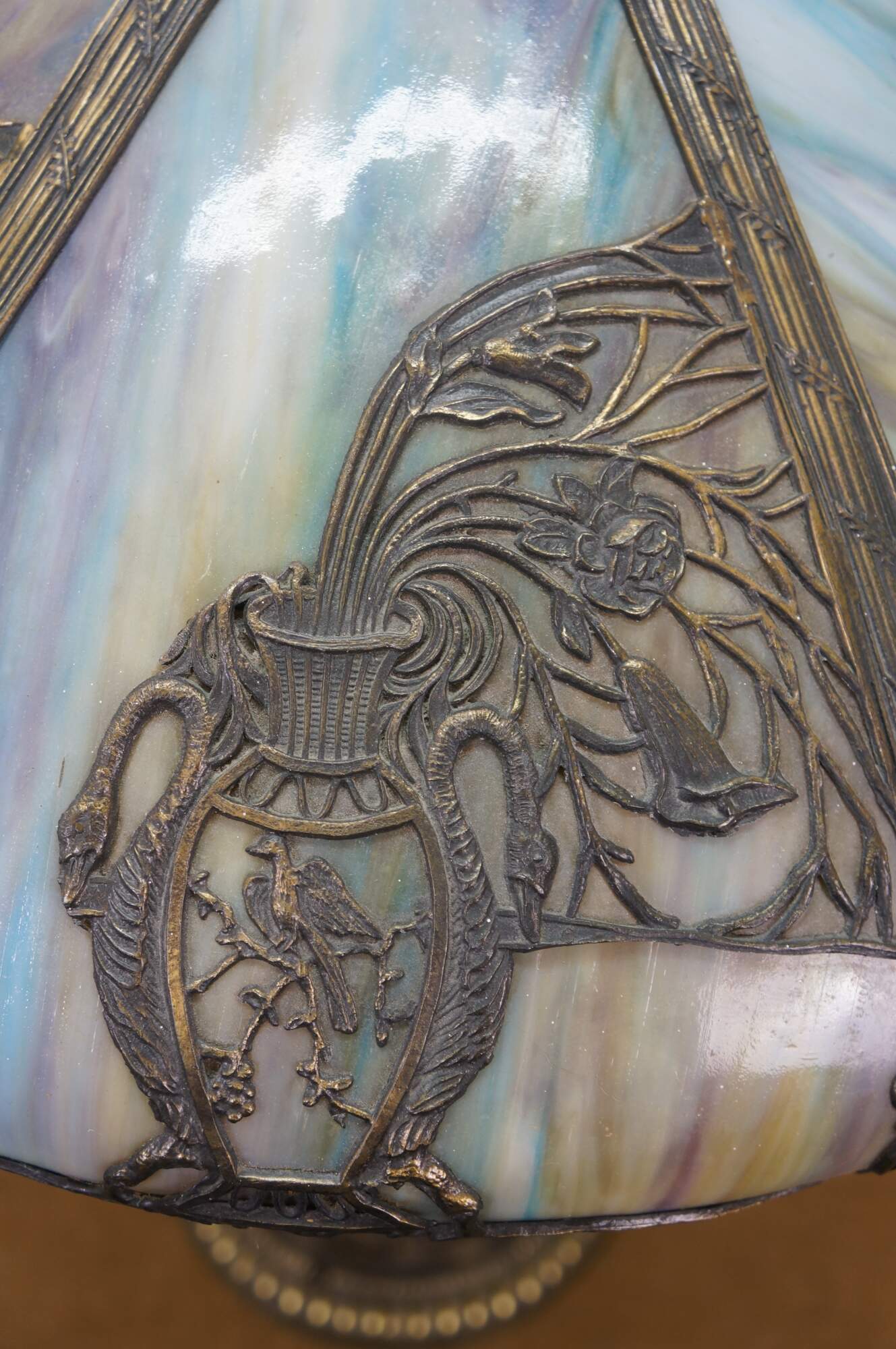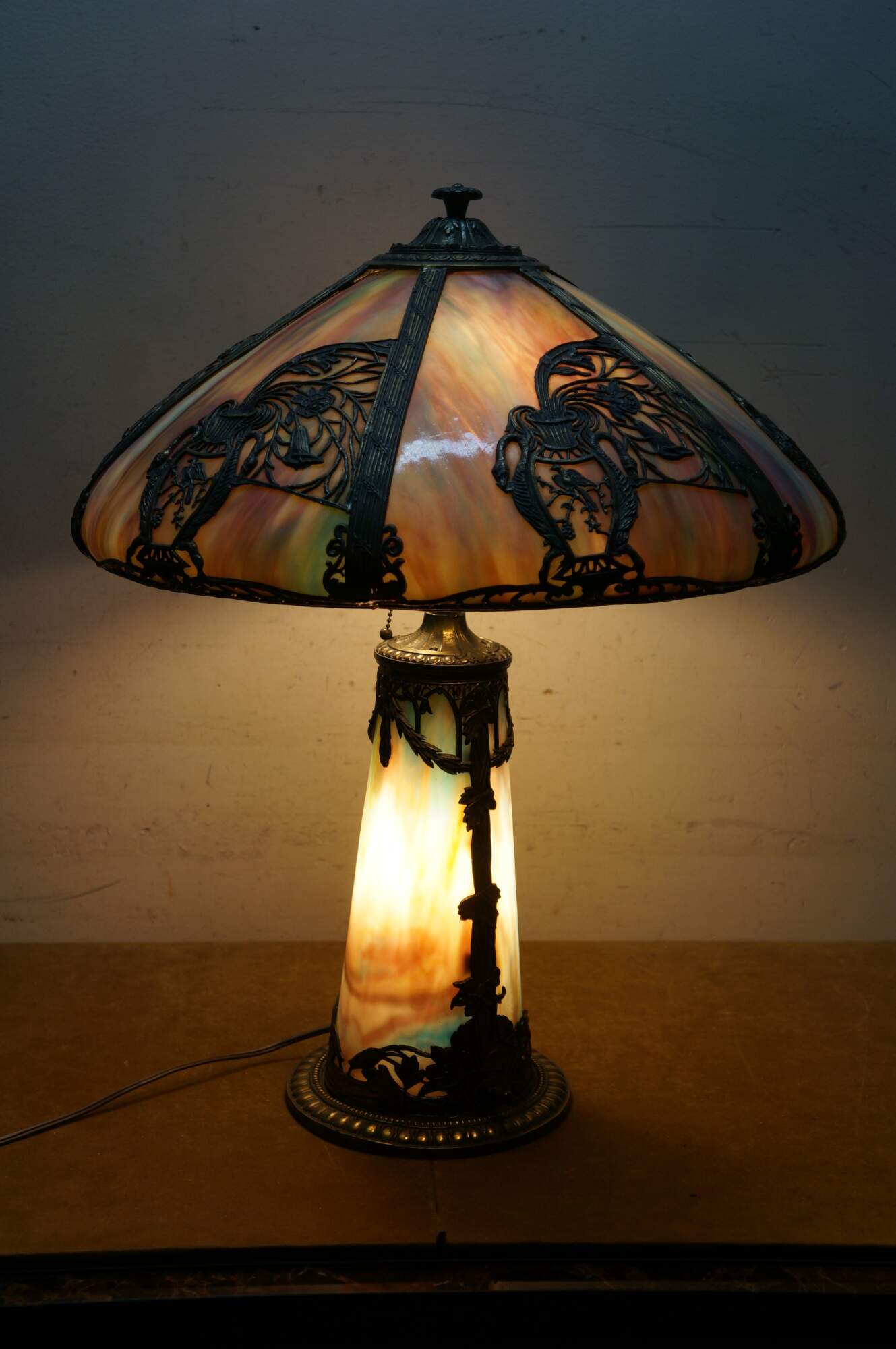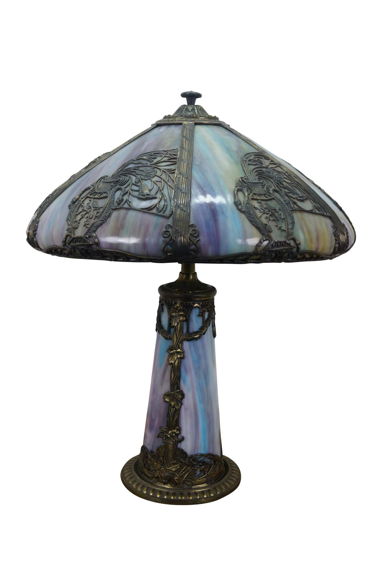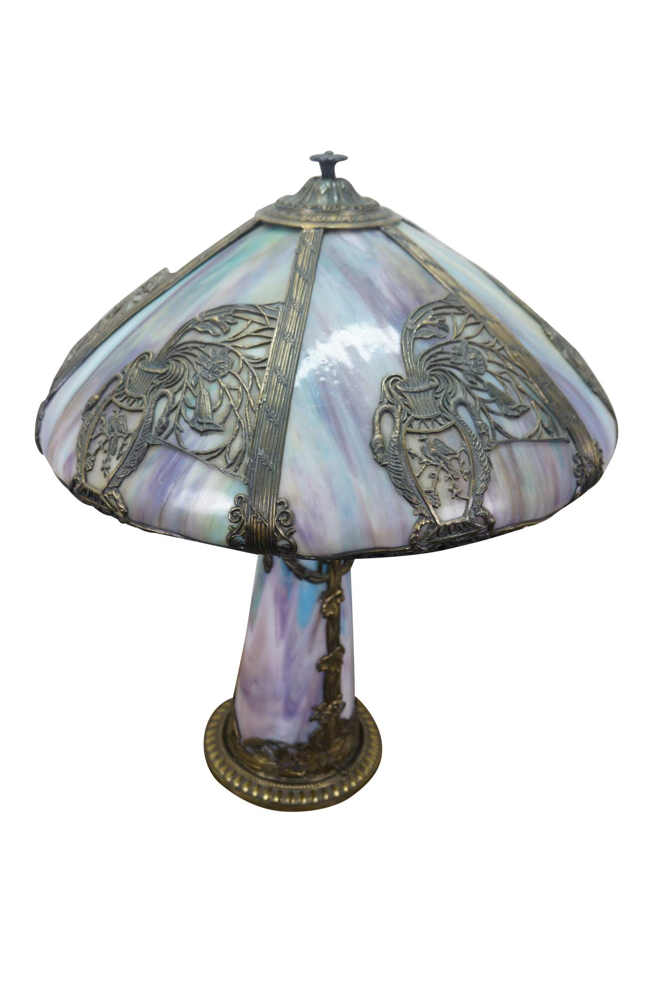 Antique Victorian era Aesthetic Movement / Art Nouveau style table lamp. Mushroom shaped lamp crafted of swirling blue, white, and purple slag glass framed with ornate filigree brass designs of vines, flowers, birds and chinoiserie vases. Two light upper portion with pull chains. Individually illuminated base with button switch. Attributed to Bradley & Hubbard.