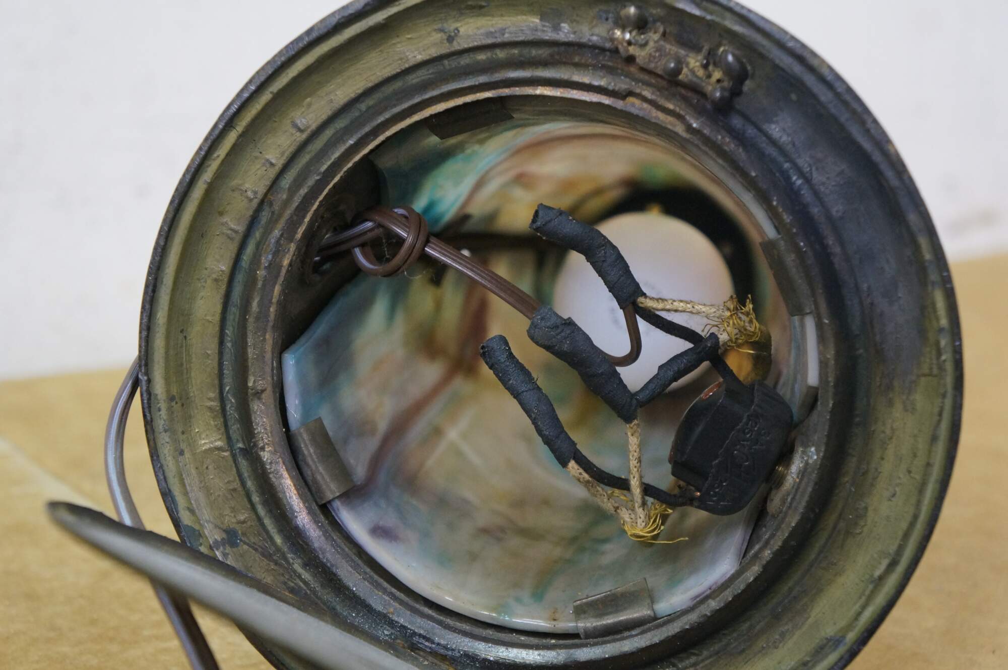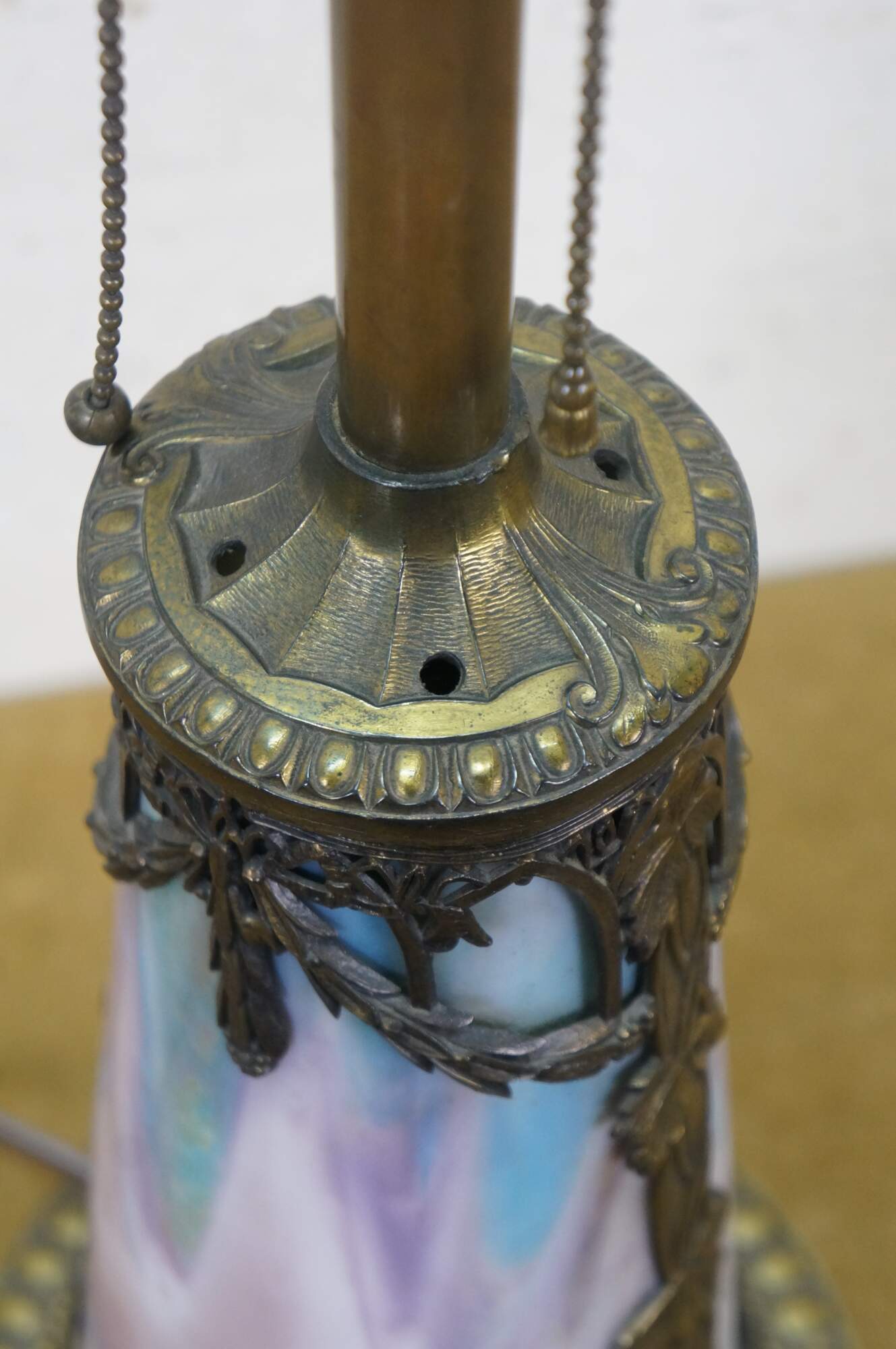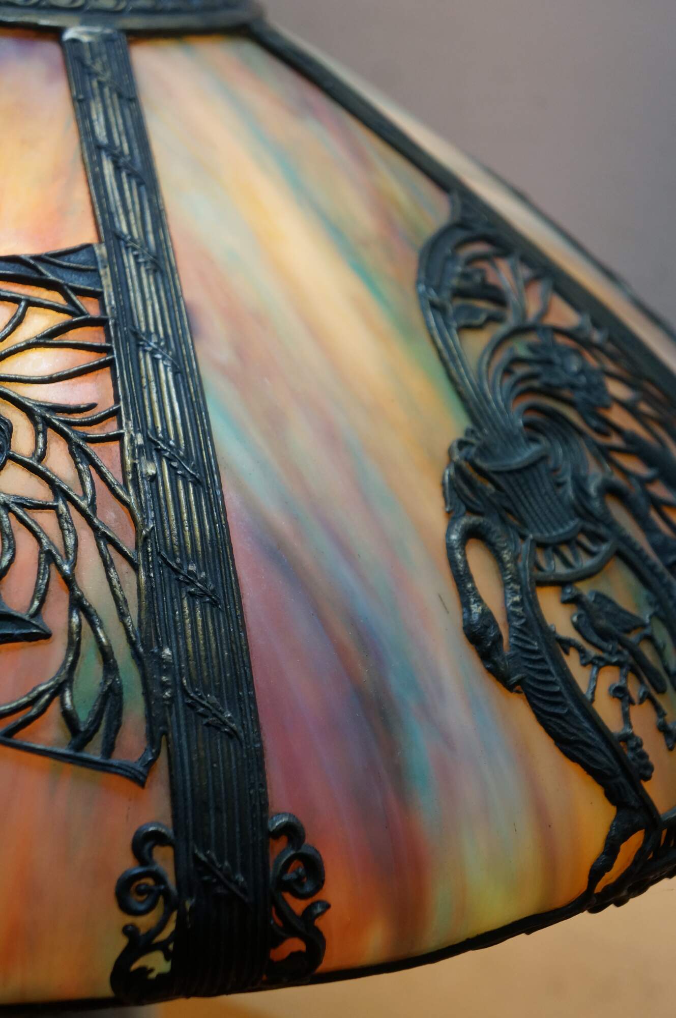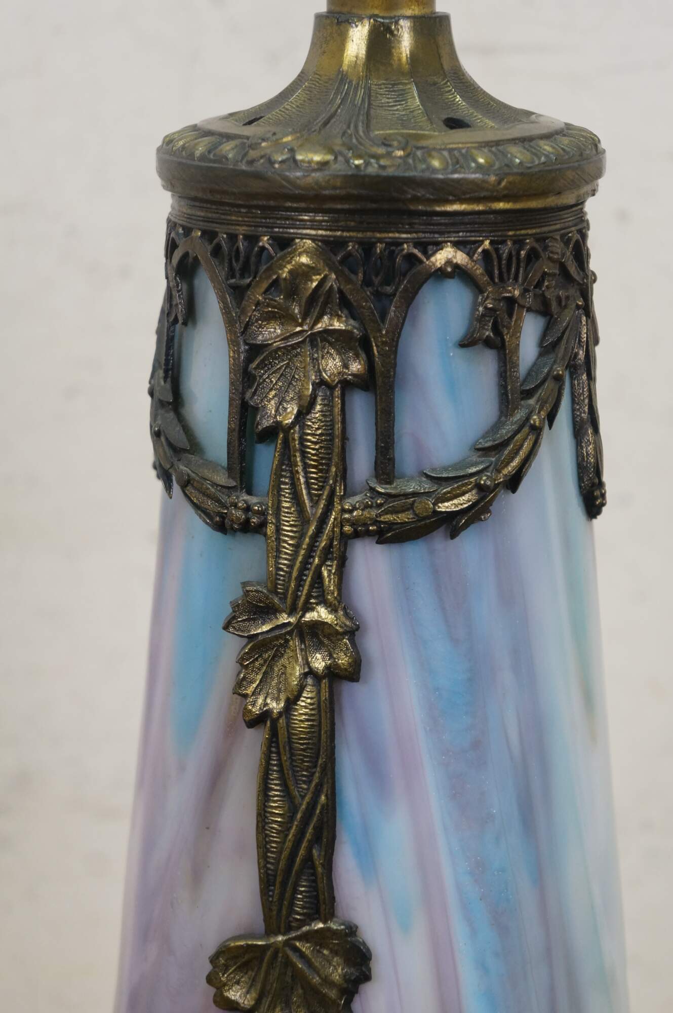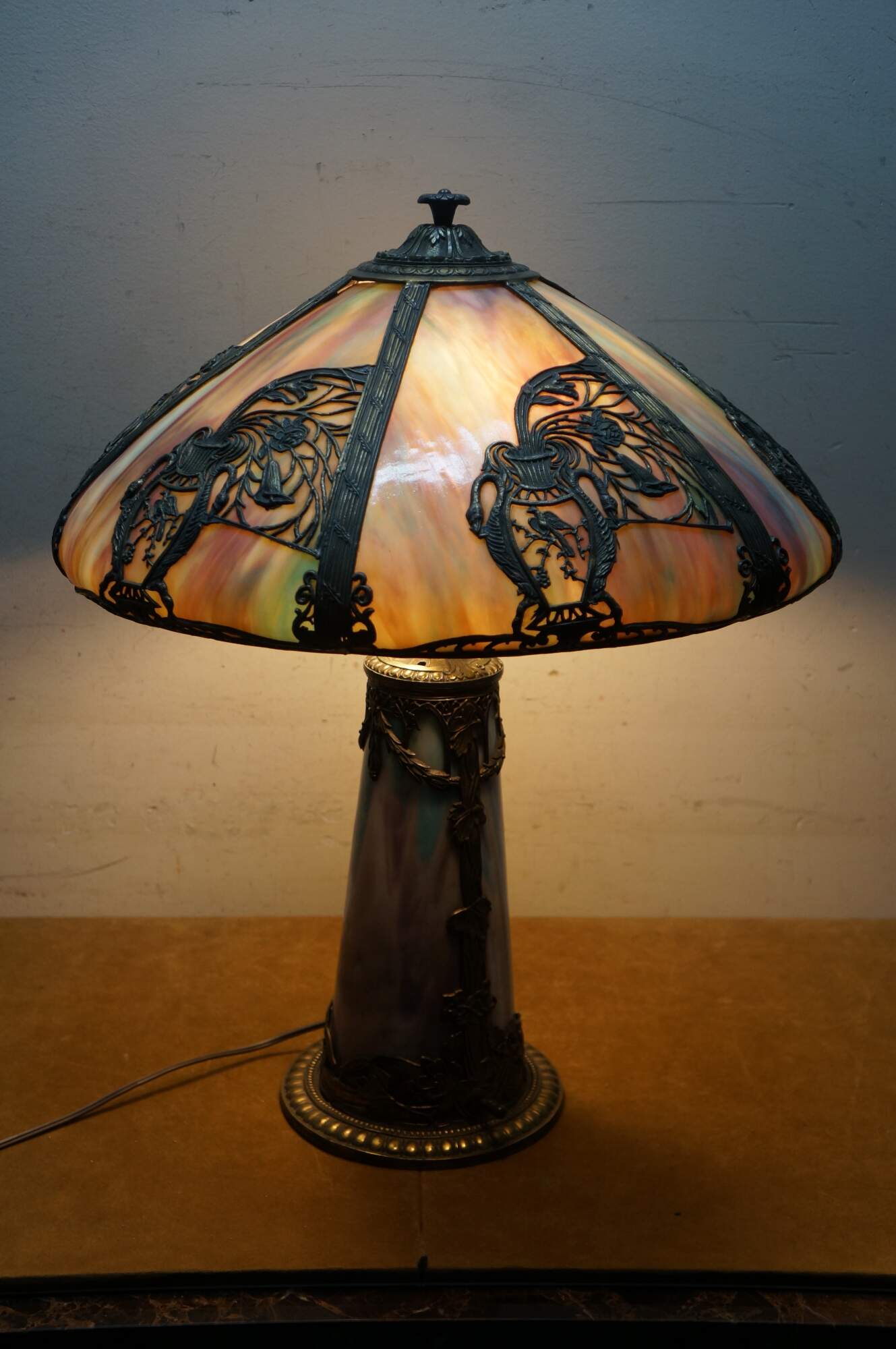 Antique Victorian era Aesthetic Movement / Art Nouveau style table lamp. Mushroom shaped lamp crafted of swirling blue, white, and purple slag glass framed with ornate filigree brass designs of vines, flowers, birds and chinoiserie vases. Two light upper portion with pull chains. Individually illuminated base with button switch. Attributed to Bradley & Hubbard.