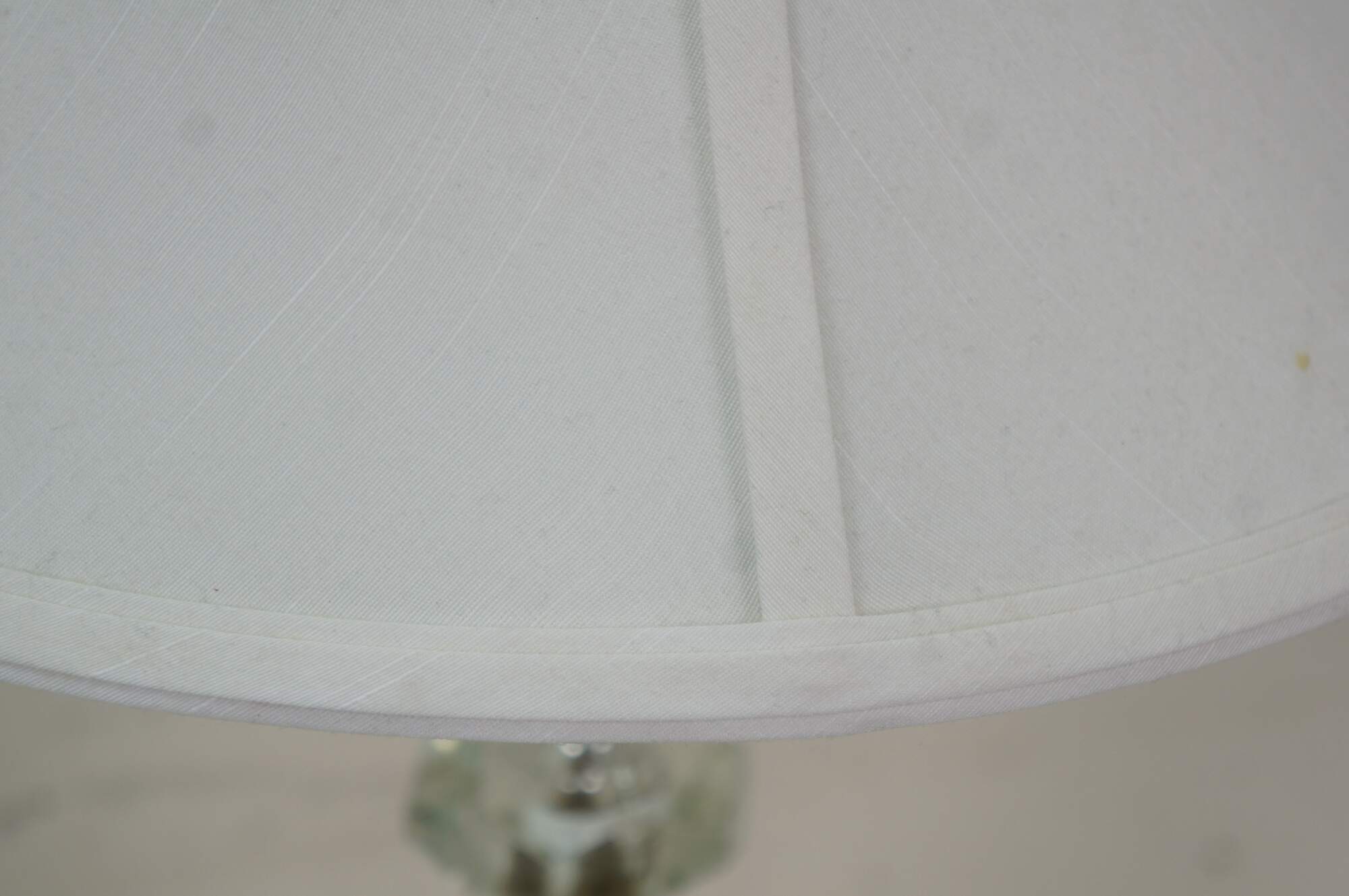 Pair of circa mid 20th century cut crystal / glass table lamps - five geometrically cut crystal prisms divided by reticulated brass bands. Hollywood Regency styling. Includes harps, glass orb finials, and white fabric shades.