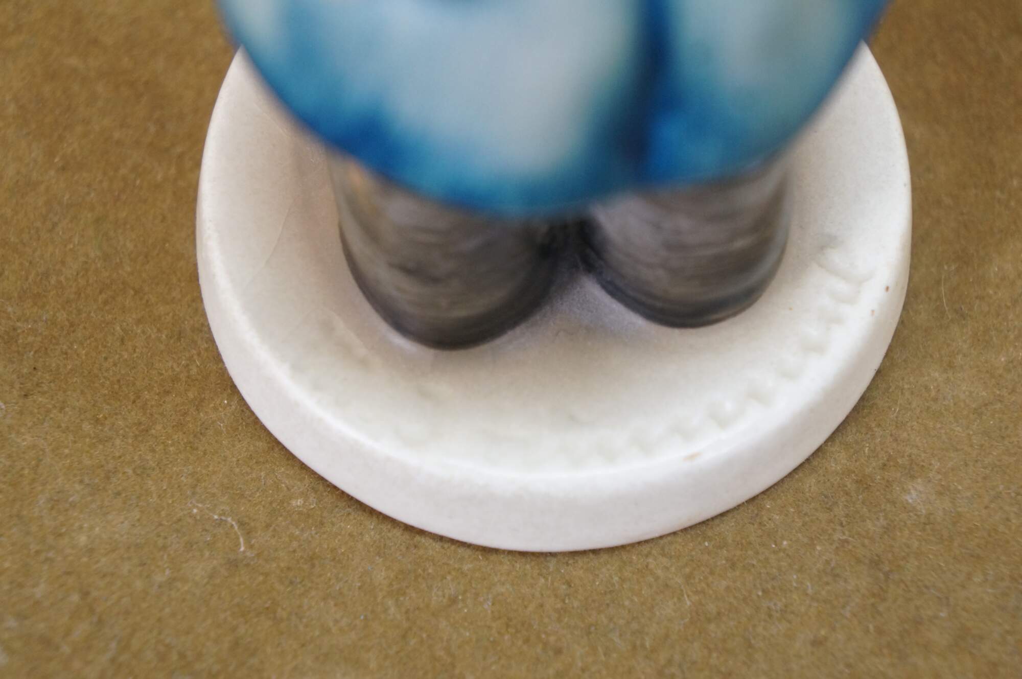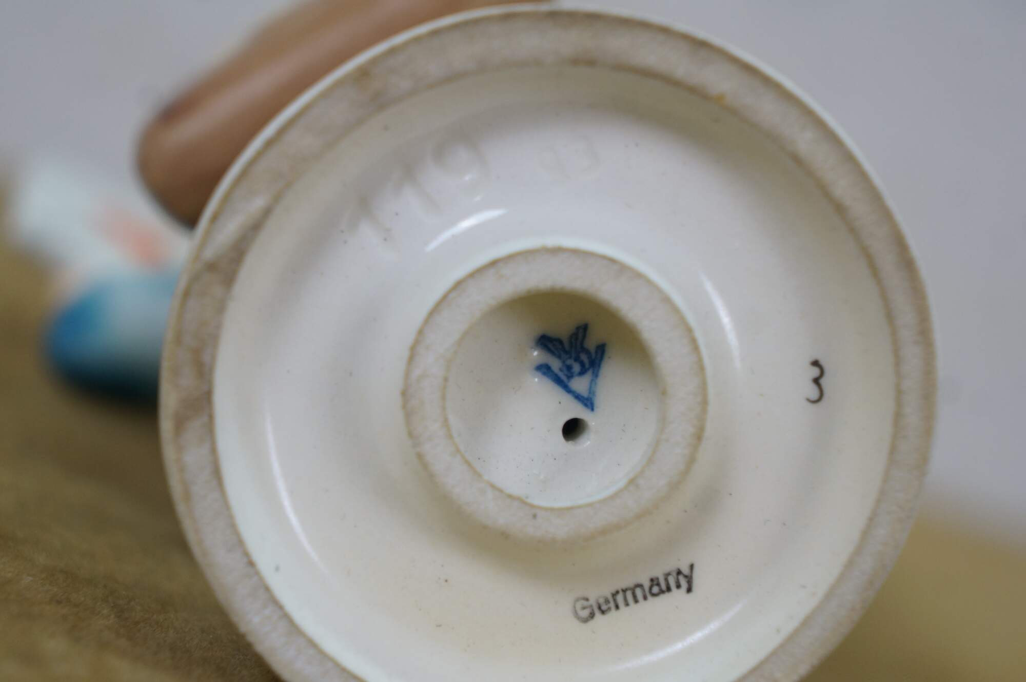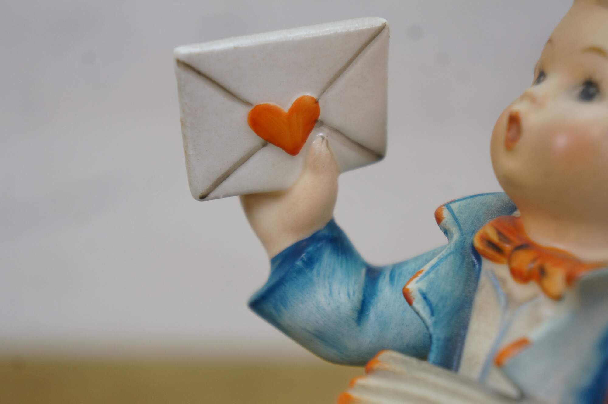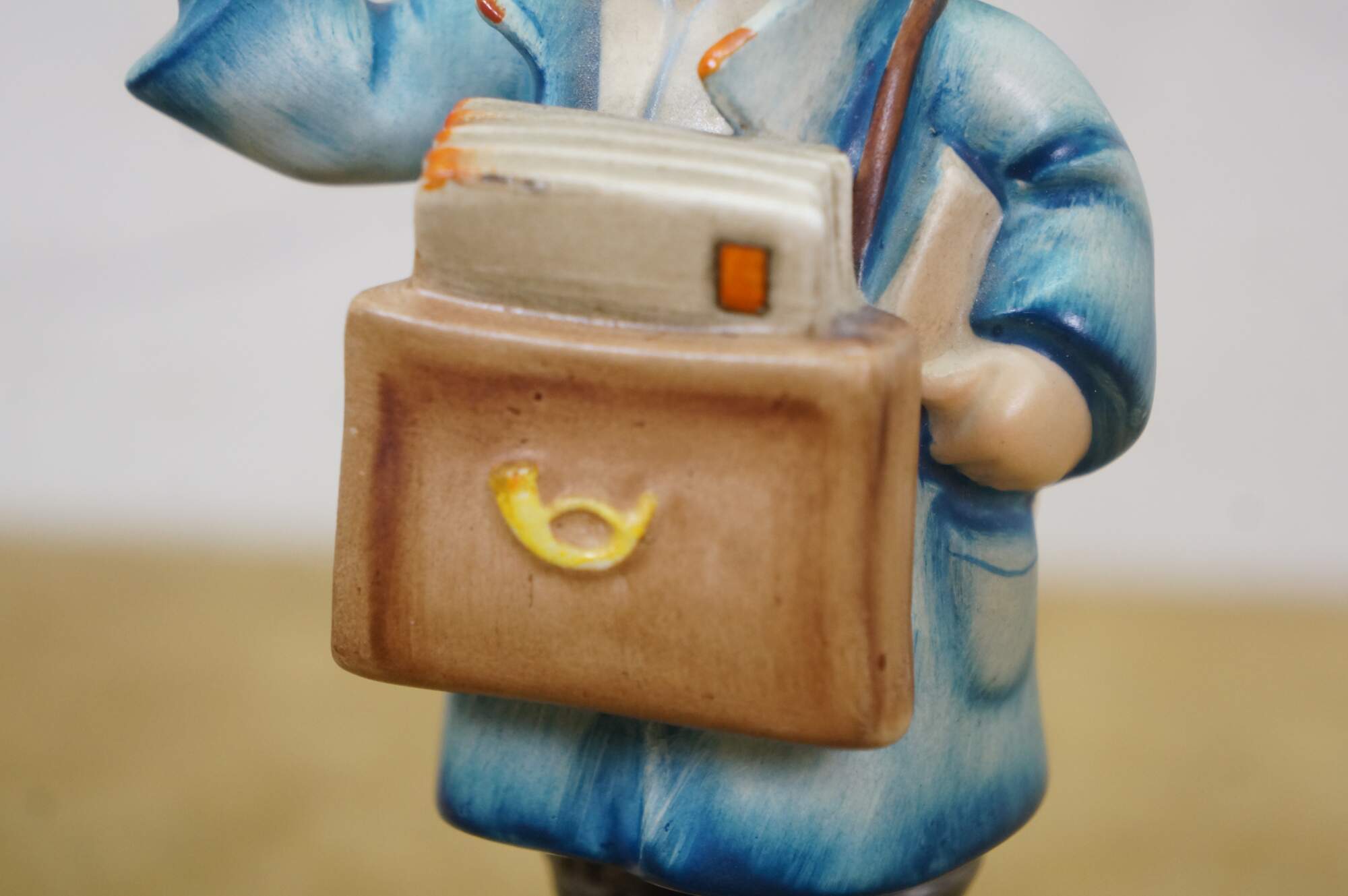 Mid 20th century Goebel Hummel figurine number 119 - Postman. TMK-2 Full Bee Mark - circa 1950-1955. Young boy in blue postman's uniform carrying a bag full of letters / Valentines, lifting one up to the viewer.