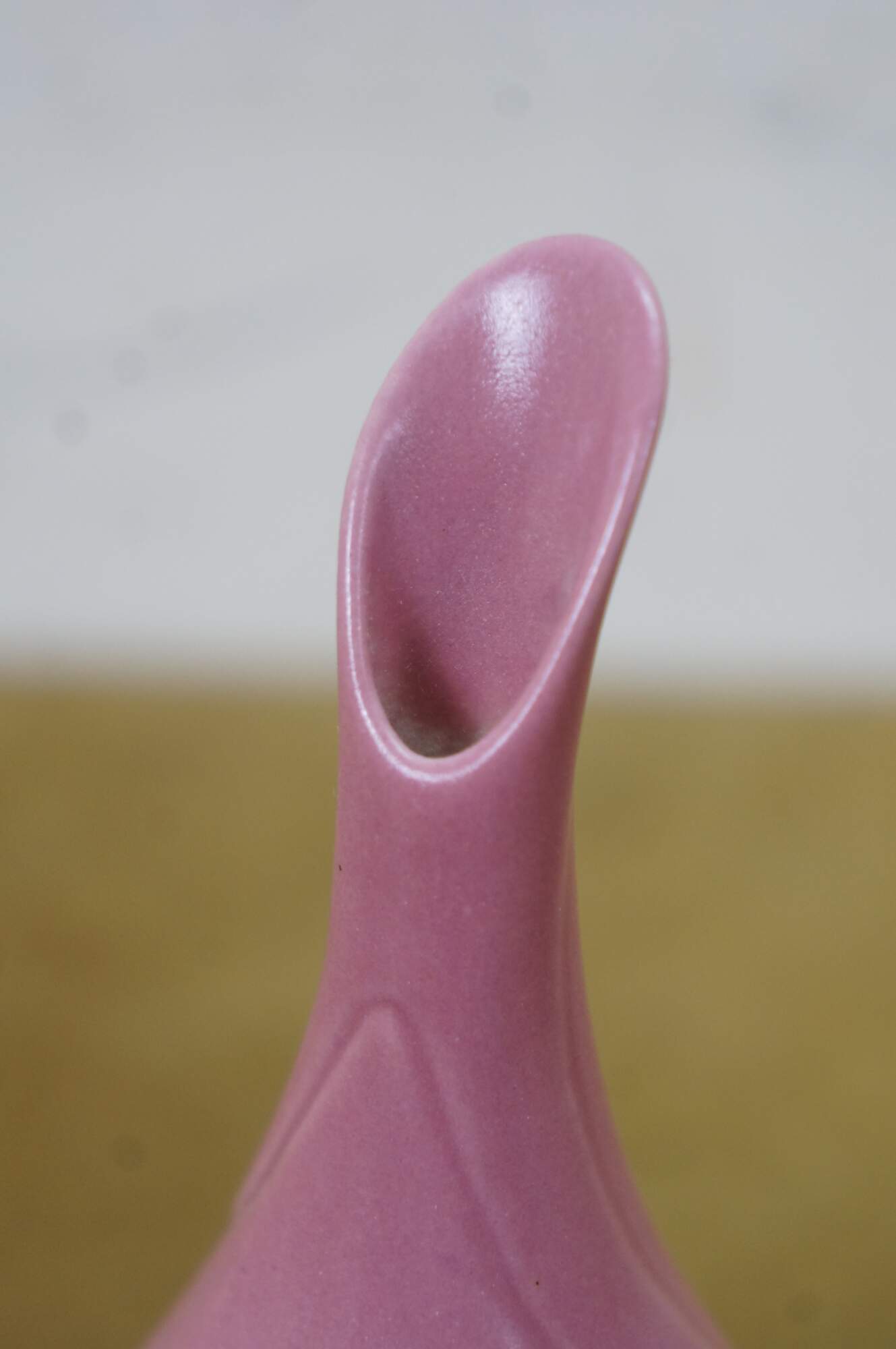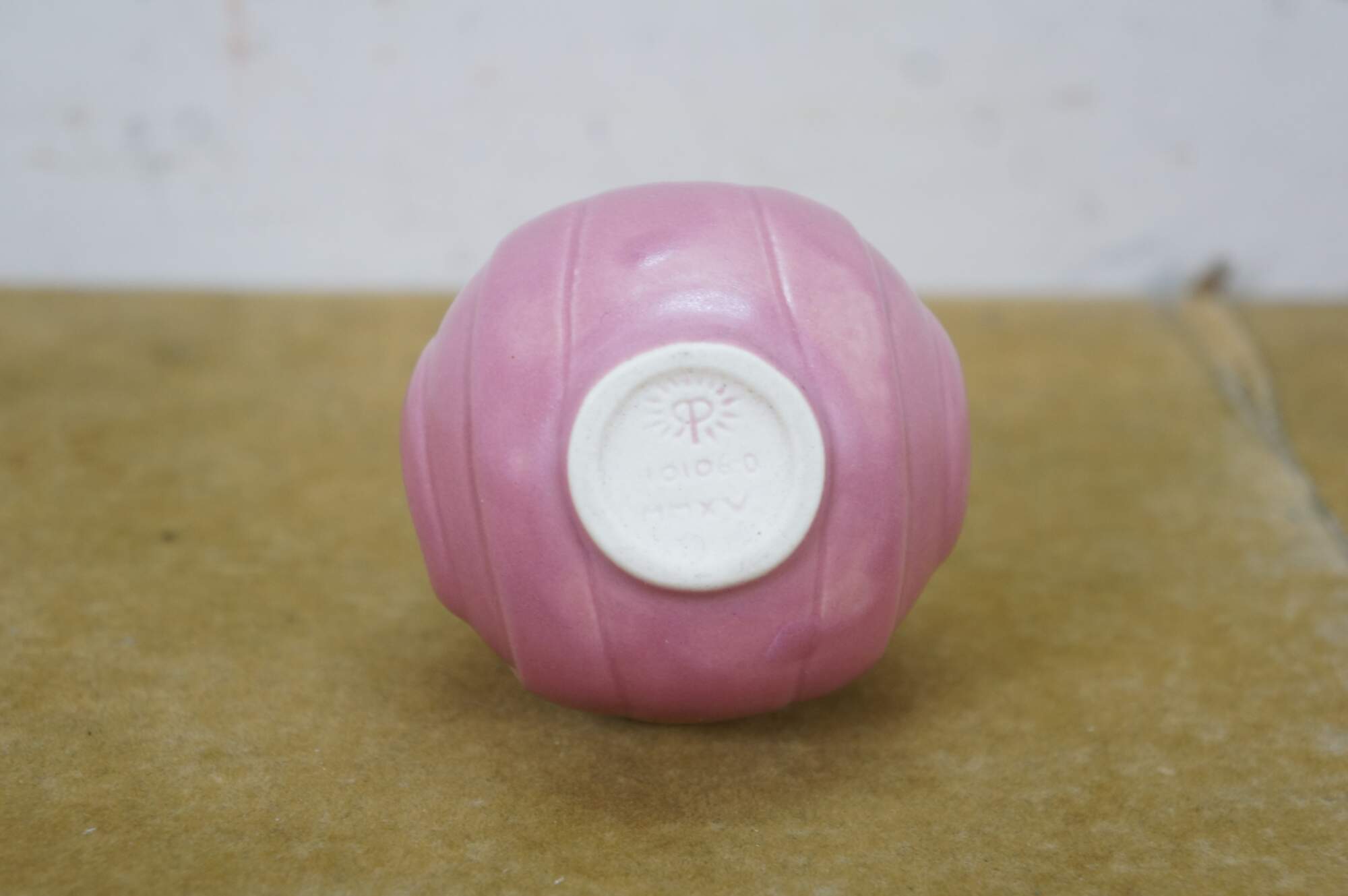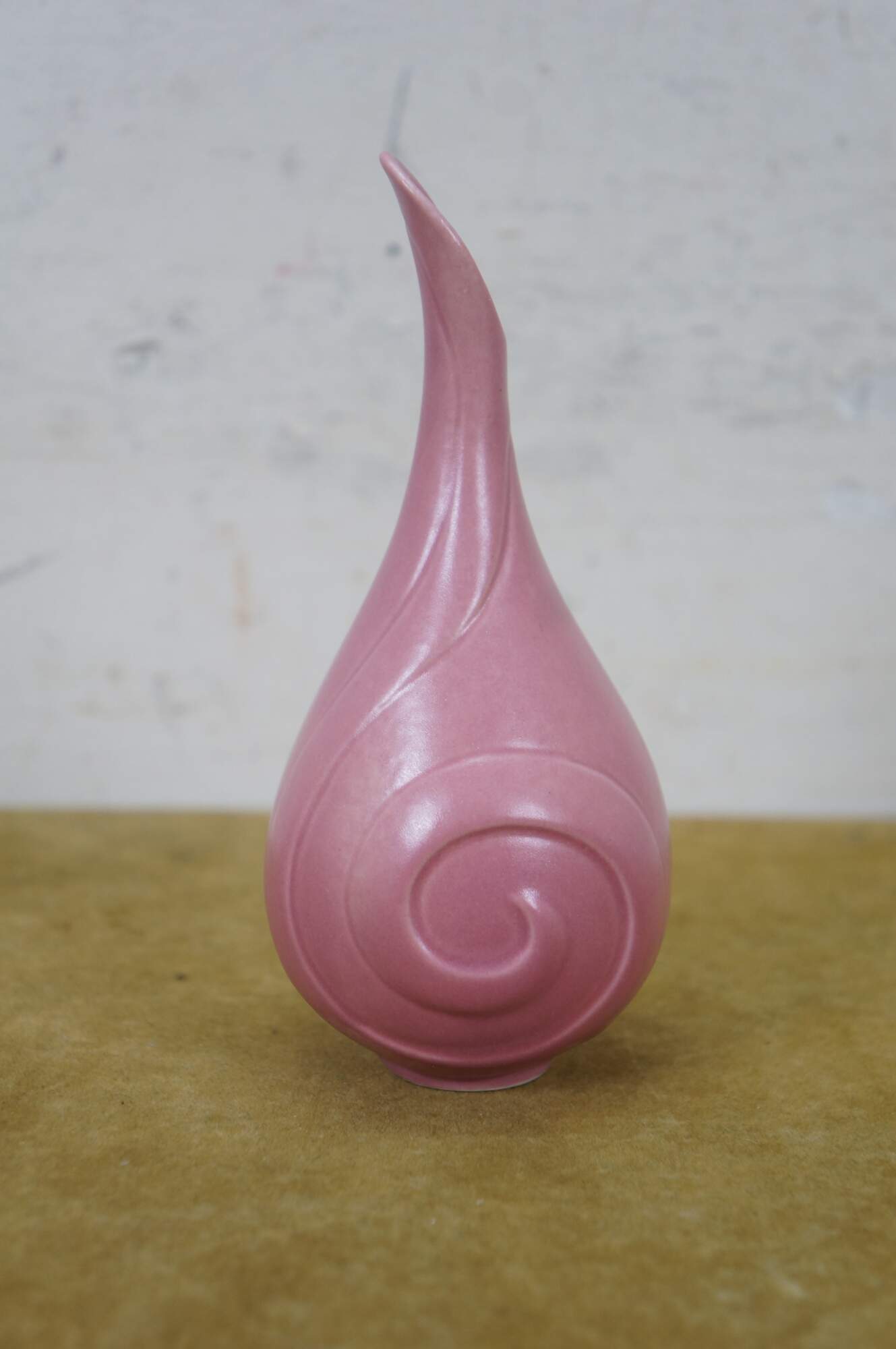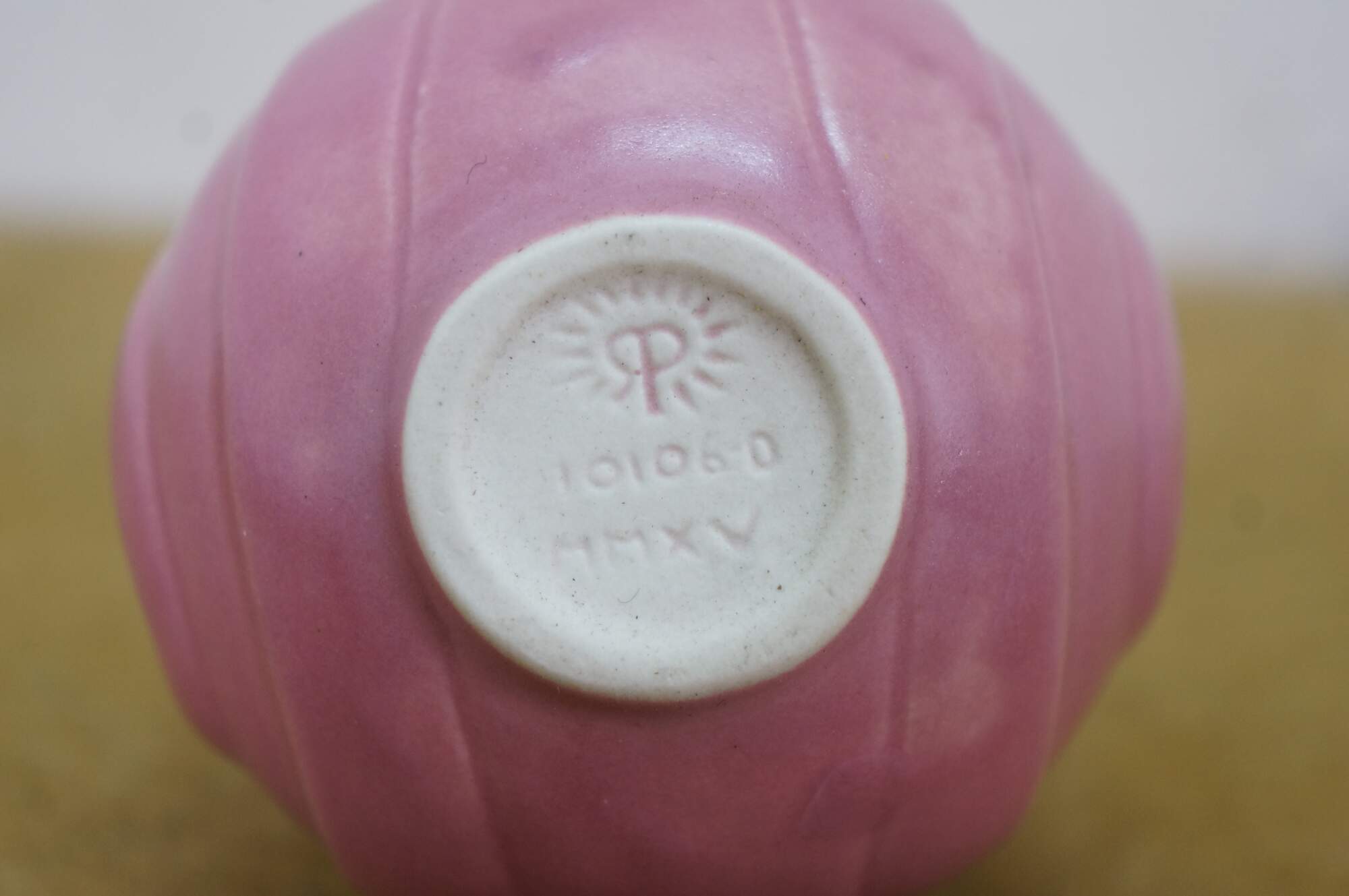 Early 21st century Rookwood Pottery bud vase - teardrop / bulb shaped vase with a soft pink glaze and a raised Art Deco inspired spiral / swirl design on the side. Marked 10106 D - MMXV (2015).