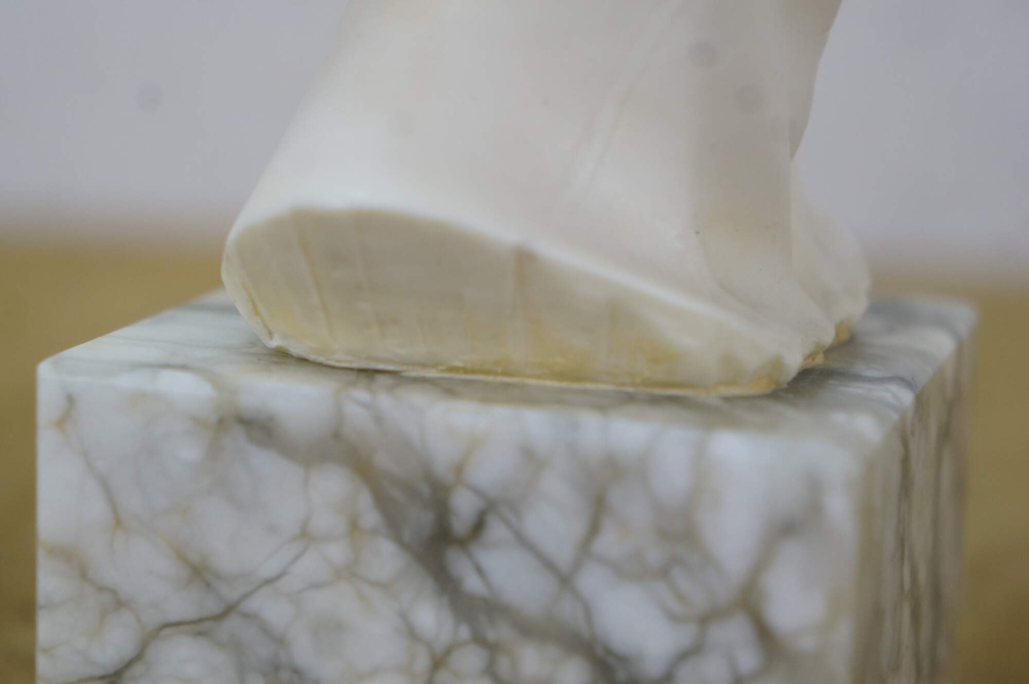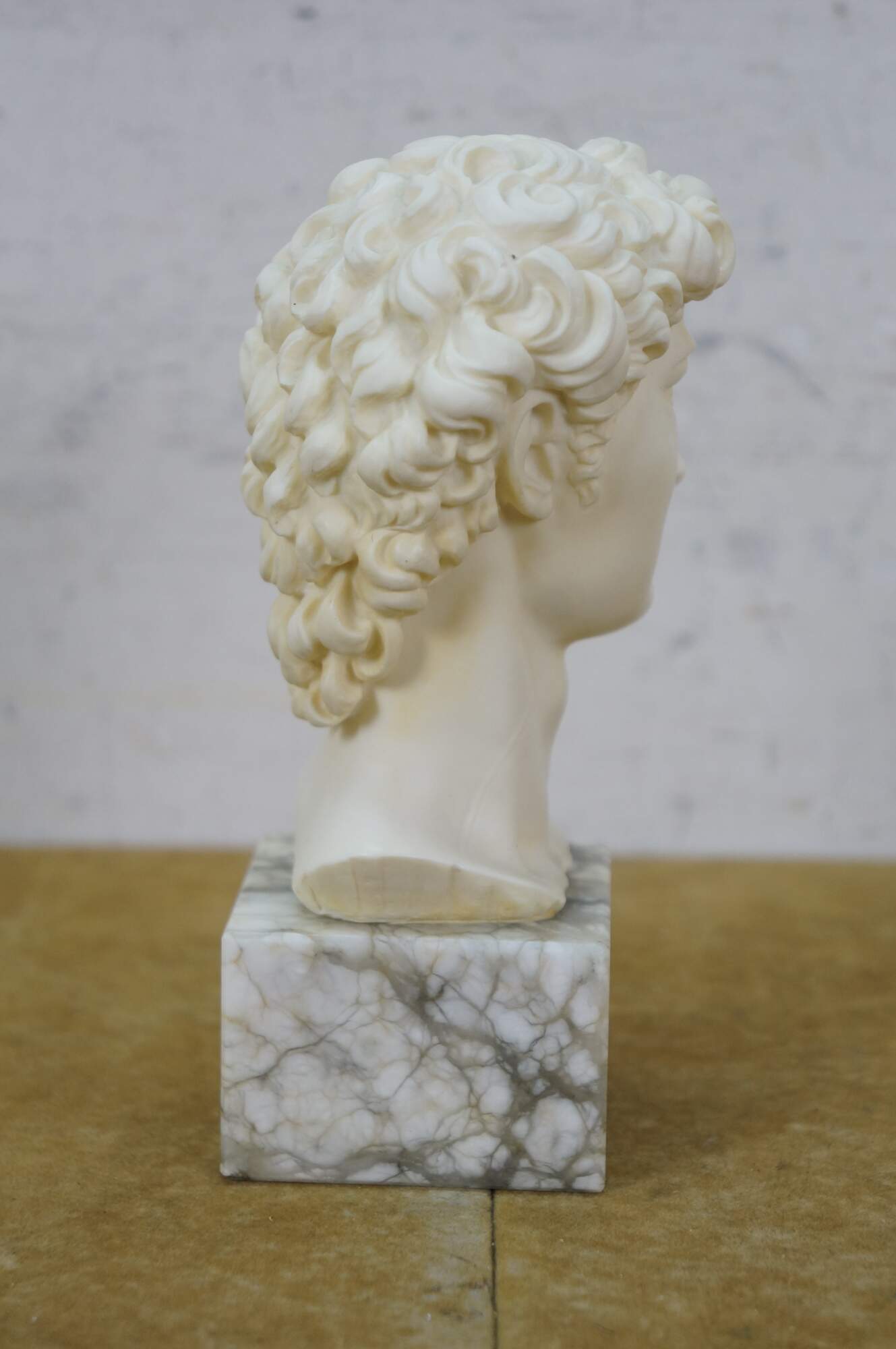 Late 20th century figurine / bust after the head of Michelangelo's David from Florence, Italy, as recreated by Arnaldo Giannelli (1907-2005). Resin, mounted on a white and beige marble plinth.