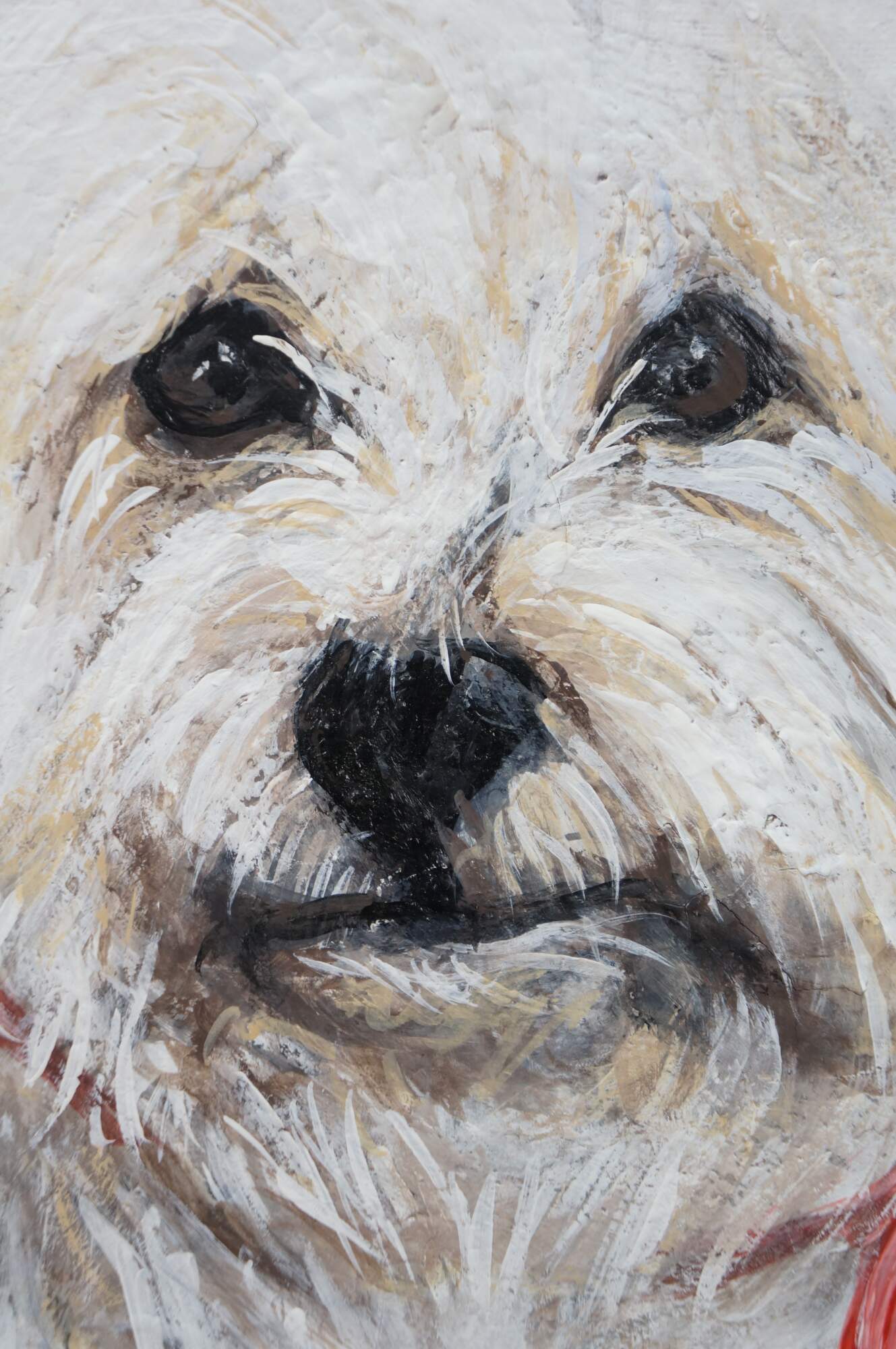 Late 20th century original oil on canvas painting depicting a white fluffy dog - likely a Maltese - wearing a pink ribbon. Beveled gilt frame.
