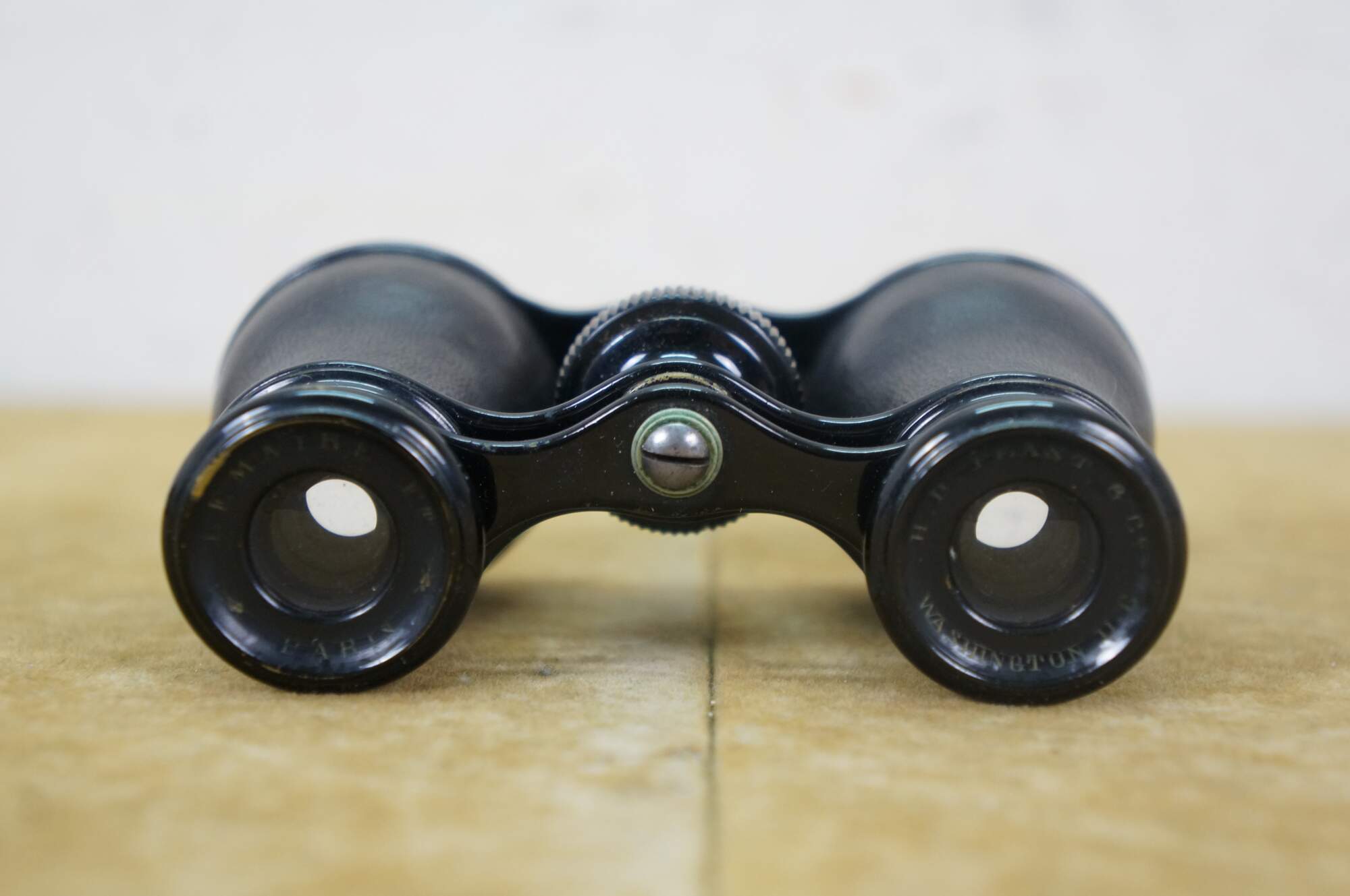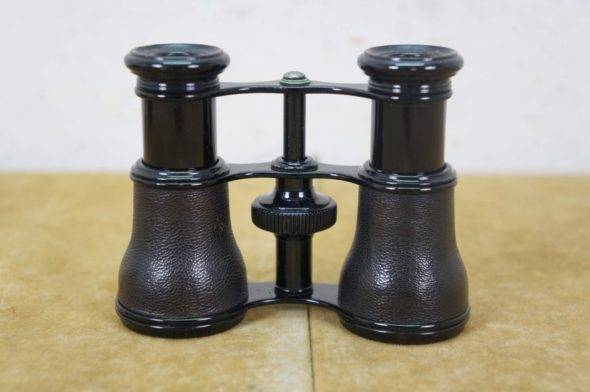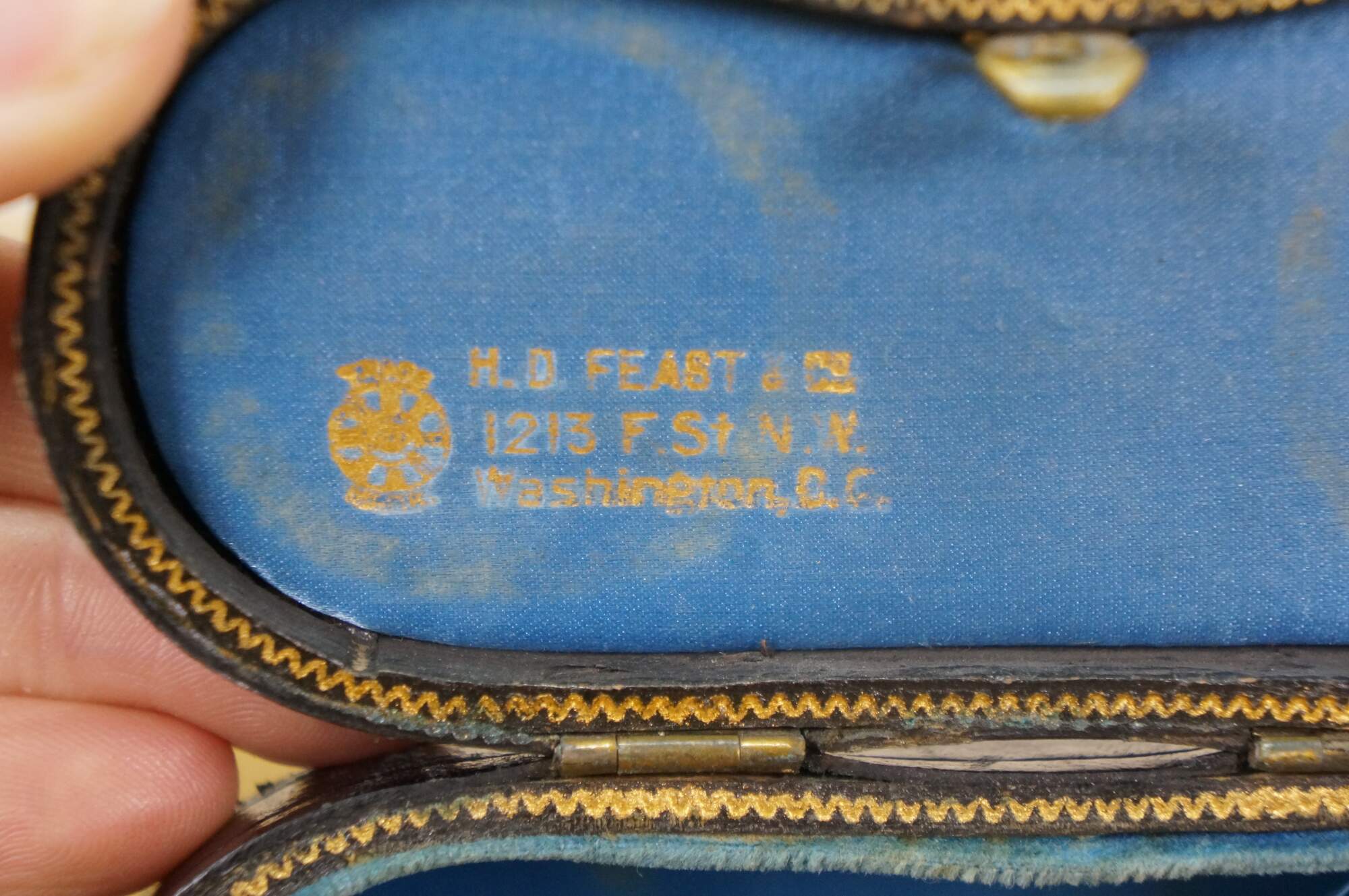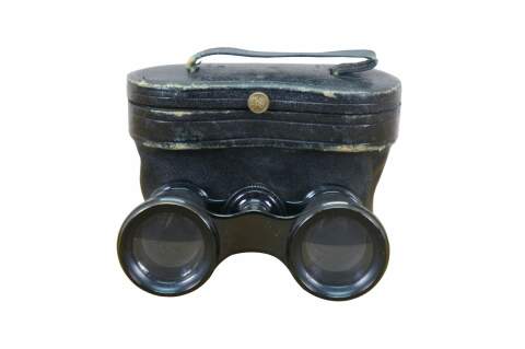 Circa late 19th century pair of Lemaire opera glasses / binoculars. Leather wrapped black enamel over brass. Sold by H.D. Feast and Co, Washington, DC. Includes black leather and silk lined case.
