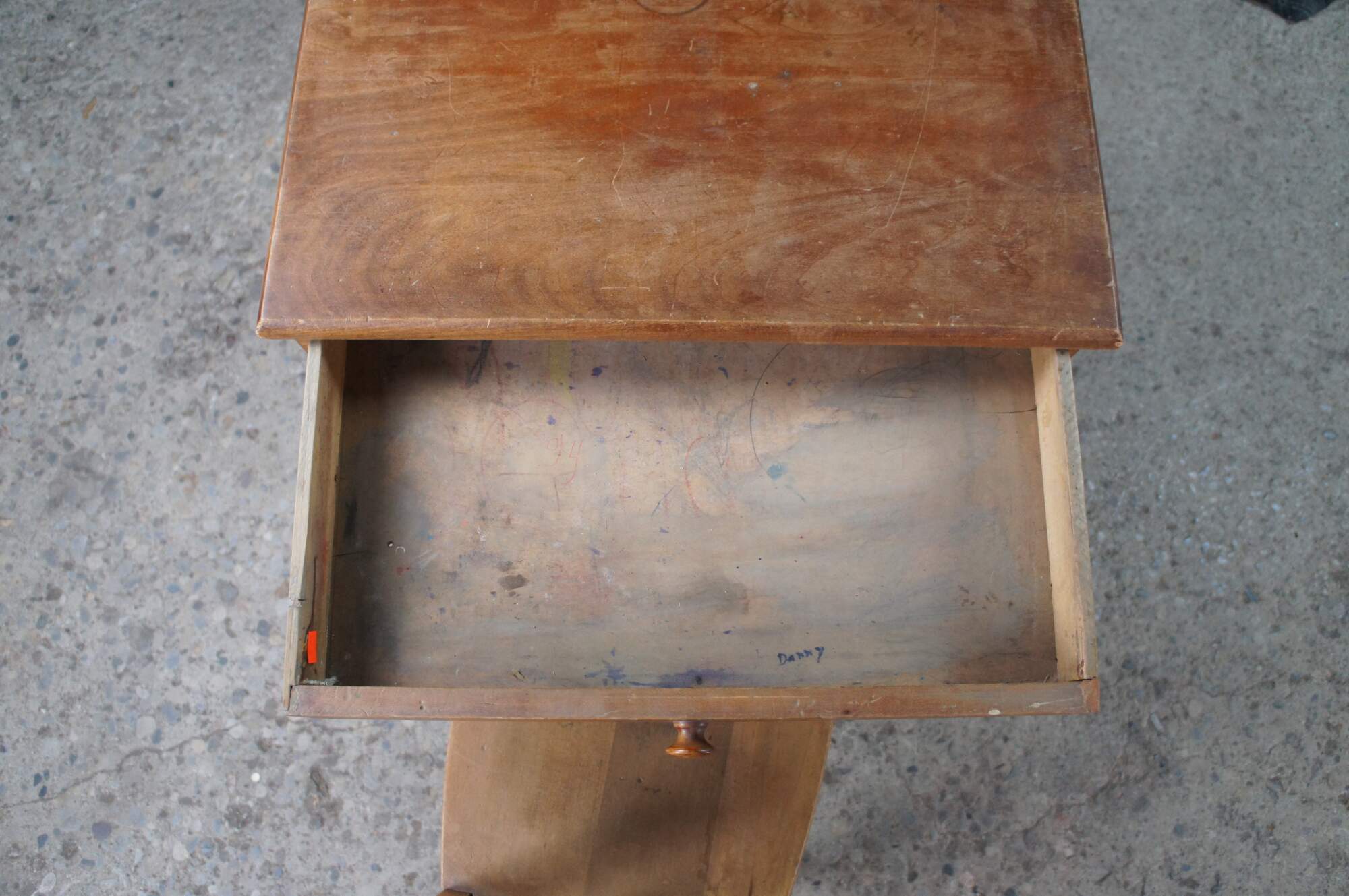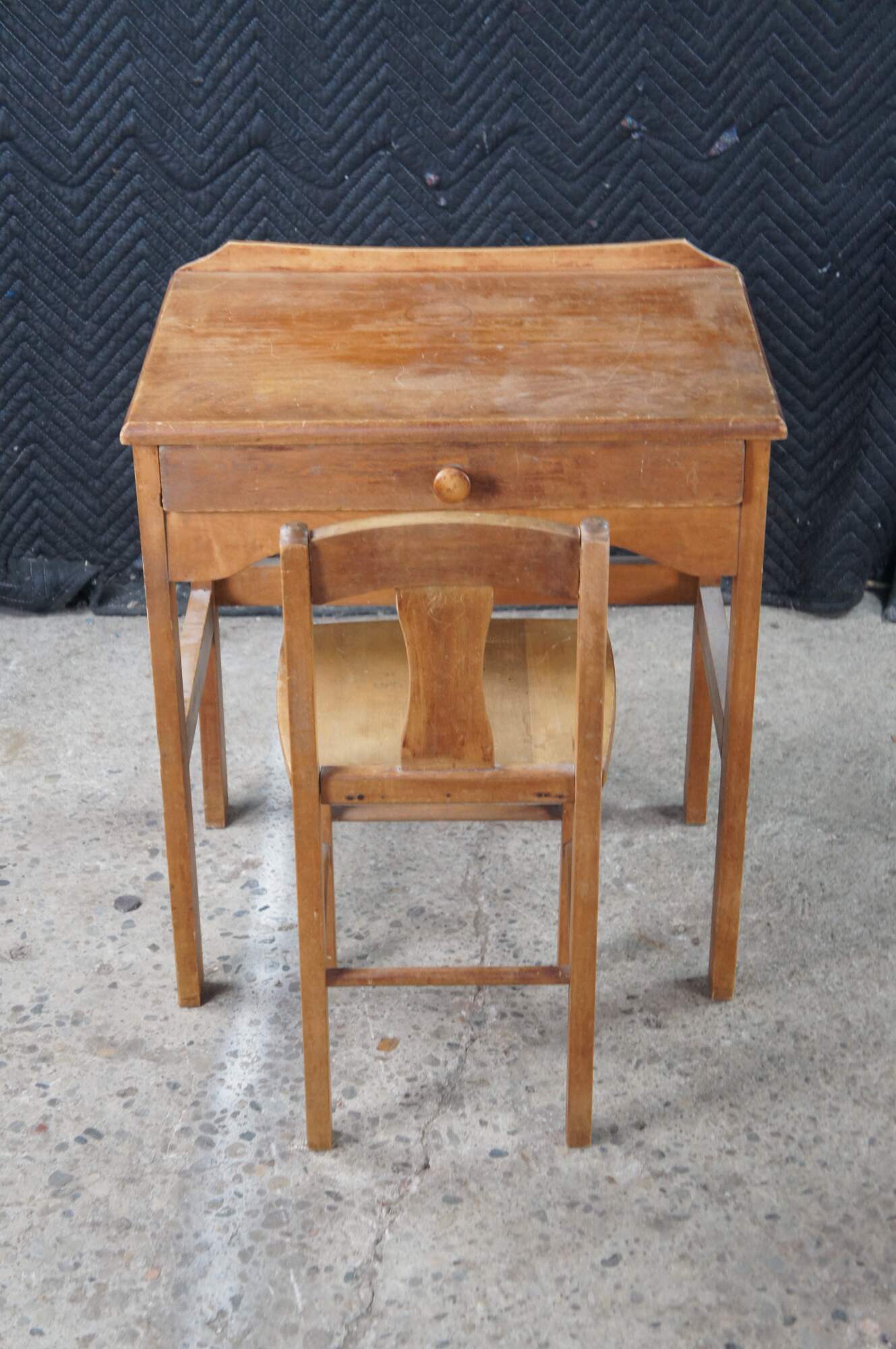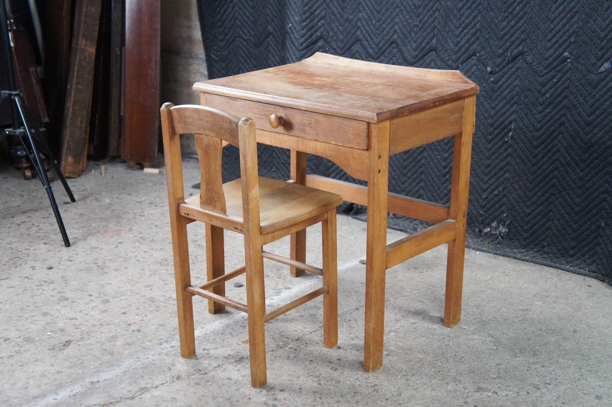 Mid 20th century childs size school desk and chair. Made from oak featuring one large drawer with turned knob.