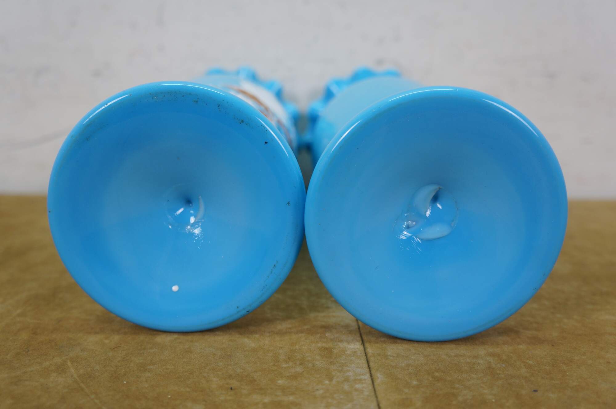 Pair of antique light blue clambroth glass vases. Handblown with pedestal bases and ruffled tops, hand painted on one side with sprigs of white daisies.