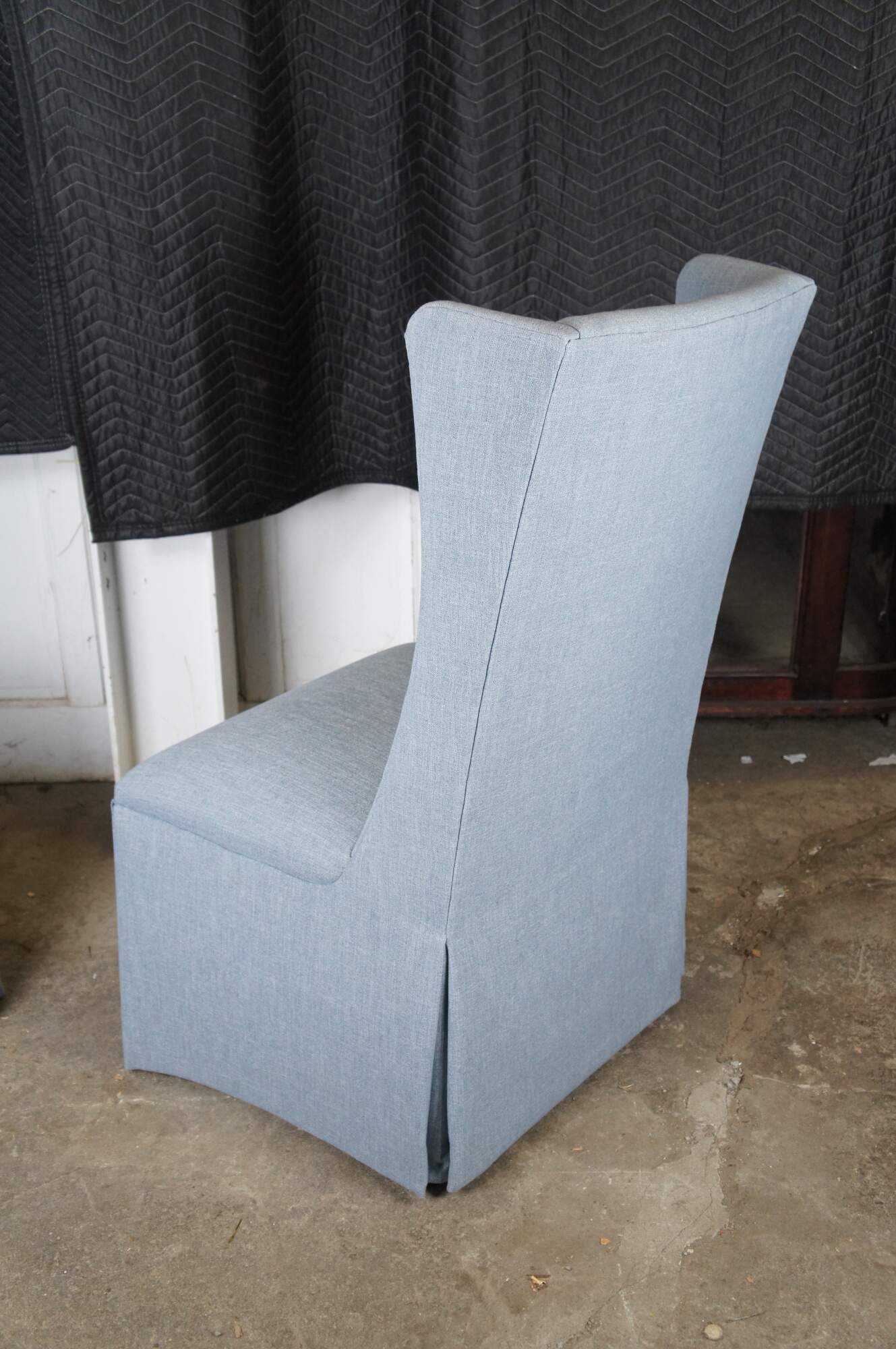 Features a highwingback over padded seat and skirted base. Upholstered in light blue. Made in America. MSRP $2,041.80 / per chair.
