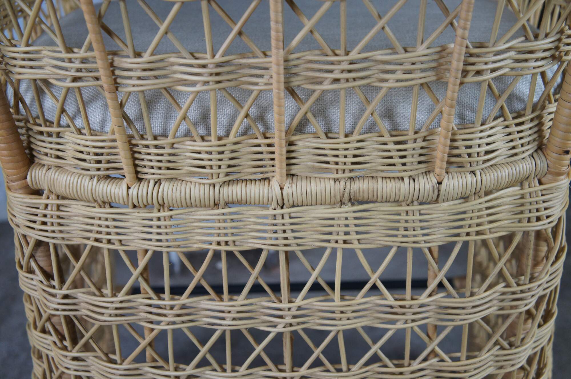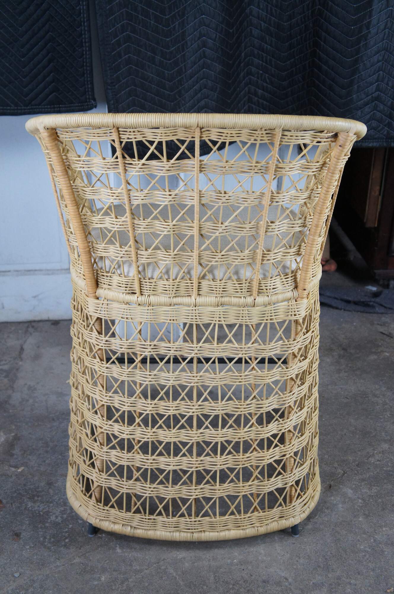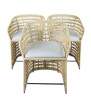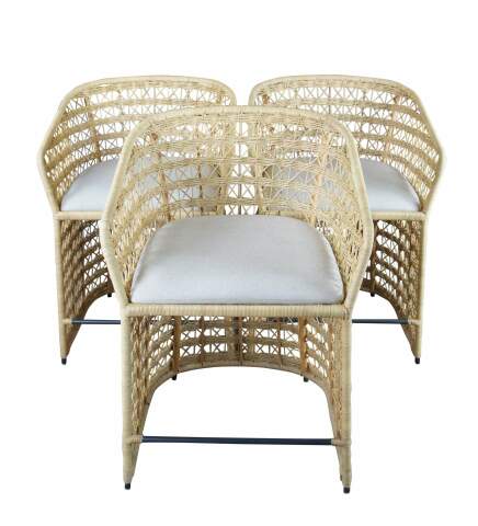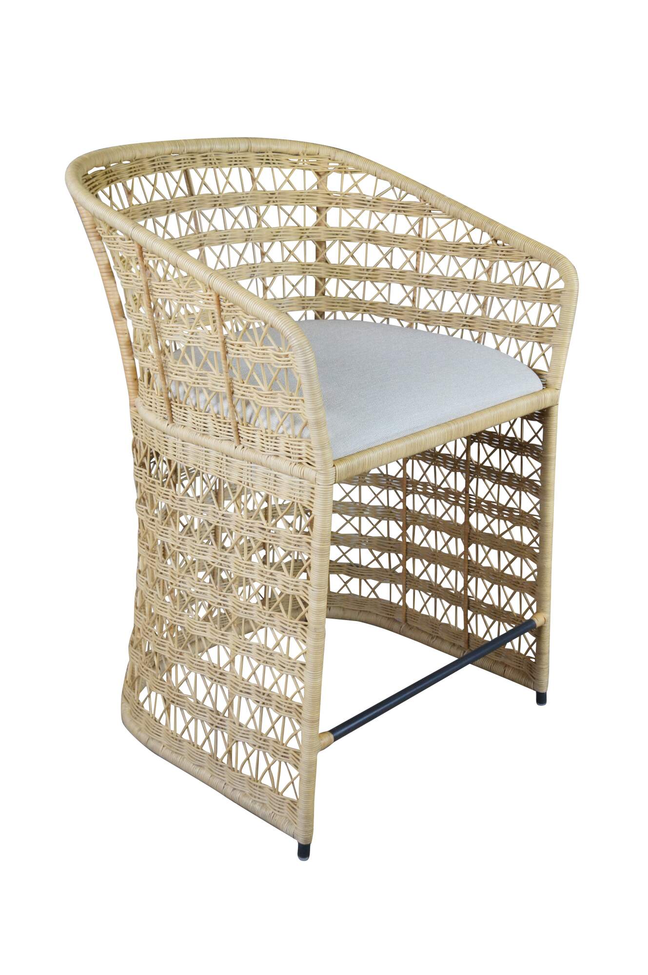 3 Gabby Libby Natural Rattan Counter Height Bar Stools. Features a Modern Boho Chic design with barrel back and sloped arms. Made from natural rattan with dark gray metal footrest. Seat is linen. MSRP $1199/chair
