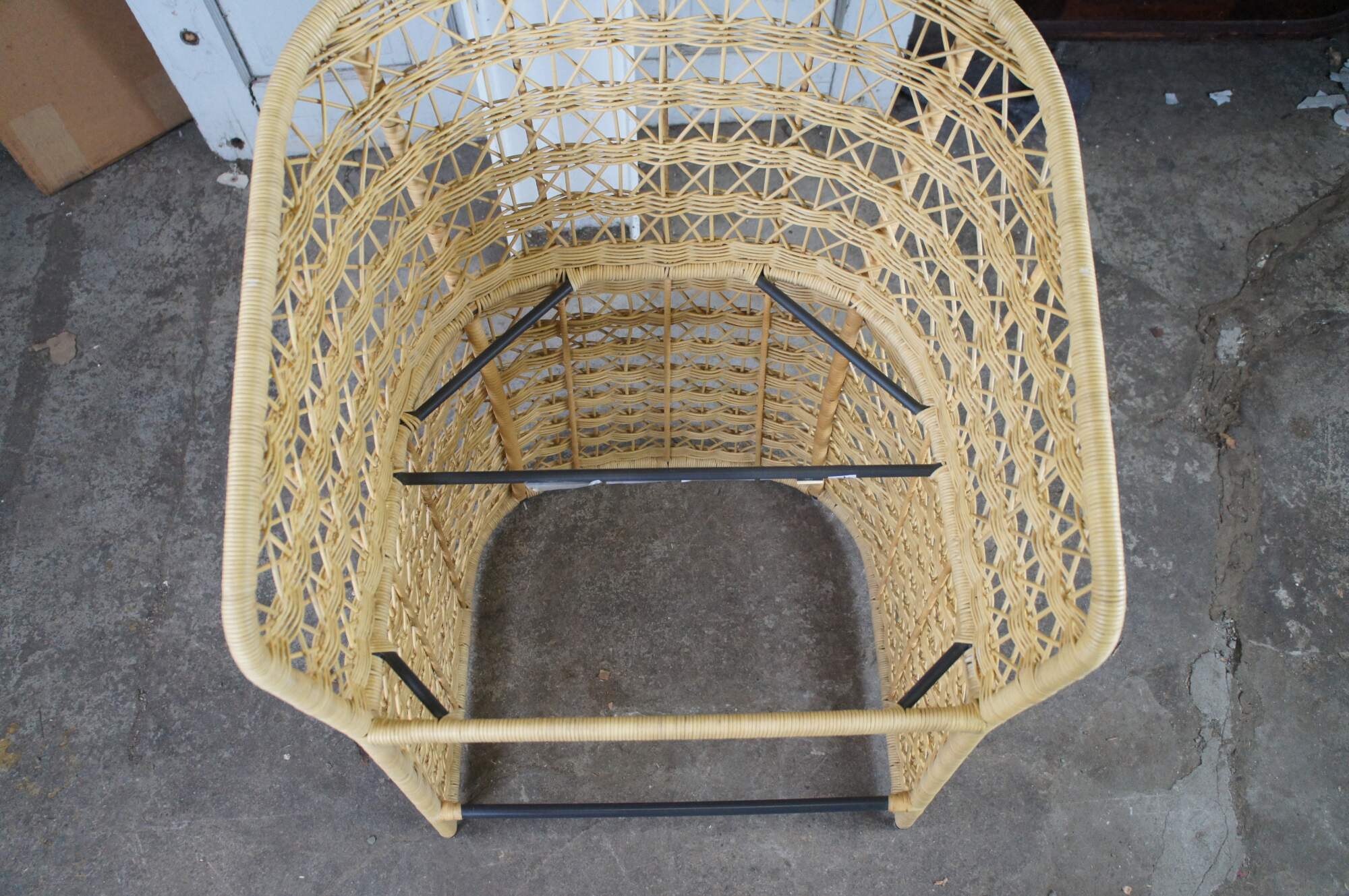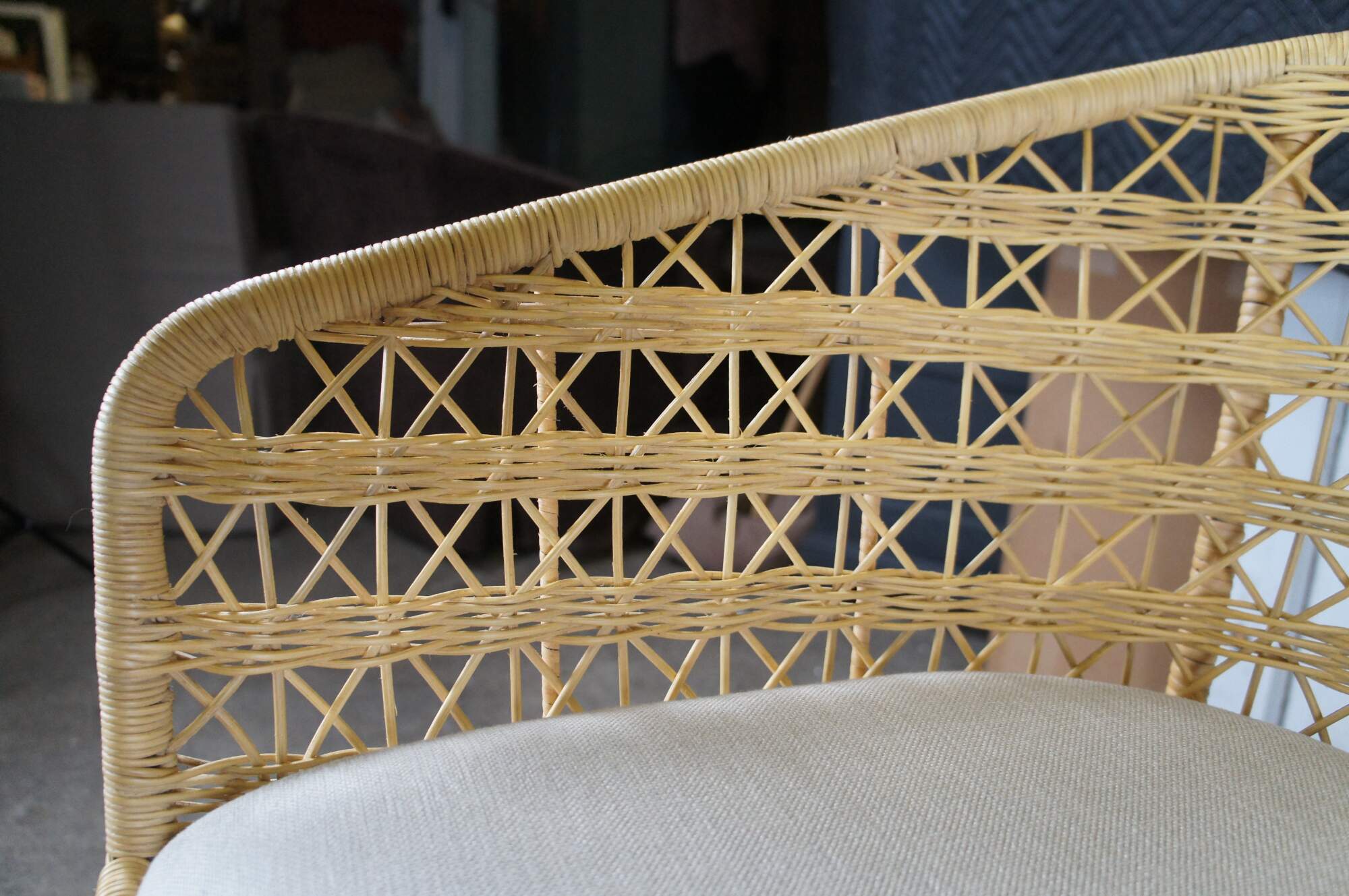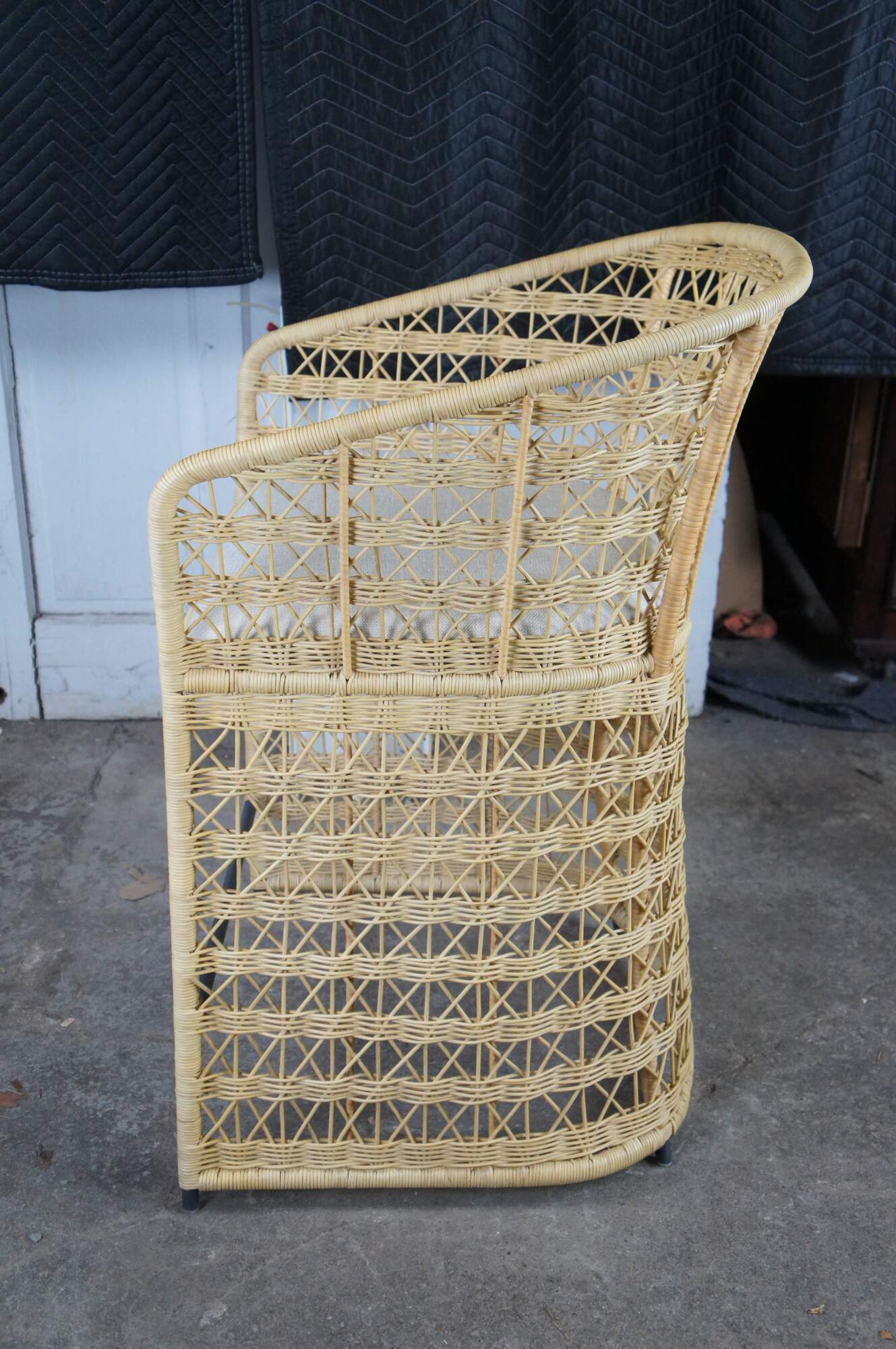 3 Gabby Libby Natural Rattan Counter Height Bar Stools. Features a Modern Boho Chic design with barrel back and sloped arms. Made from natural rattan with dark gray metal footrest. Seat is linen. MSRP $1199/chair
