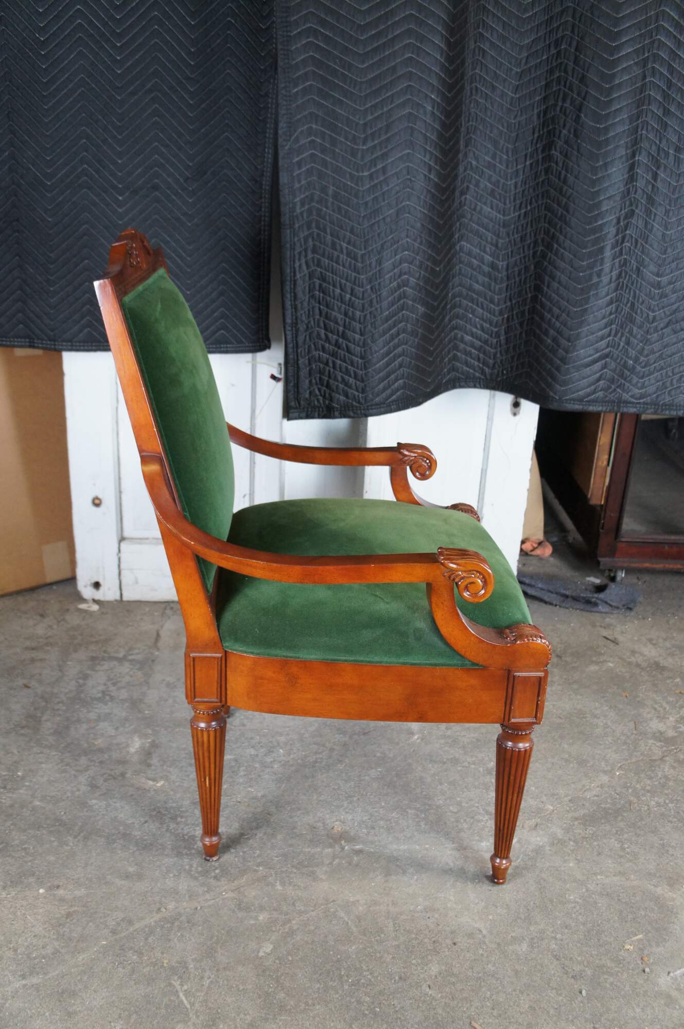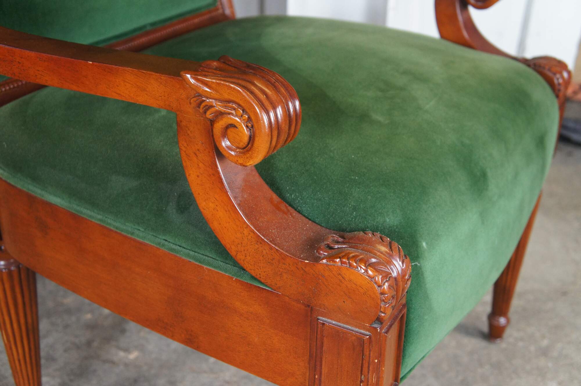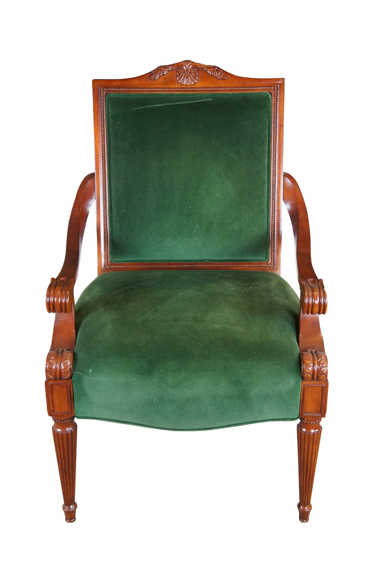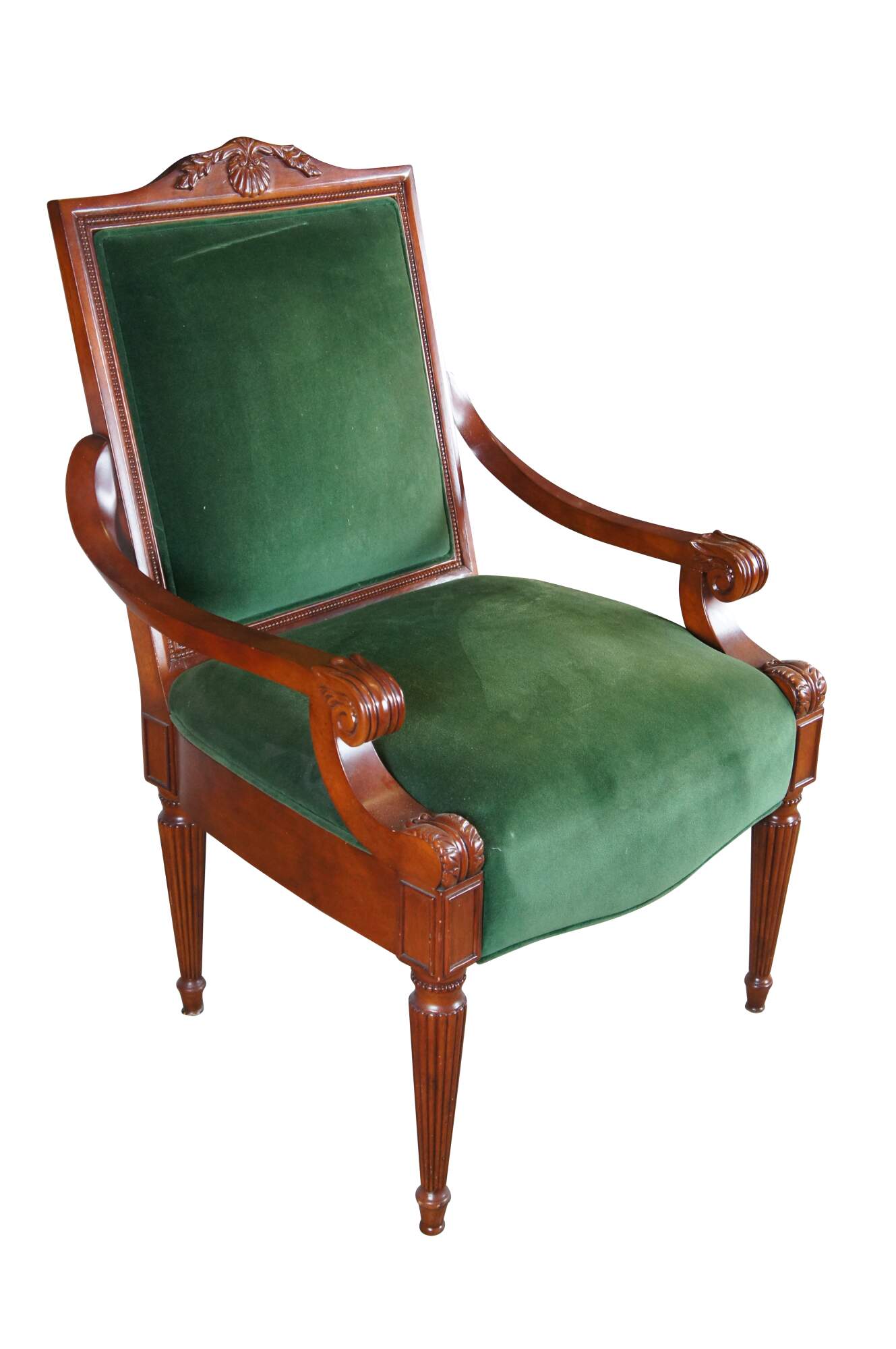 Late 20th Century French Empire Style Upholstered Arm Chair. Made from birch with a high back featuring a scalloped crest rail, green velvet upholstery and downswept scrolled acanthus carved arms. The legs are reeded and tapered leading to arrow feet.