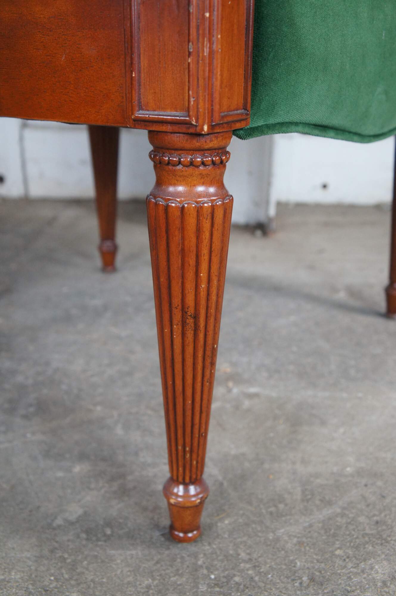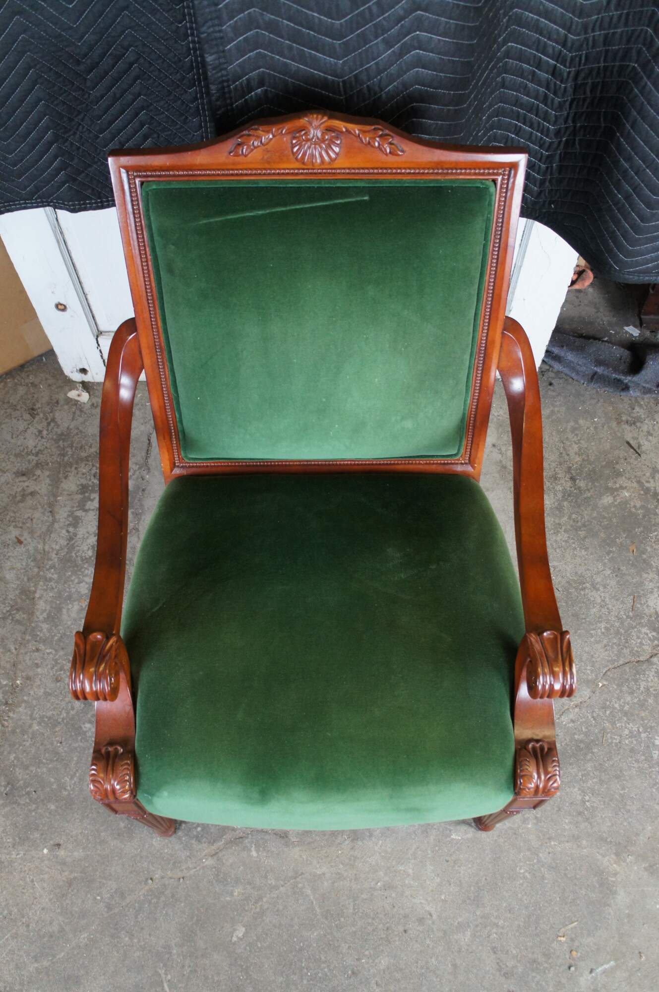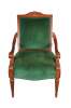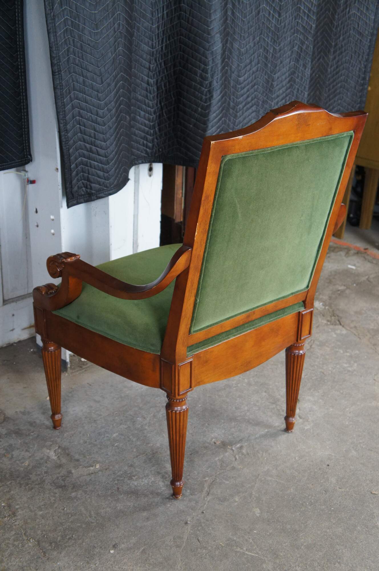 Late 20th Century French Empire Style Upholstered Arm Chair. Made from birch with a high back featuring a scalloped crest rail, green velvet upholstery and downswept scrolled acanthus carved arms. The legs are reeded and tapered leading to arrow feet.