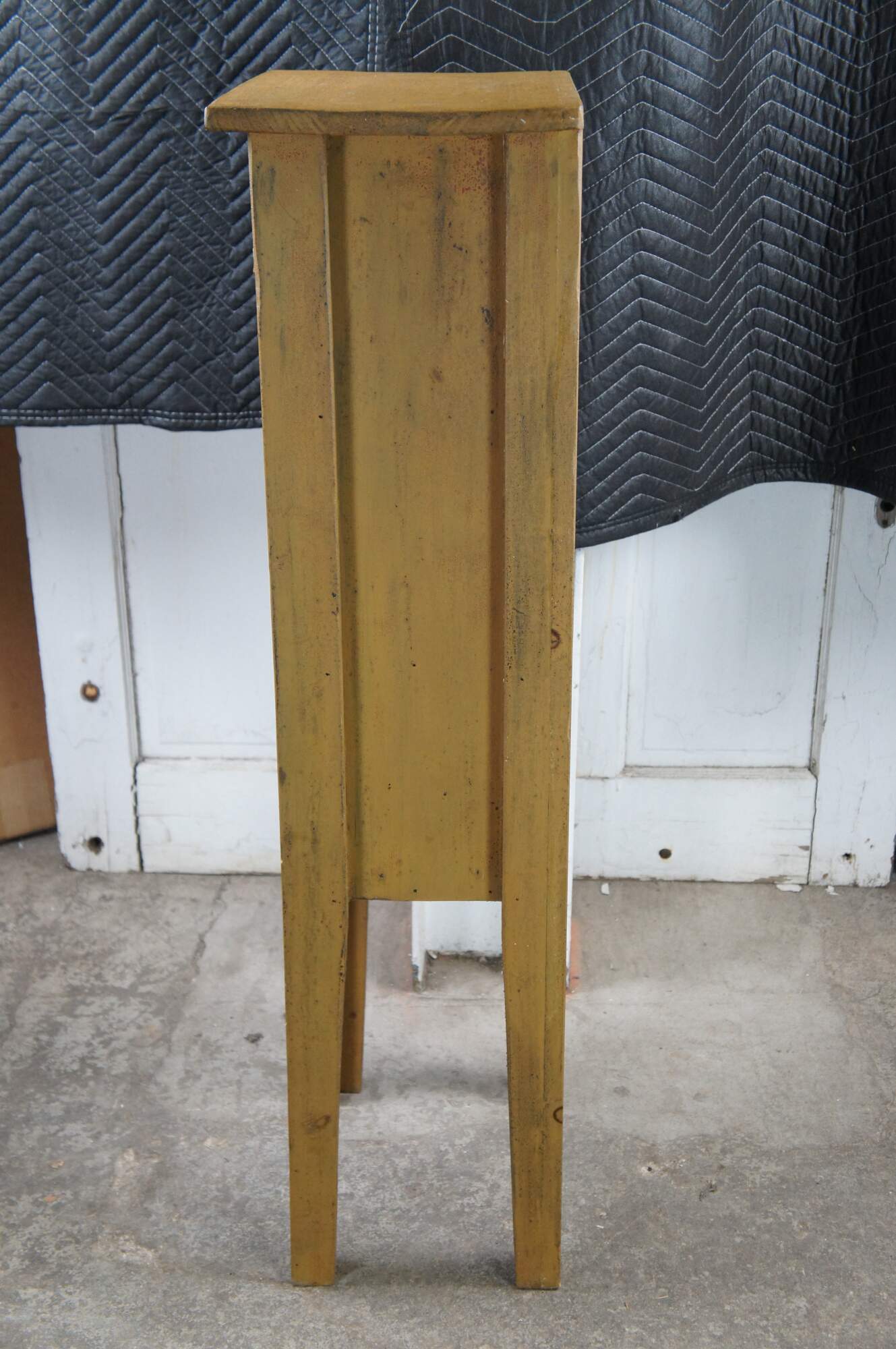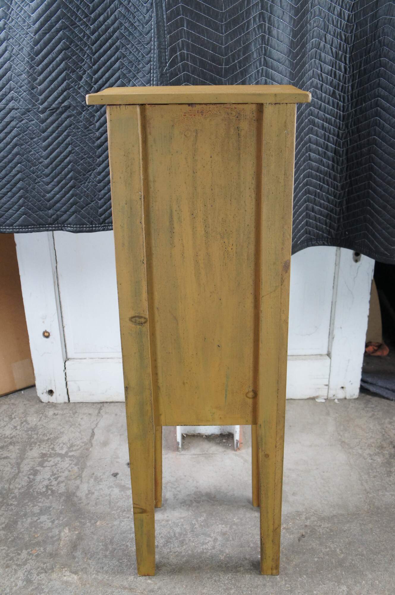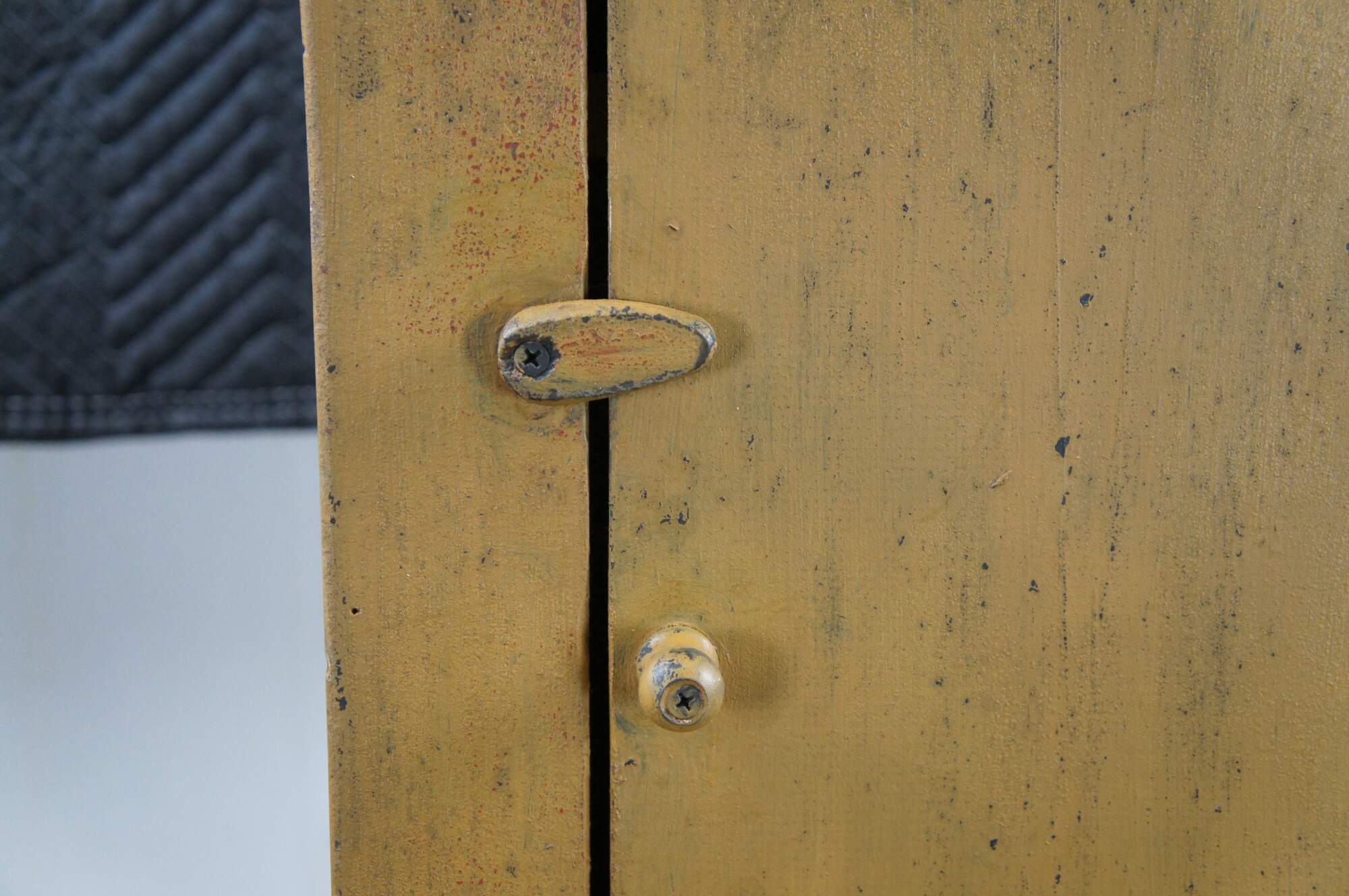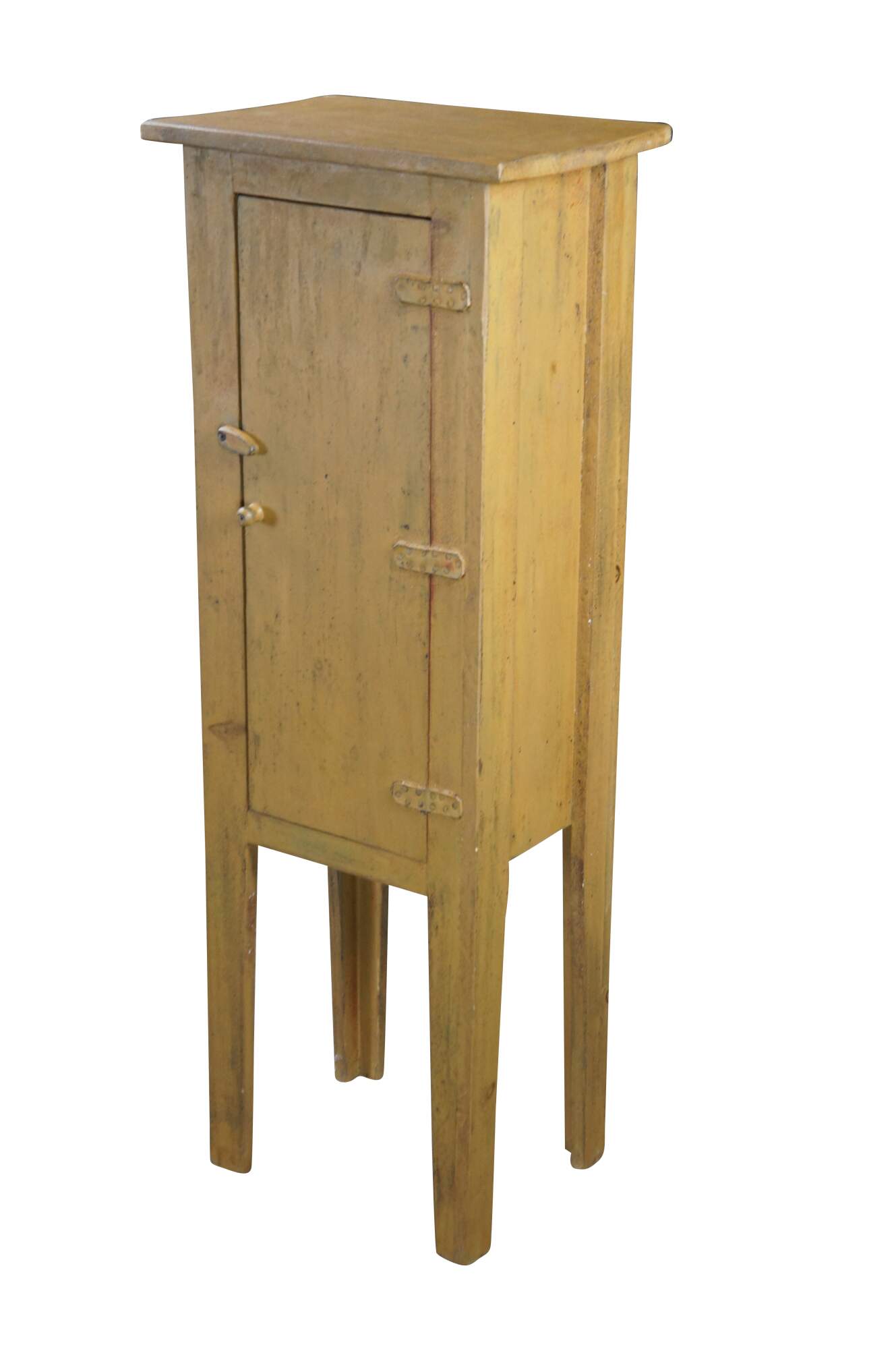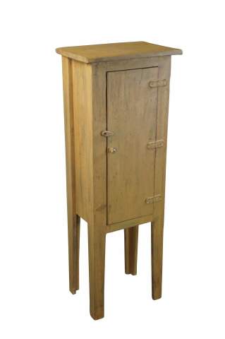 A neat rustic linen cabinet. Made from Pine with a painted finish. Features 2 fixed interior shelves, leather hinges and a latch along the door.