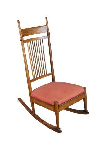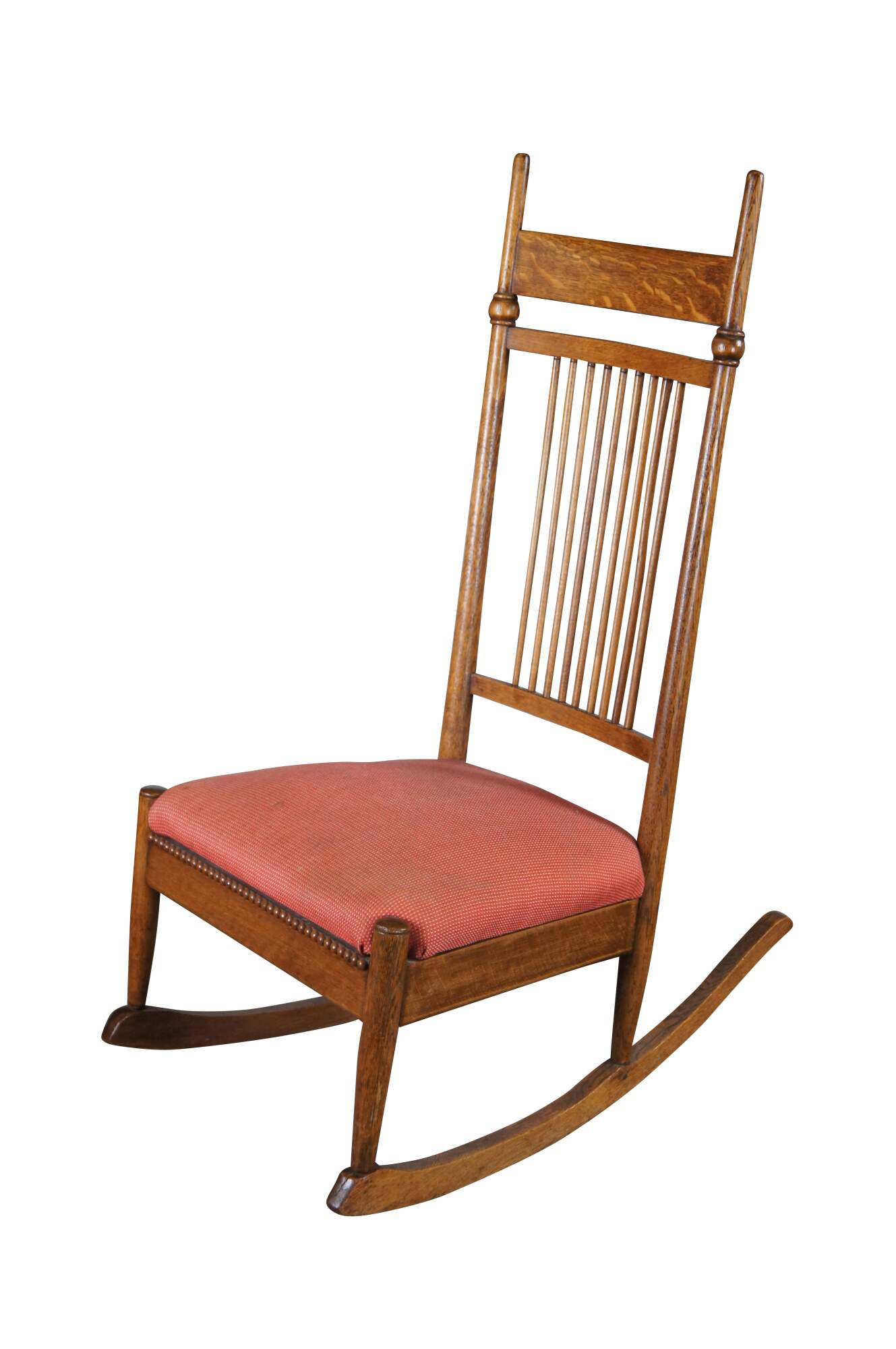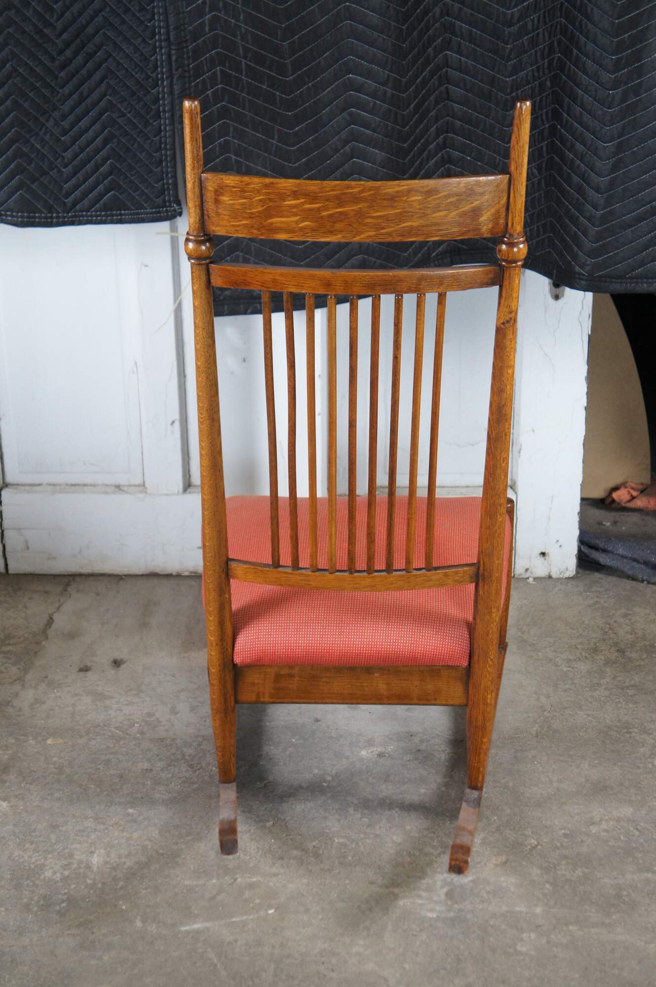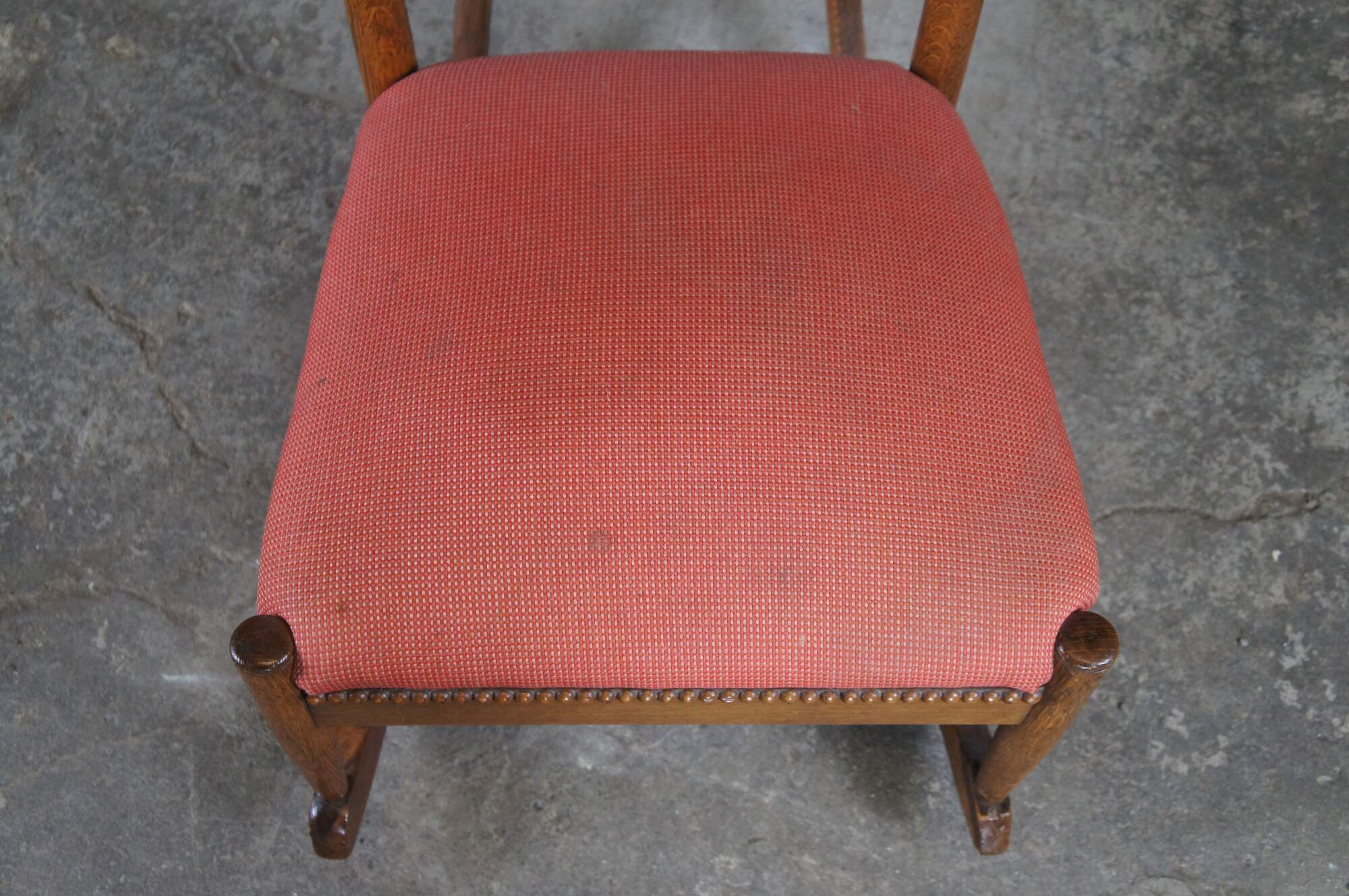 Antique Victorian Aesthetic Movement E.W. Godwin-Style Rocking / Nursing Chair, circa 1870s. Features a quartersawn oak frame with spindled back, beaded accents and a red upholstered seat.