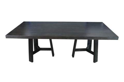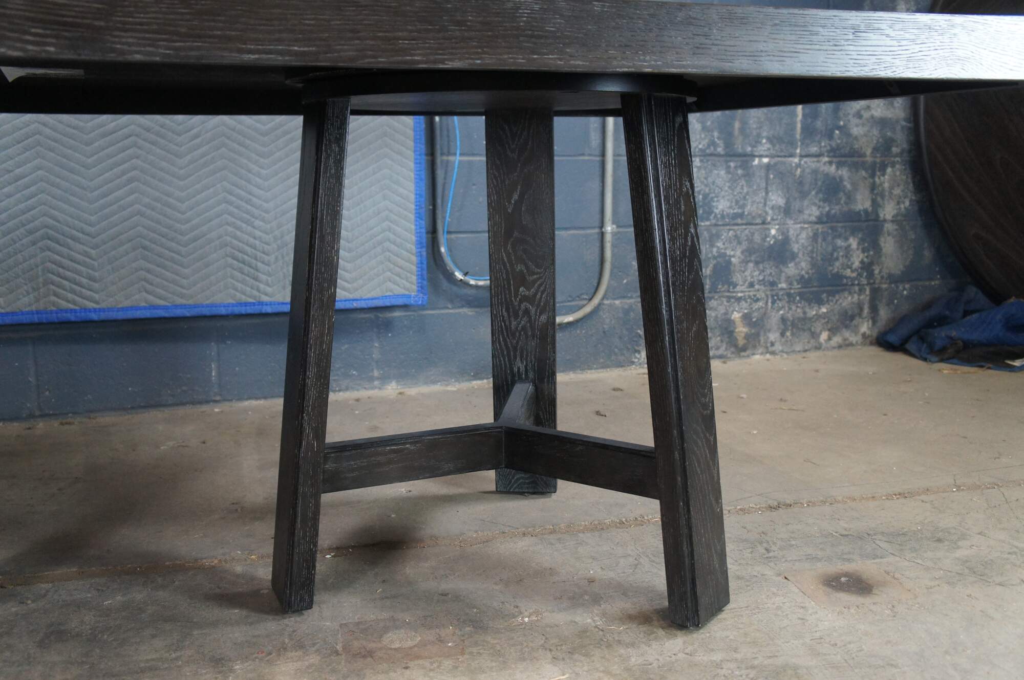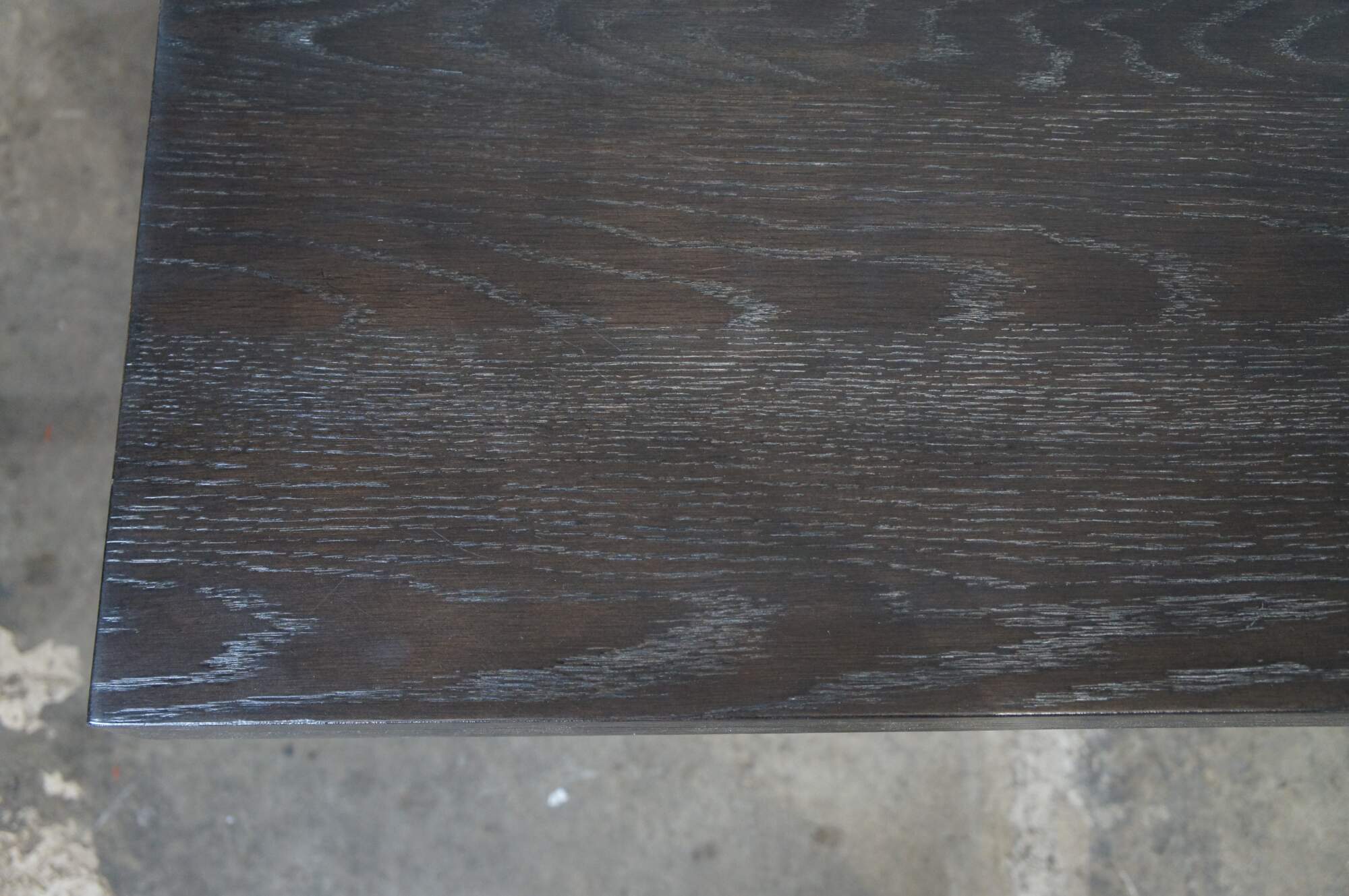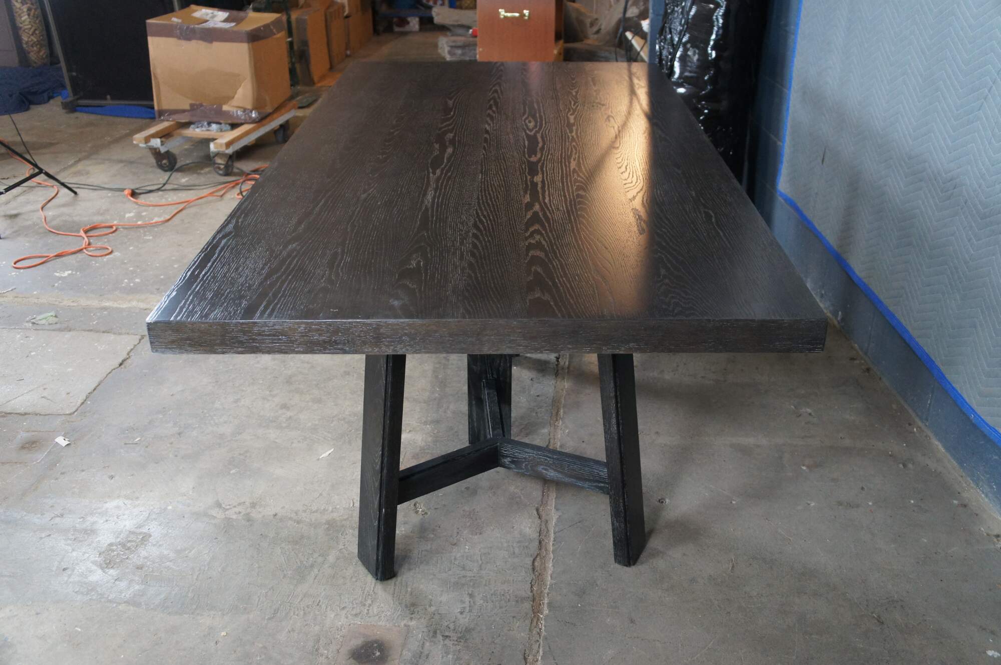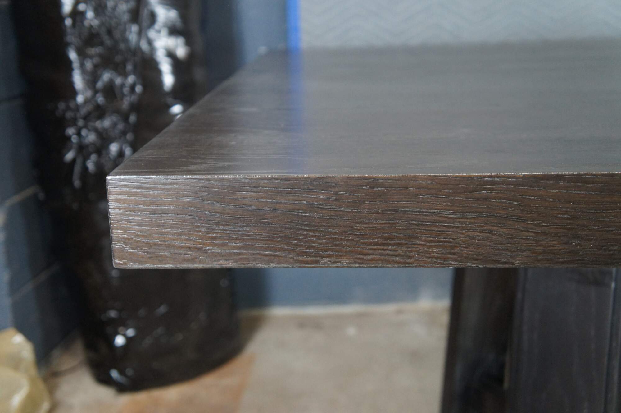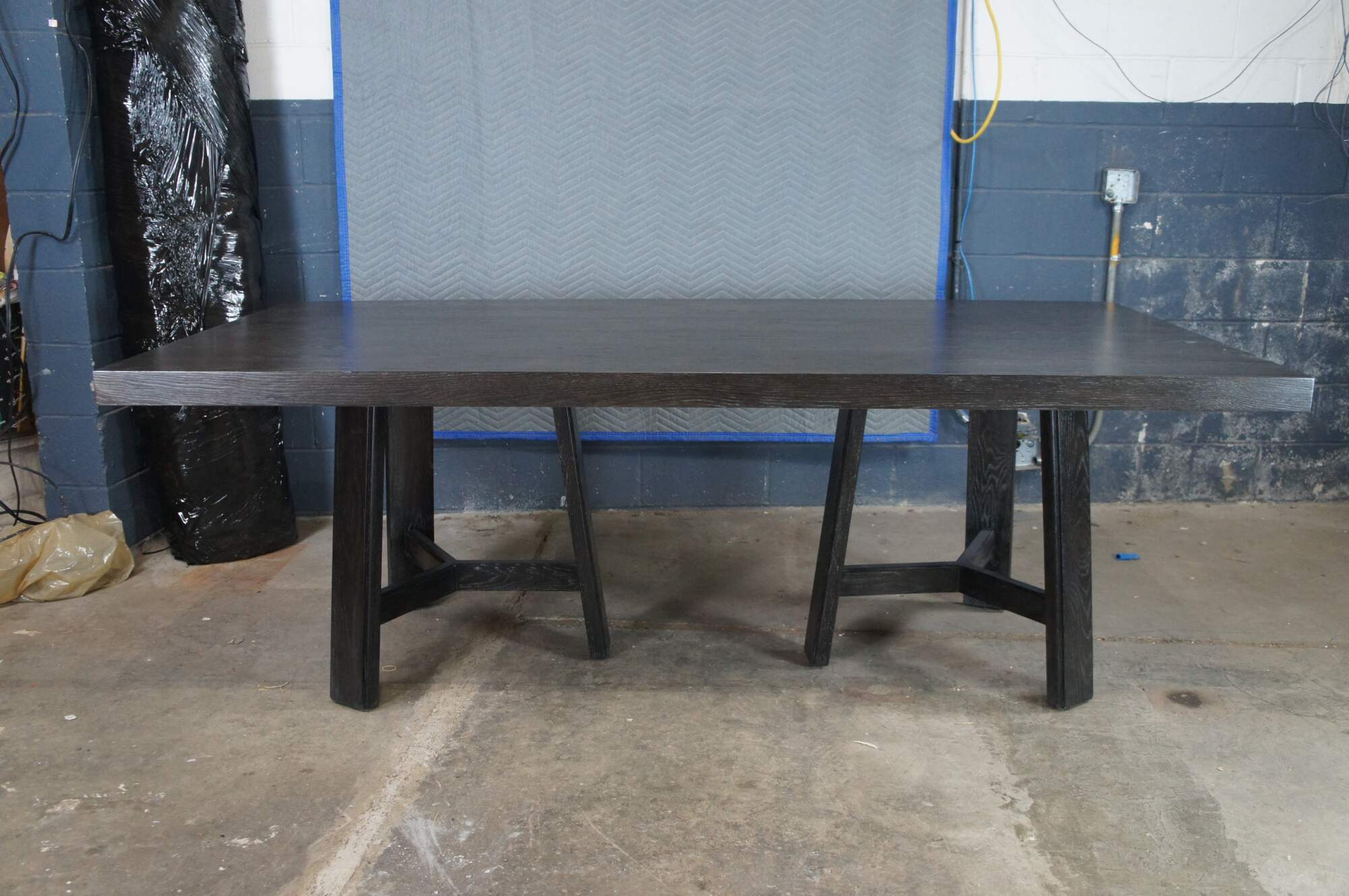 Bernhardt Colworth Rectangular Dining Table #375-264, Circa 2018. Features a rectangular form made from oak with double pedestal tripod bases. The table is designed in a rustic modern styling with a black truffle finish.