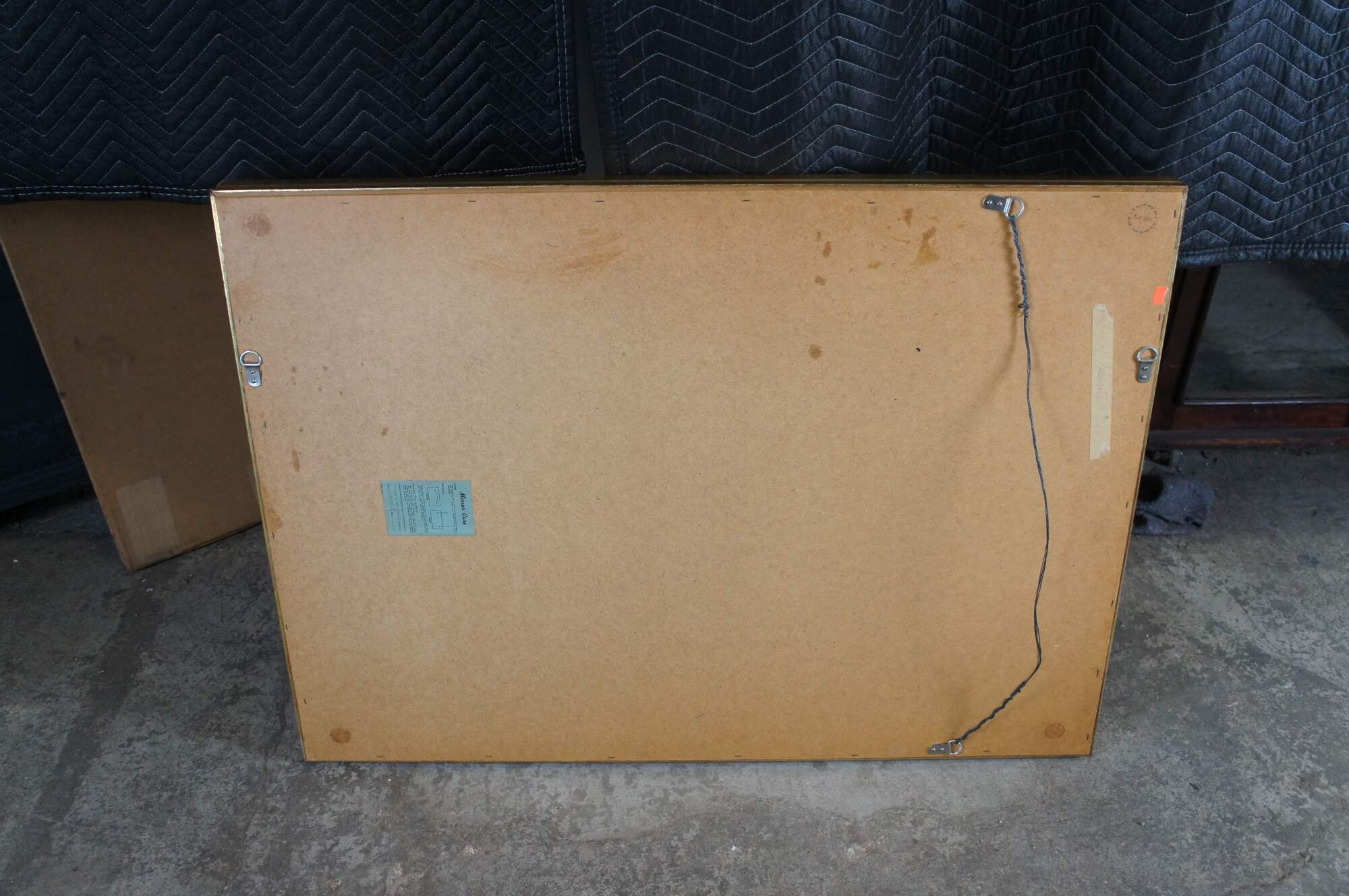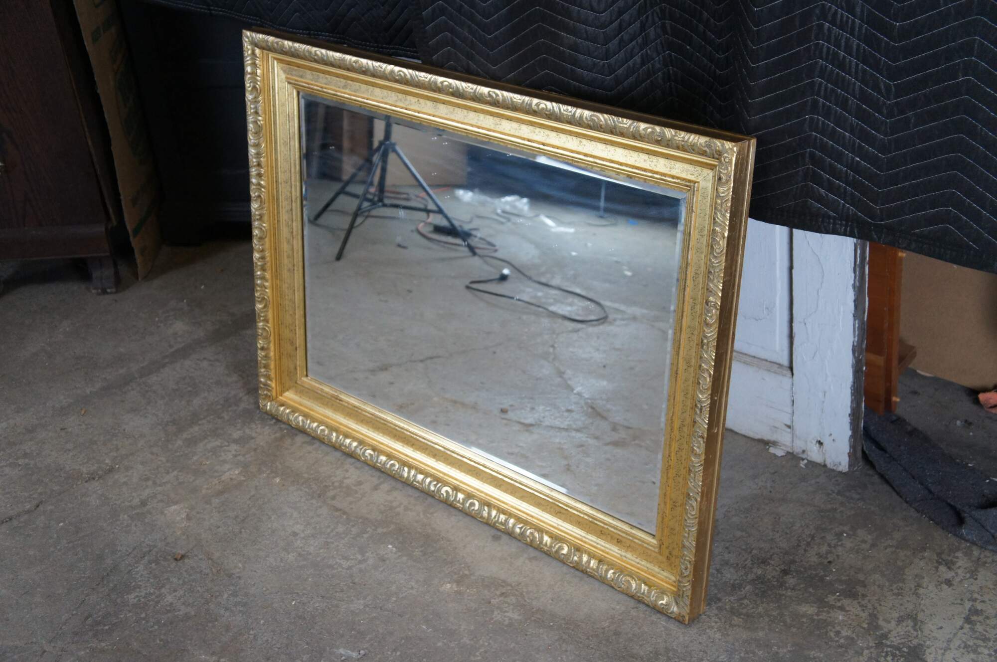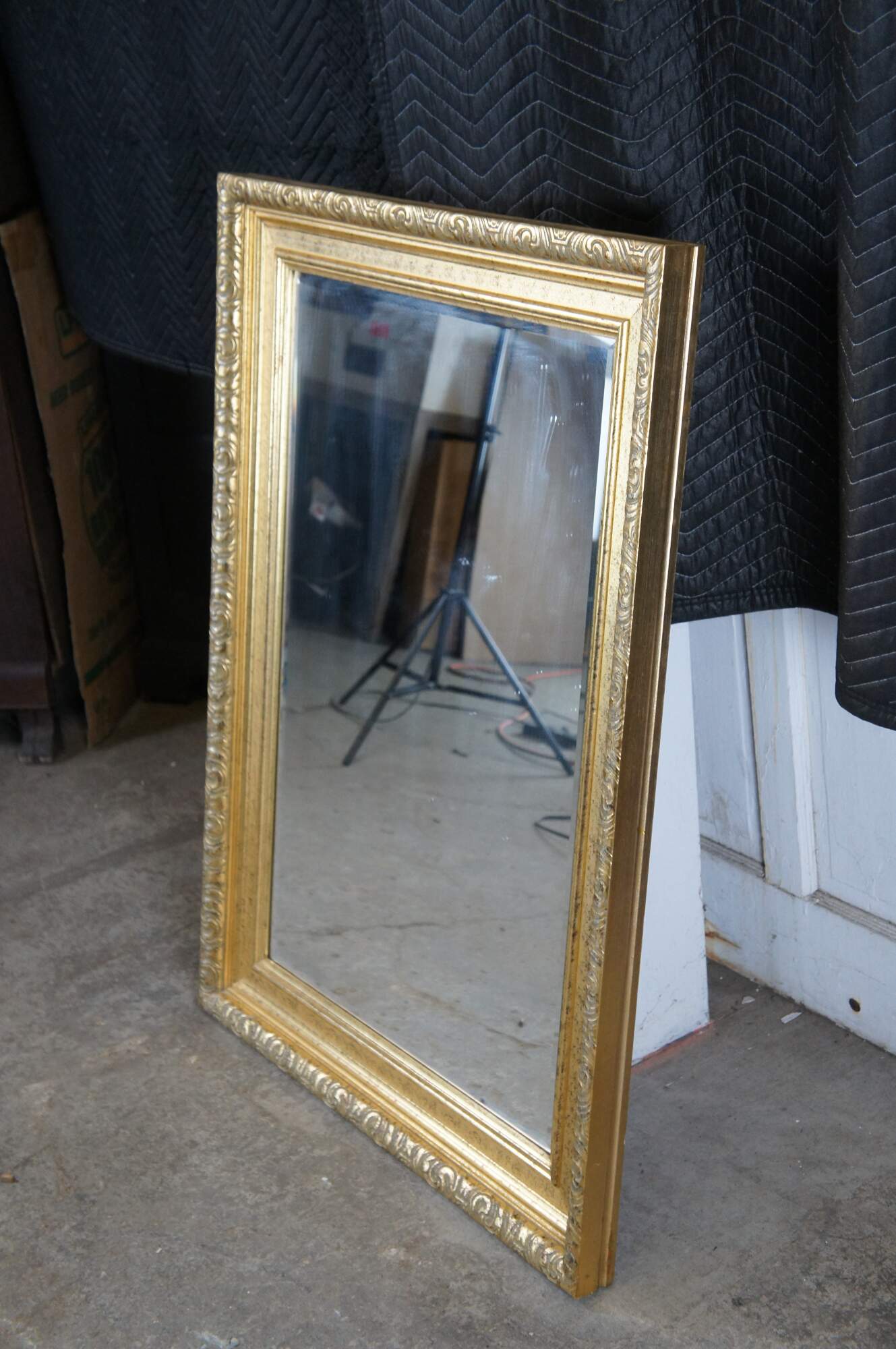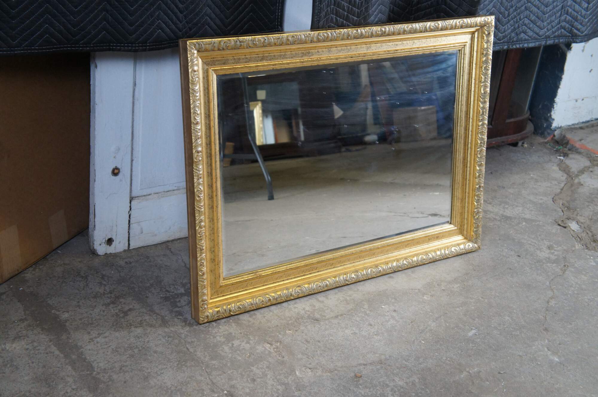 1980s Hollywood Regency style wall hanging mirror. Features a scrolling foliate carved frame with beveled glass.