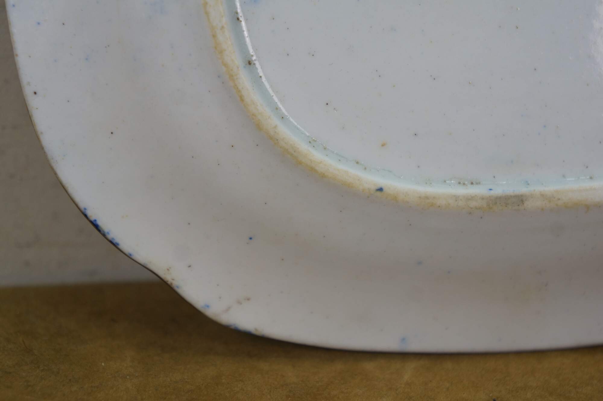 Small late 19th to early 20th century Chinese Export porcelain platter / plate - rectangular in shape with rounded corners and gilt detail at the edge, decorated with a Blue Willow style lands and water scape with pagoda roofs, sail boat, and bridge.